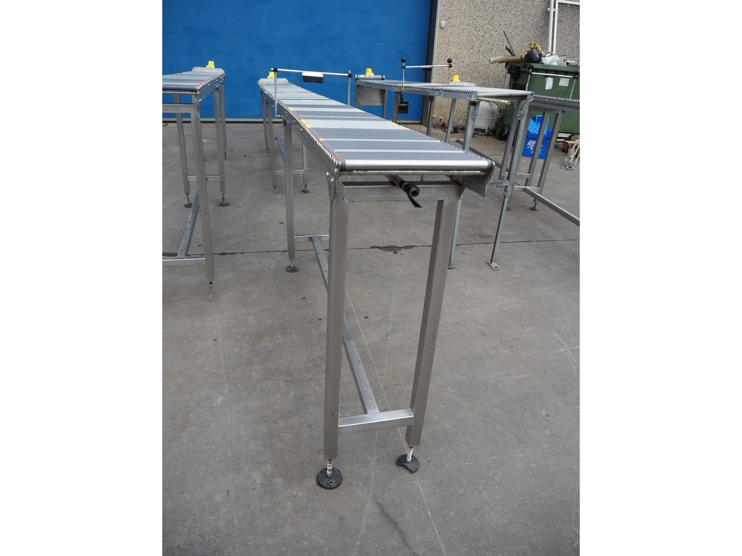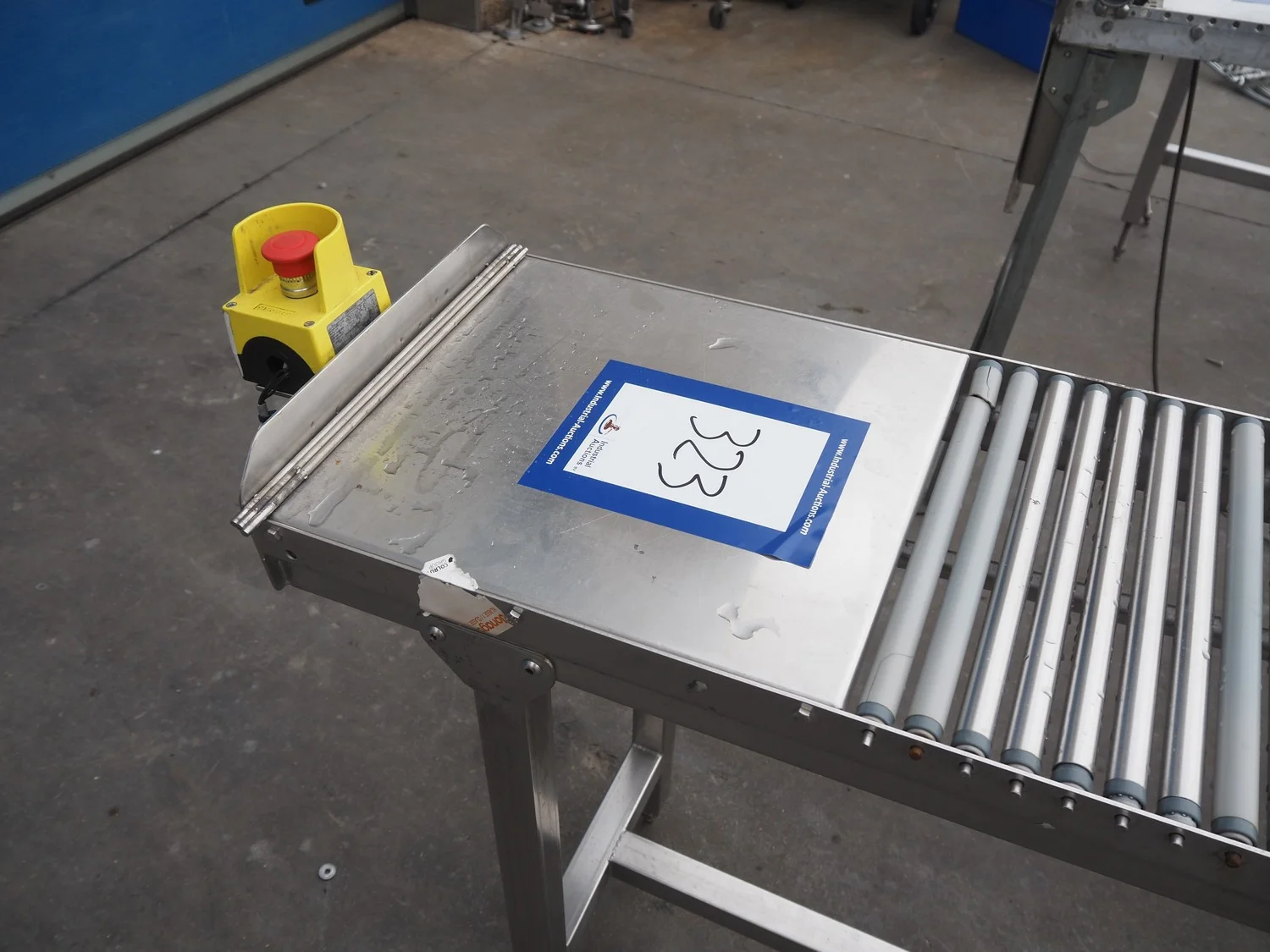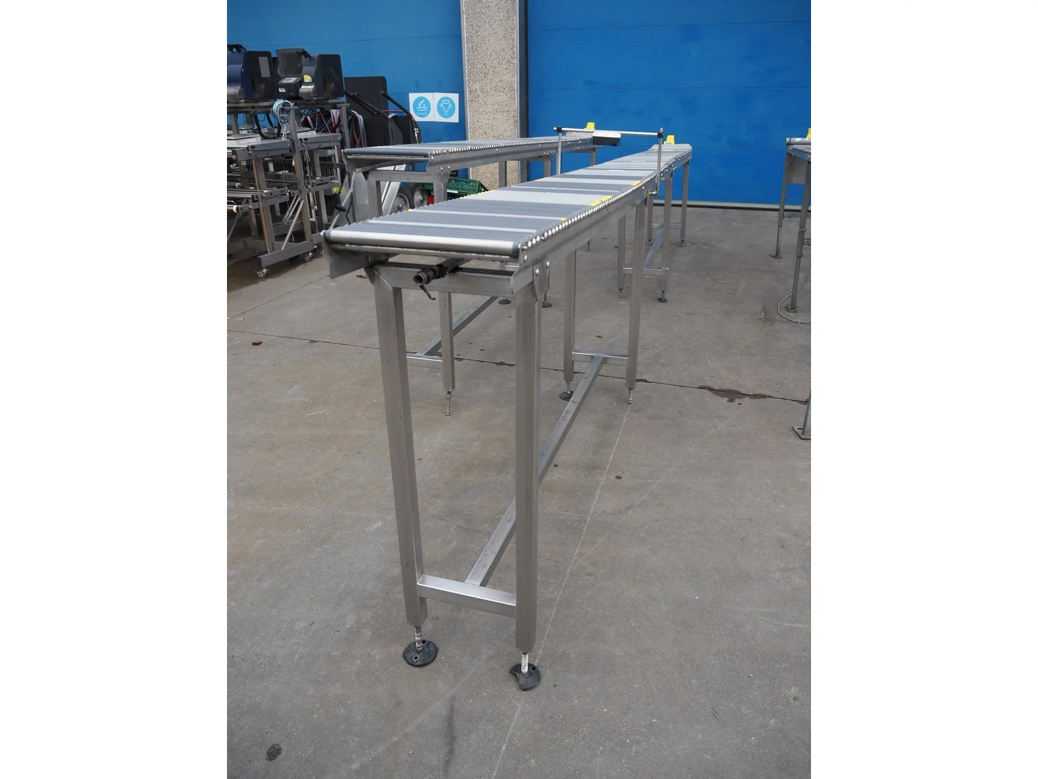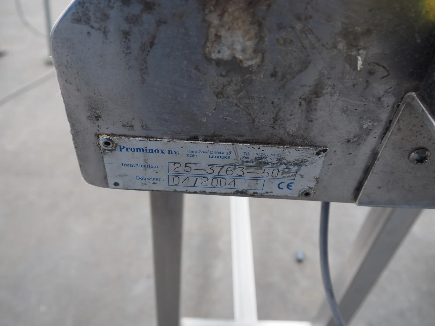 Prominox nv. s/s roller conveyor, year of construction: 04/2004, plastic rollers, roller width: 335 mm, total dimensions: 5050 mm x 430 mm x 1170 mm. Missing rollers.