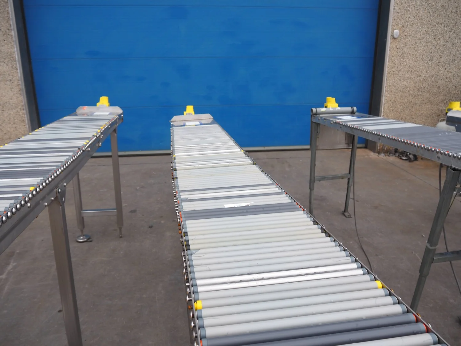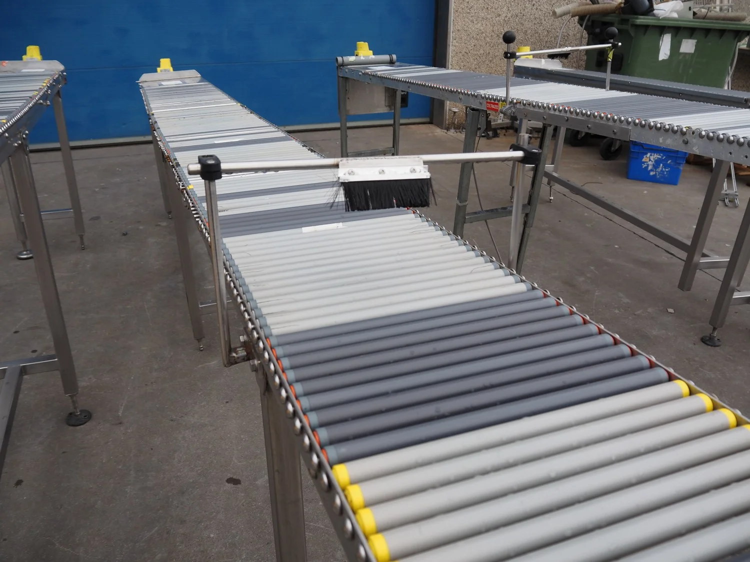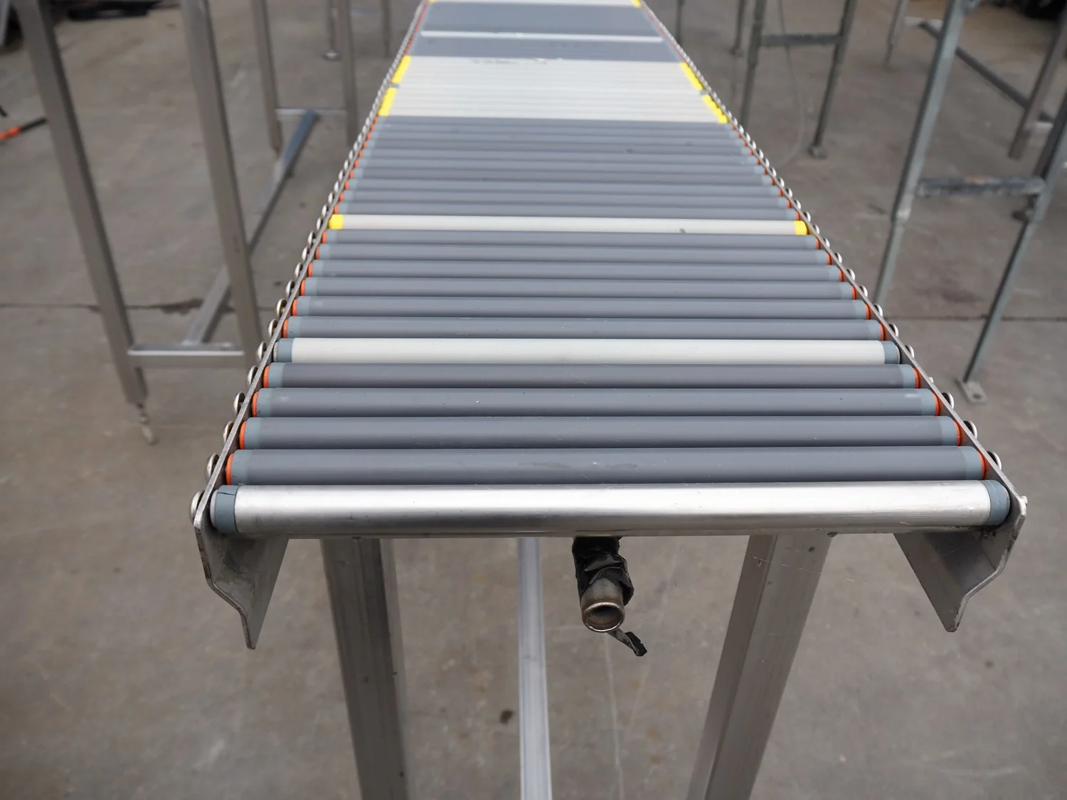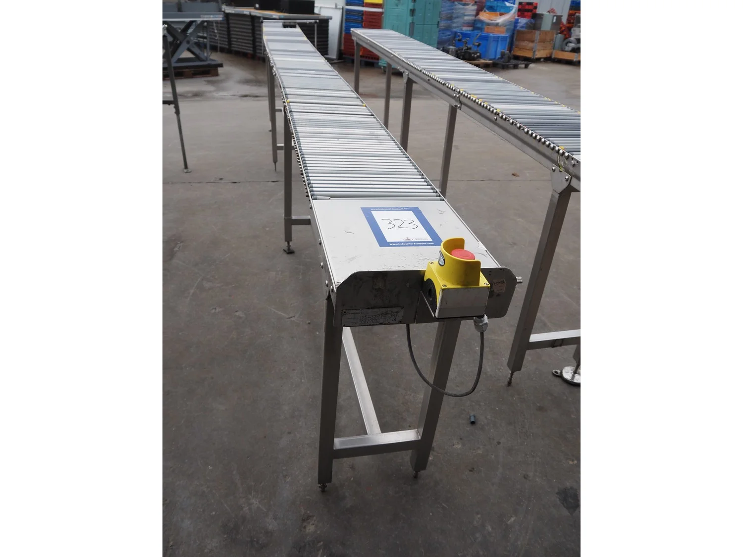 Prominox nv. s/s roller conveyor, year of construction: 04/2004, plastic rollers, roller width: 335 mm, total dimensions: 5050 mm x 430 mm x 1170 mm. Missing rollers.