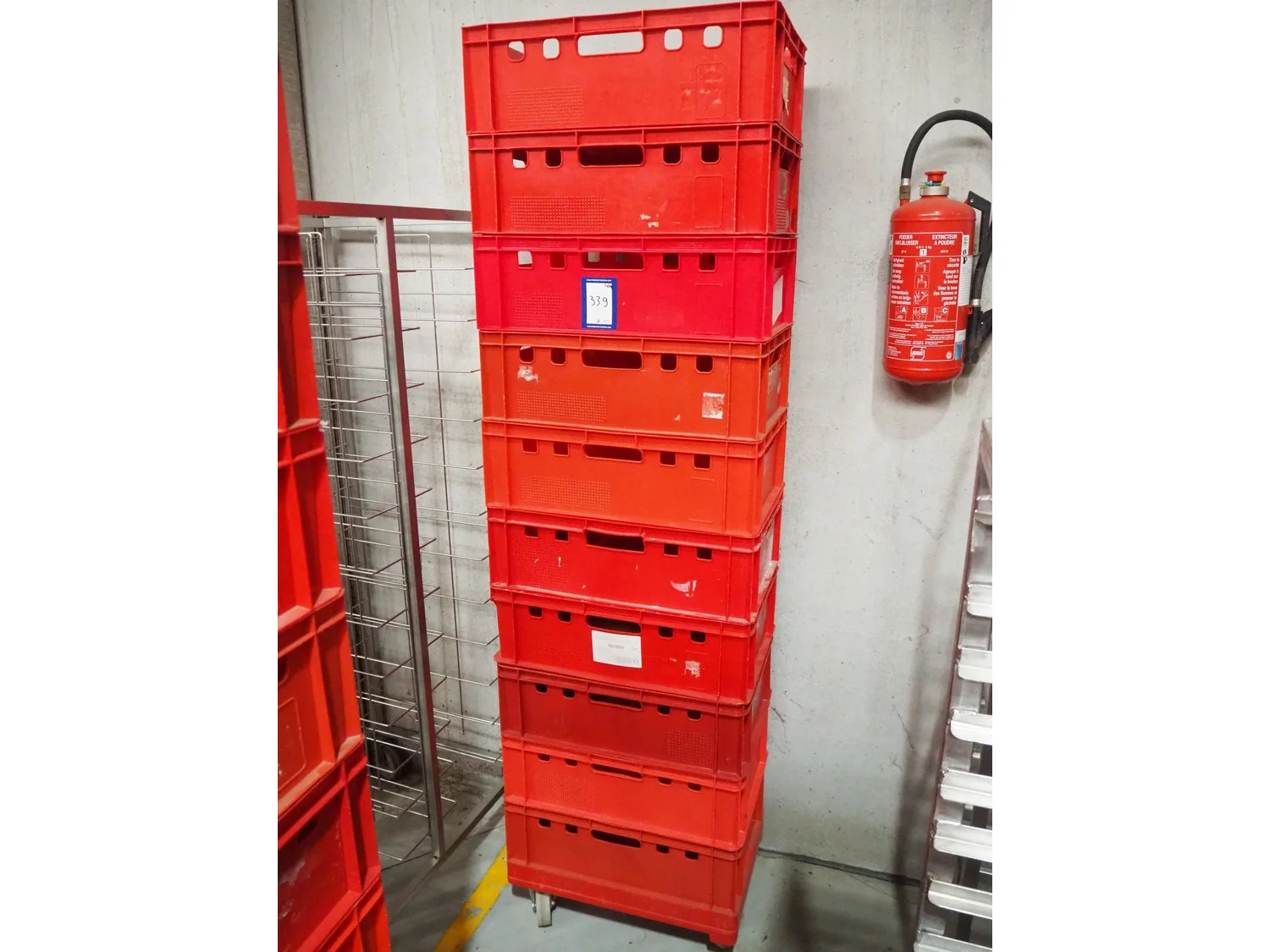 10 E-2 plastic crates on plastic rollie, dimensions (10x): 600 mm x 400 mm x 190 mm.