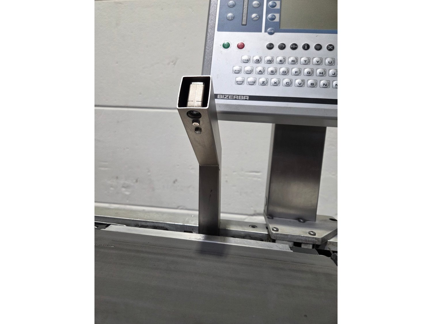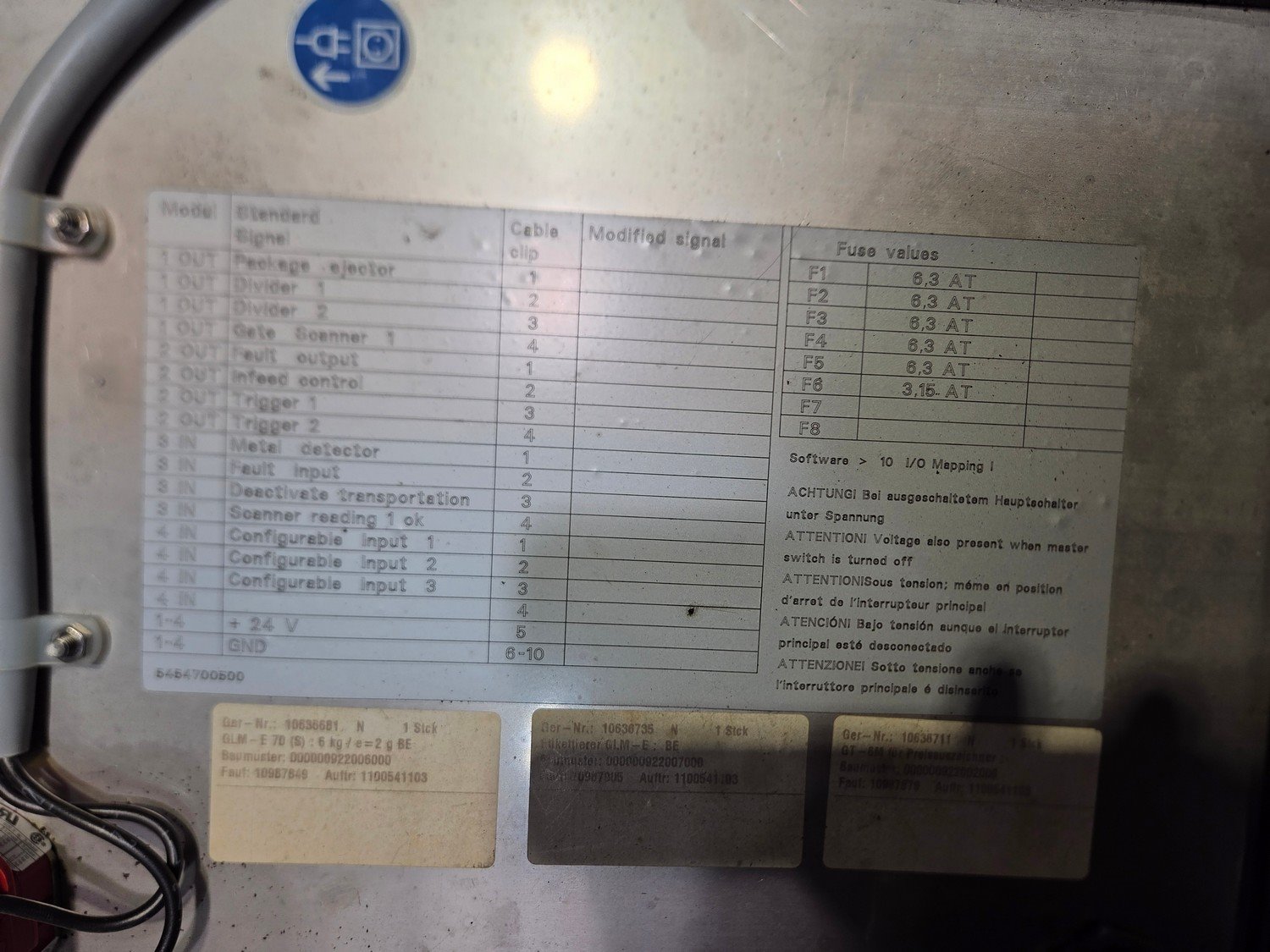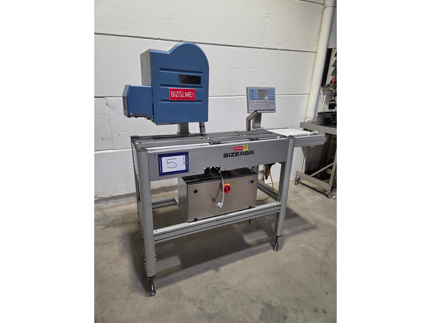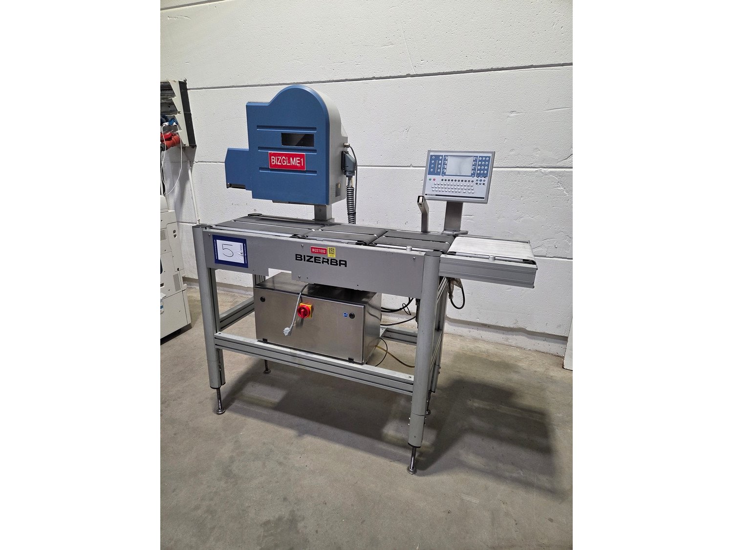 Bizerba checkweigher with labeller, model: GLM-E, number: 10636681, plastic belt, belt width: 296 mm and (2x) 135 mm, model labeller: GLE, number: 10636735, max: 6 kg, min: 20 gram, e=1 gram, total dimensions: 1630 mm x 650 mm x 1700 mm.