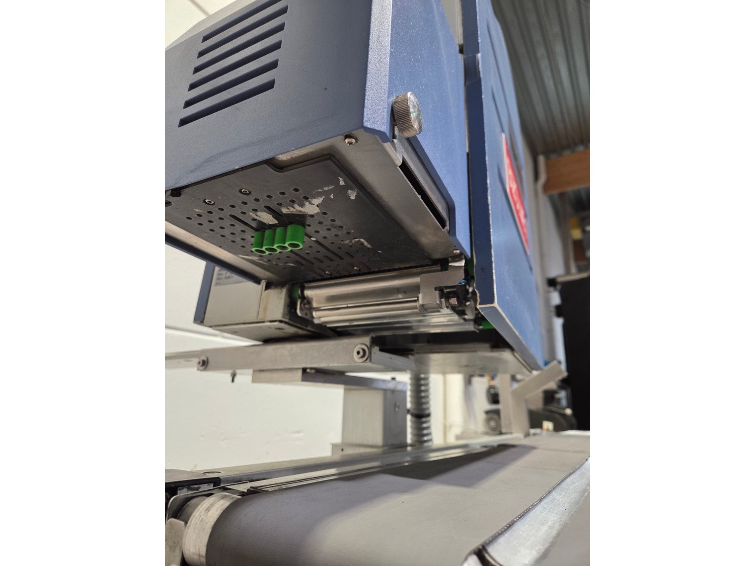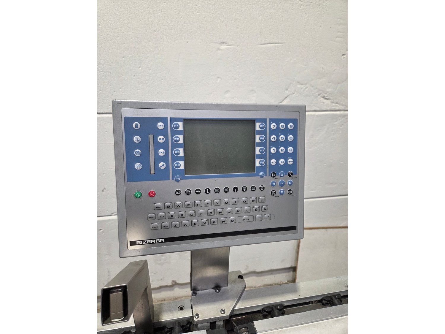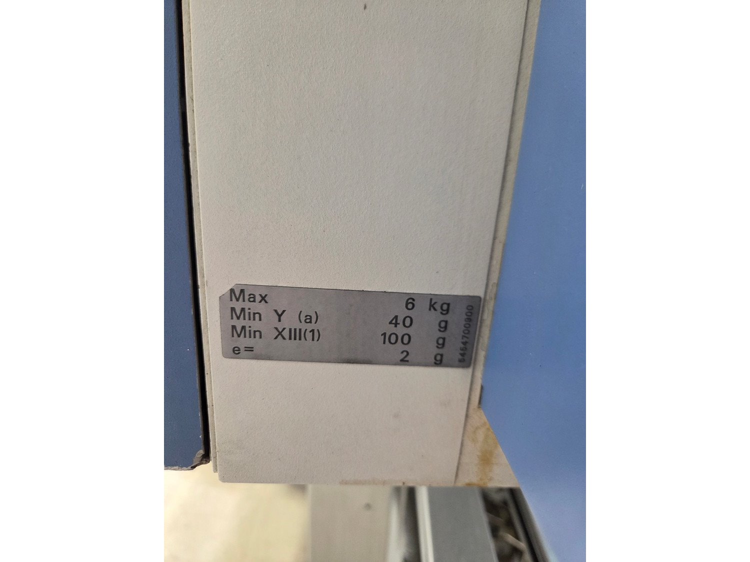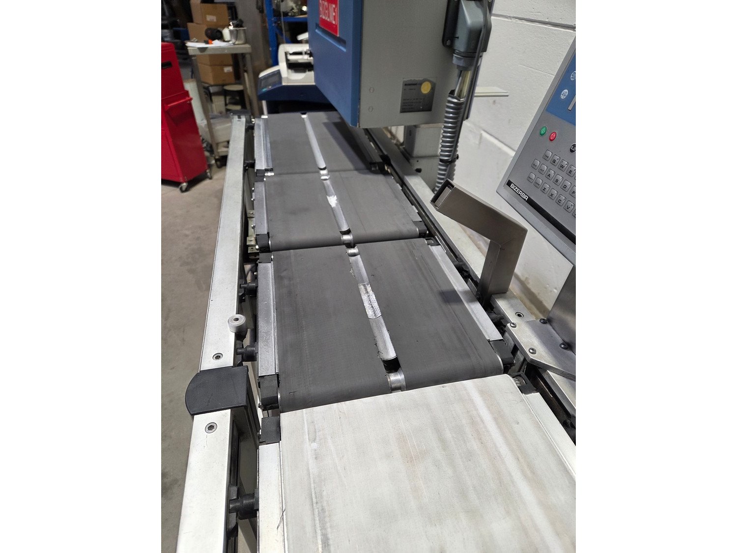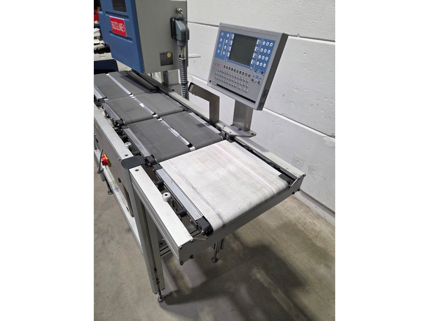 Bizerba checkweigher with labeller, model: GLM-E, number: 10636681, plastic belt, belt width: 296 mm and (2x) 135 mm, model labeller: GLE, number: 10636735, max: 6 kg, min: 20 gram, e=1 gram, total dimensions: 1630 mm x 650 mm x 1700 mm.