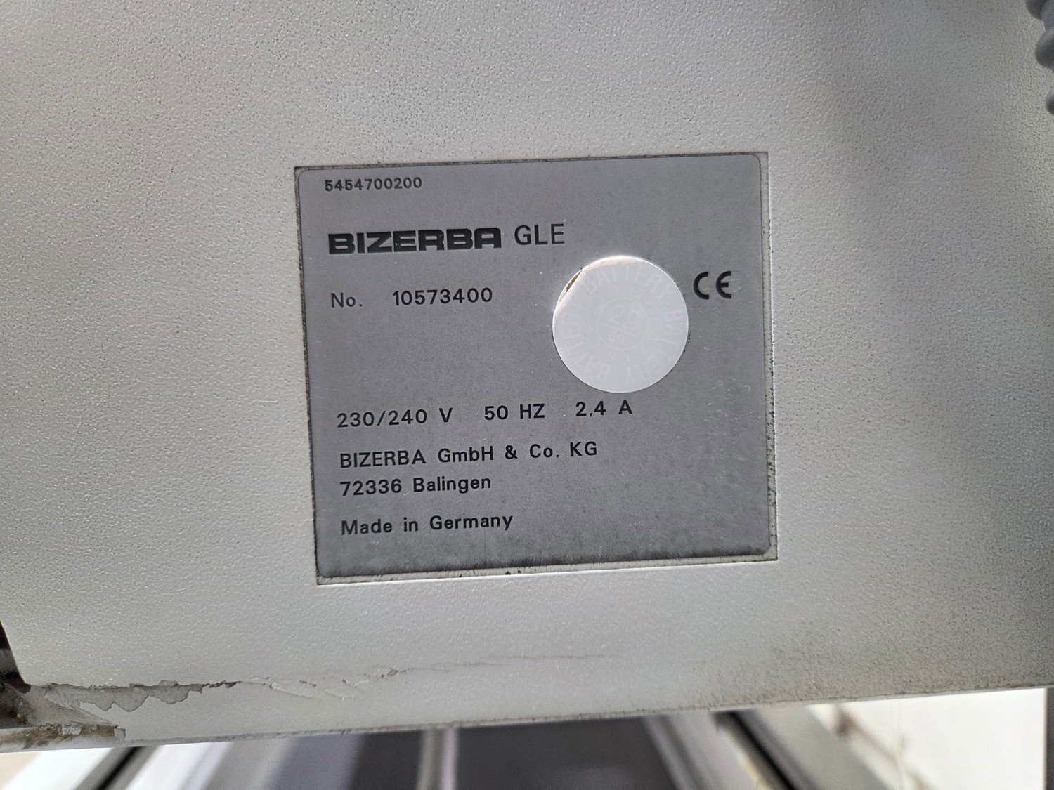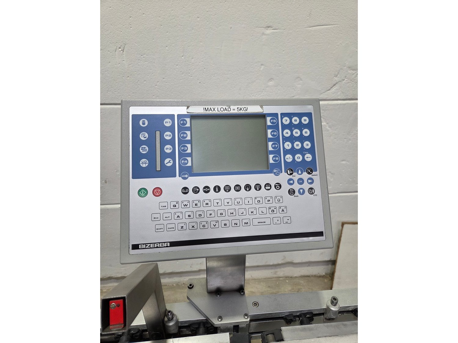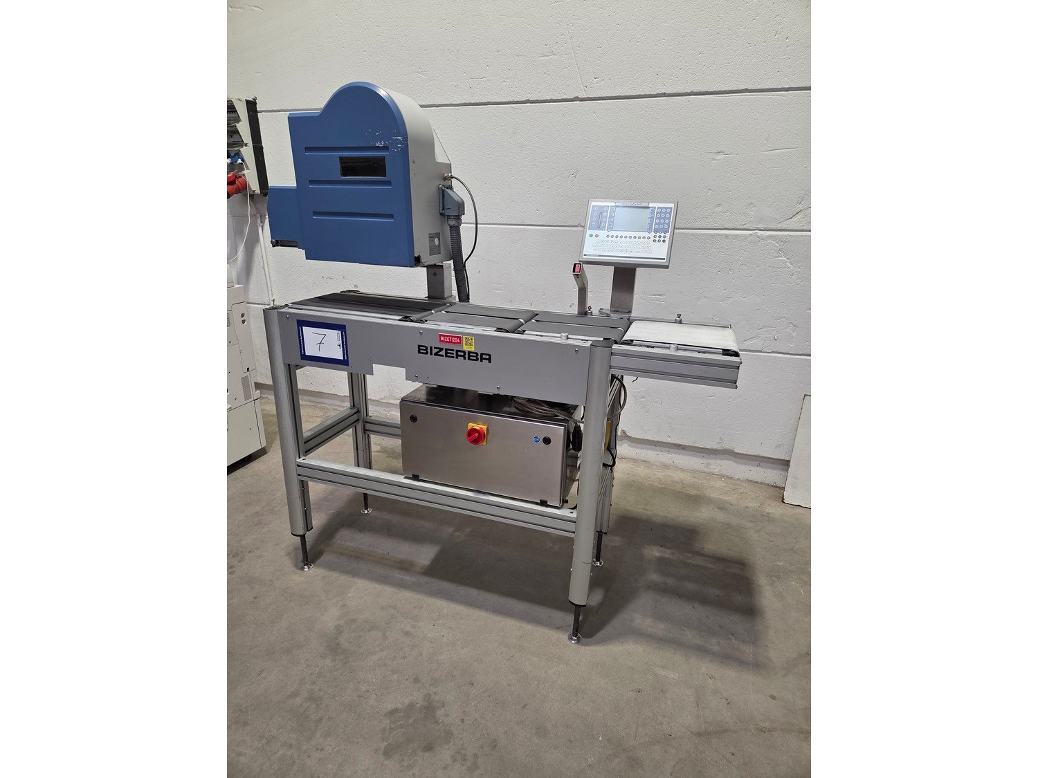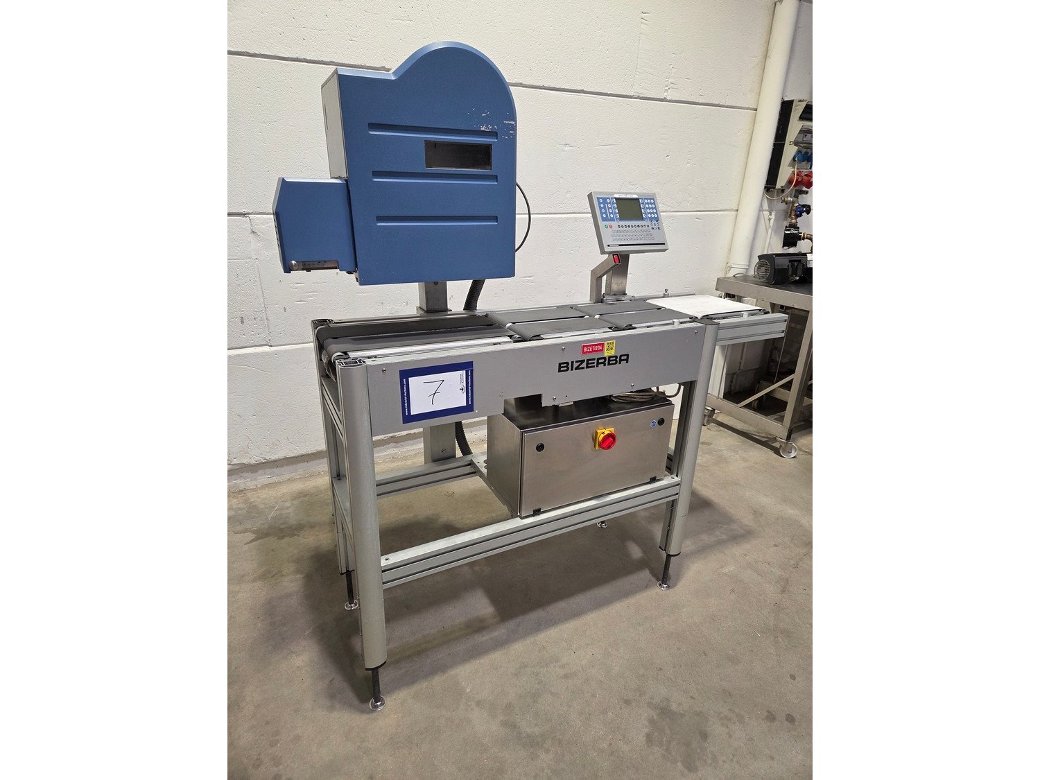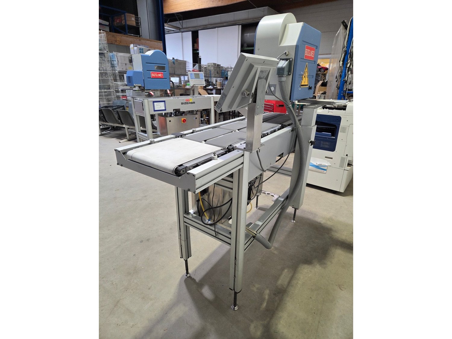 Bizerba checkweigher with labeller, model: GLM-E, number: 10573354, plastic belt, belt width: 296 mm and (2x) 135 mm, model labeller: GT-6M, number: 10573401, max: 6 kg, min: 20 gram, e=1 gram, total dimensions: 1630 mm x 650 mm x 1700 mm.