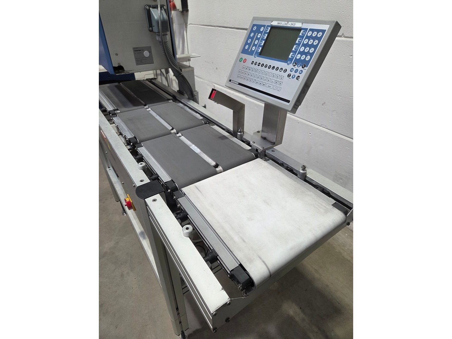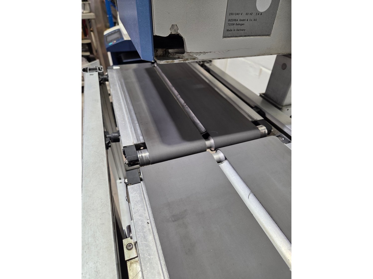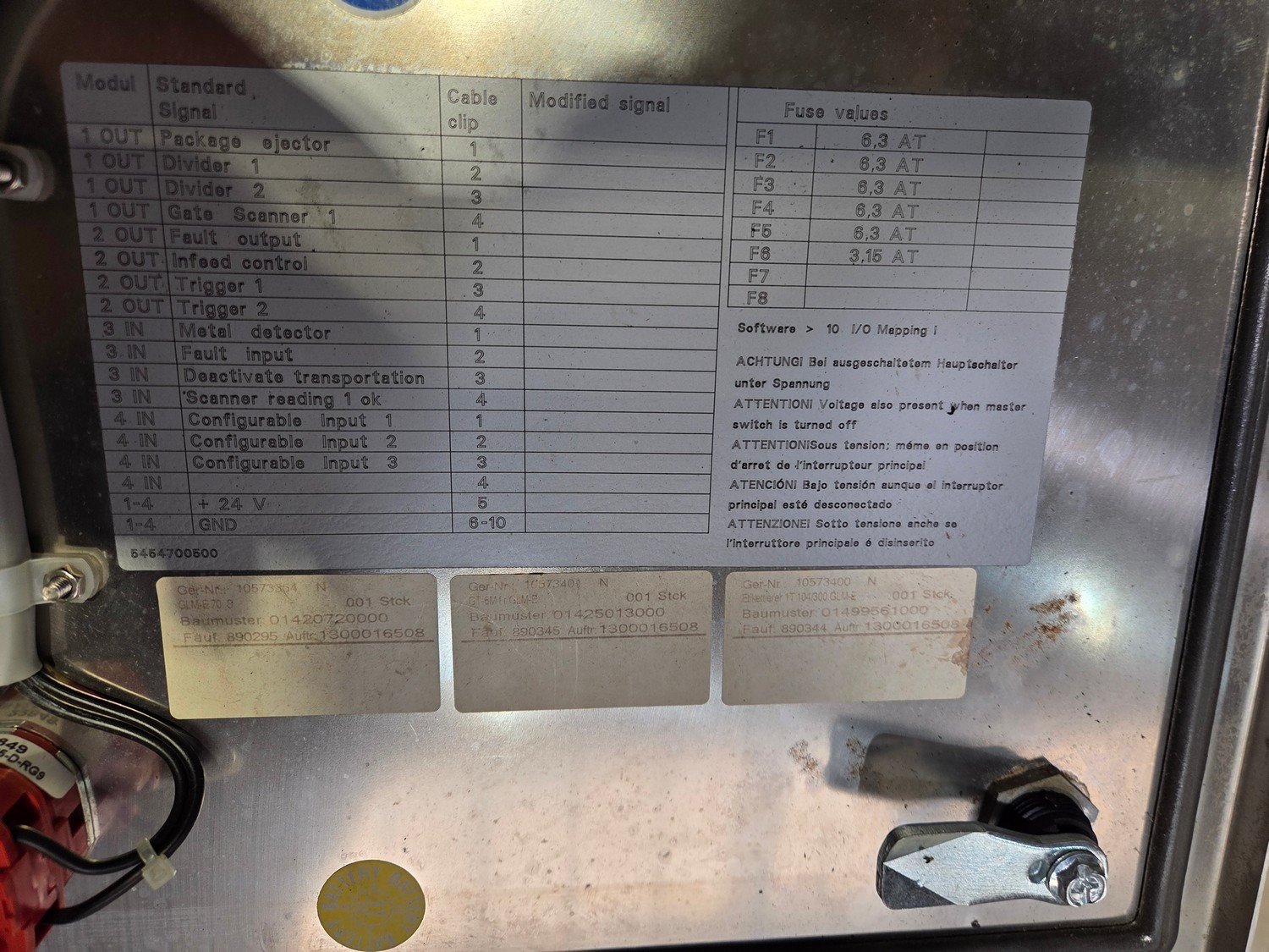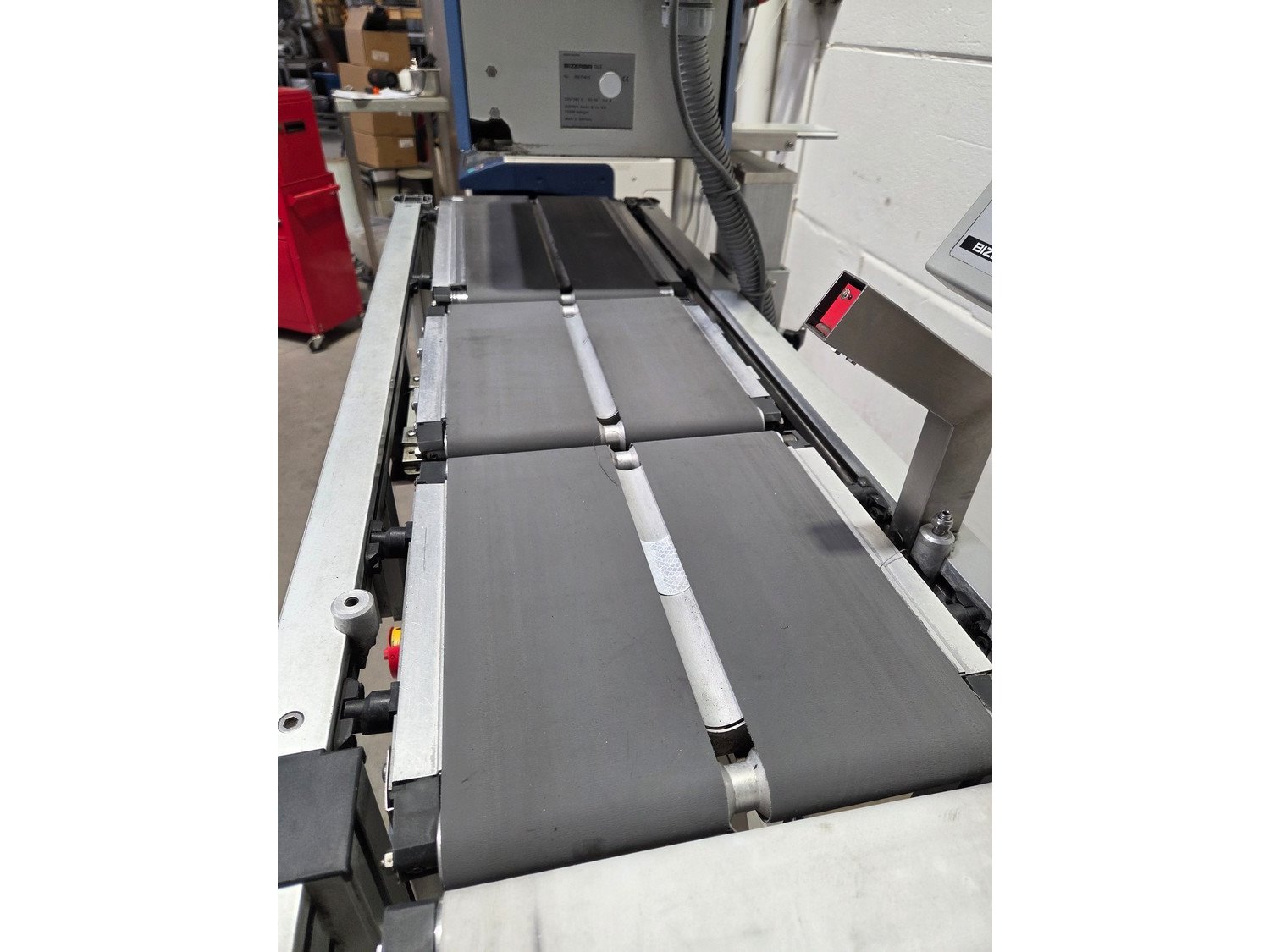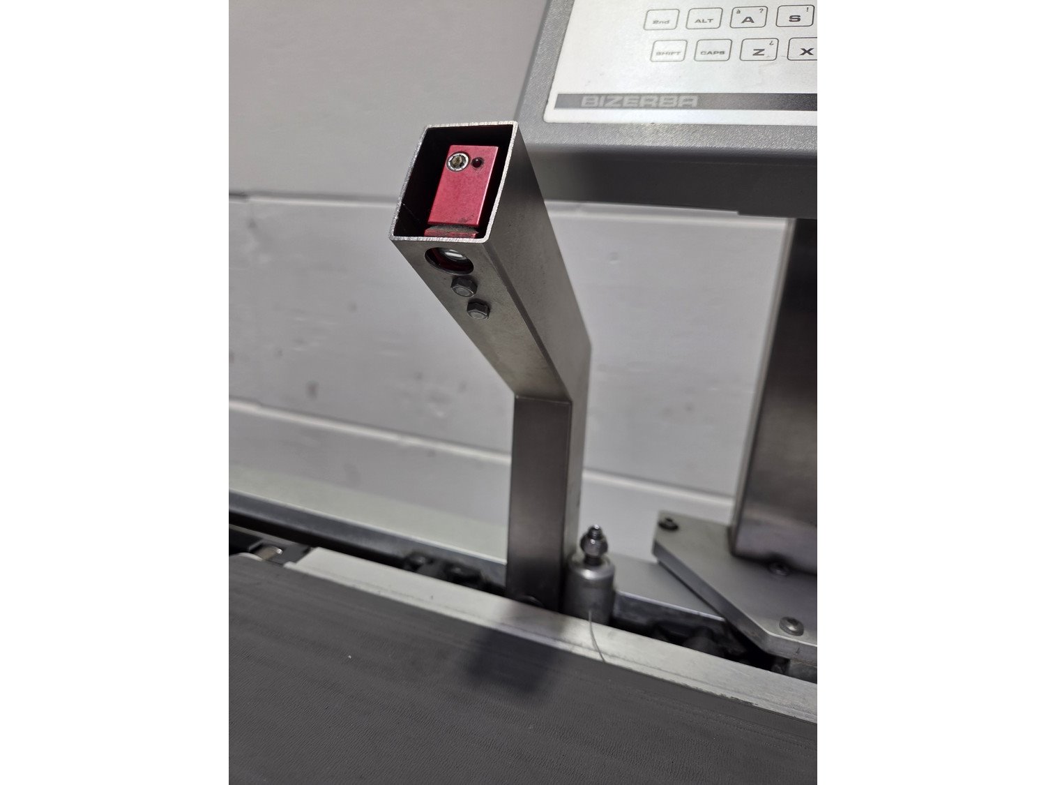 Bizerba checkweigher with labeller, model: GLM-E, number: 10573354, plastic belt, belt width: 296 mm and (2x) 135 mm, model labeller: GT-6M, number: 10573401, max: 6 kg, min: 20 gram, e=1 gram, total dimensions: 1630 mm x 650 mm x 1700 mm.