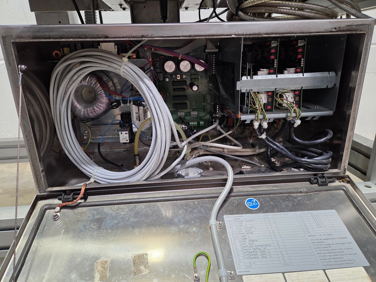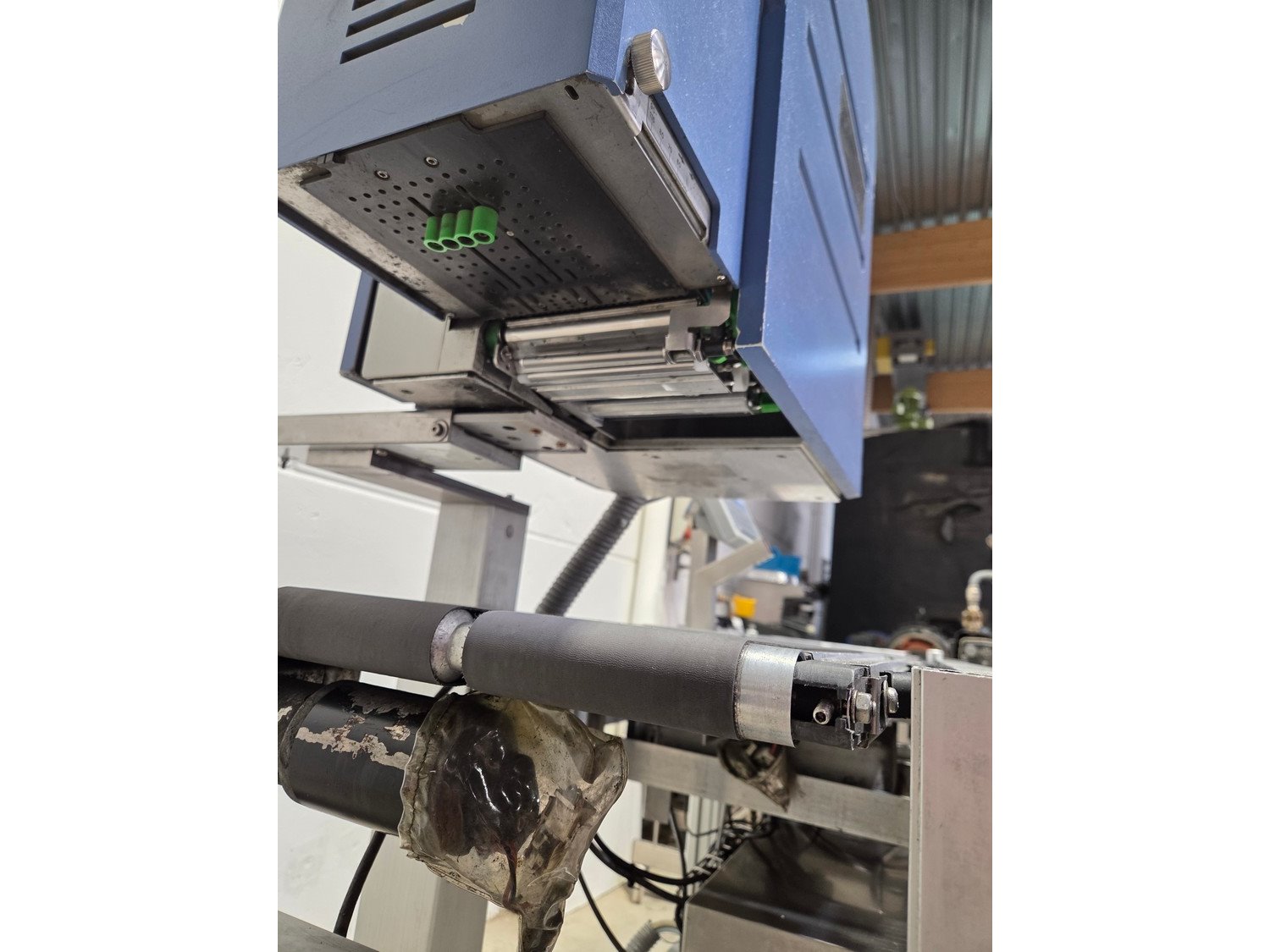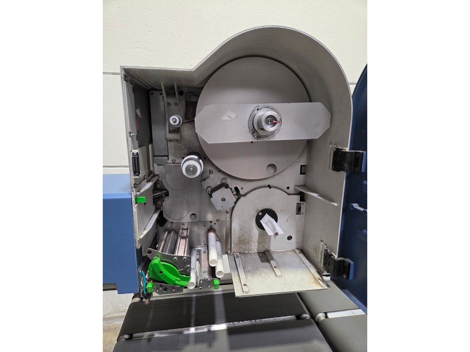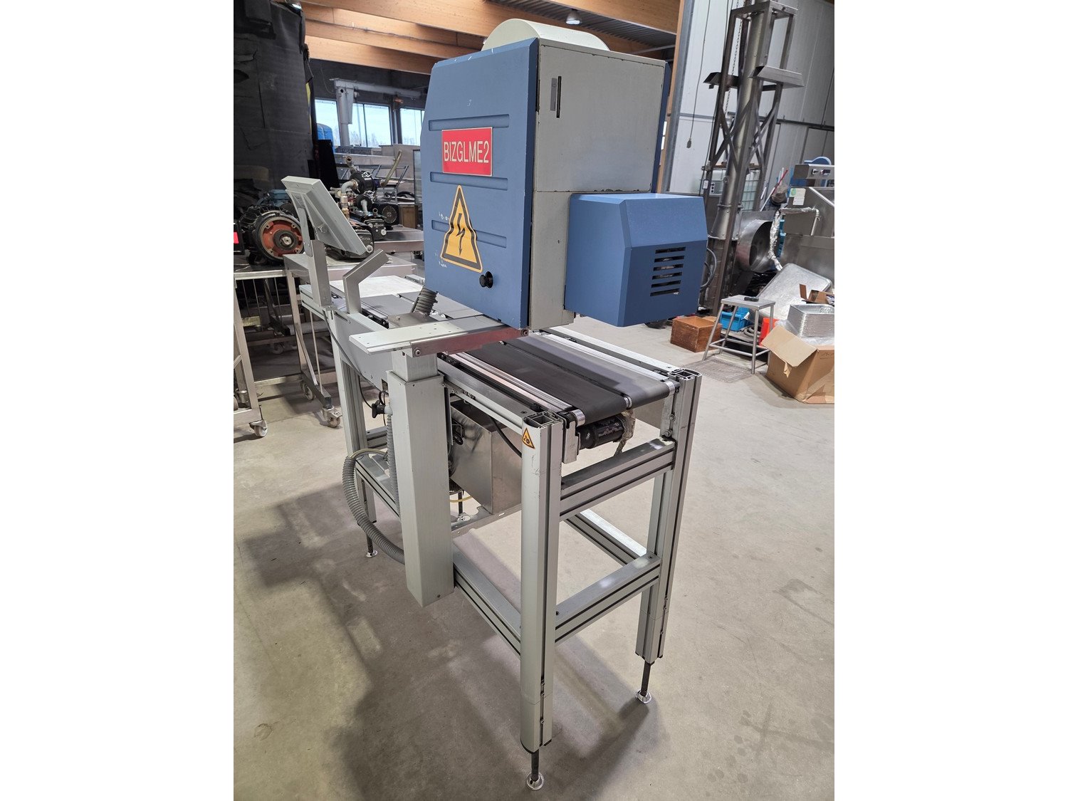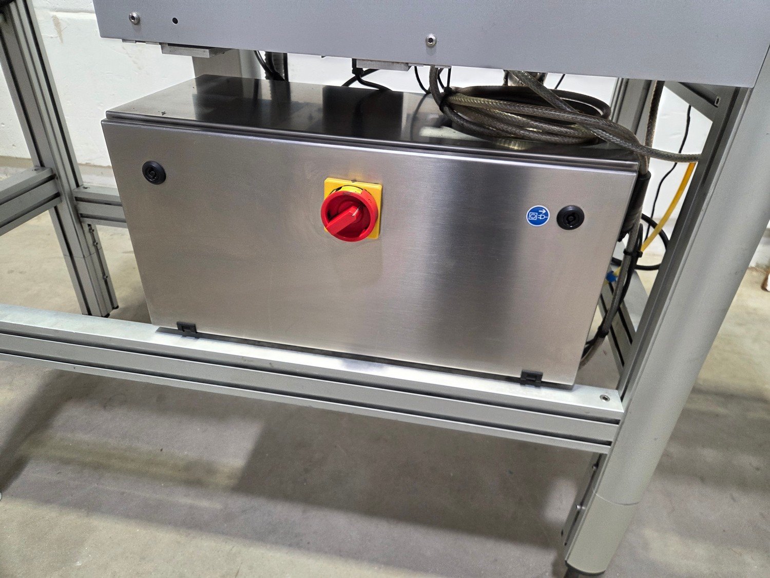 Bizerba checkweigher with labeller, model: GLM-E, number: 10573354, plastic belt, belt width: 296 mm and (2x) 135 mm, model labeller: GT-6M, number: 10573401, max: 6 kg, min: 20 gram, e=1 gram, total dimensions: 1630 mm x 650 mm x 1700 mm.