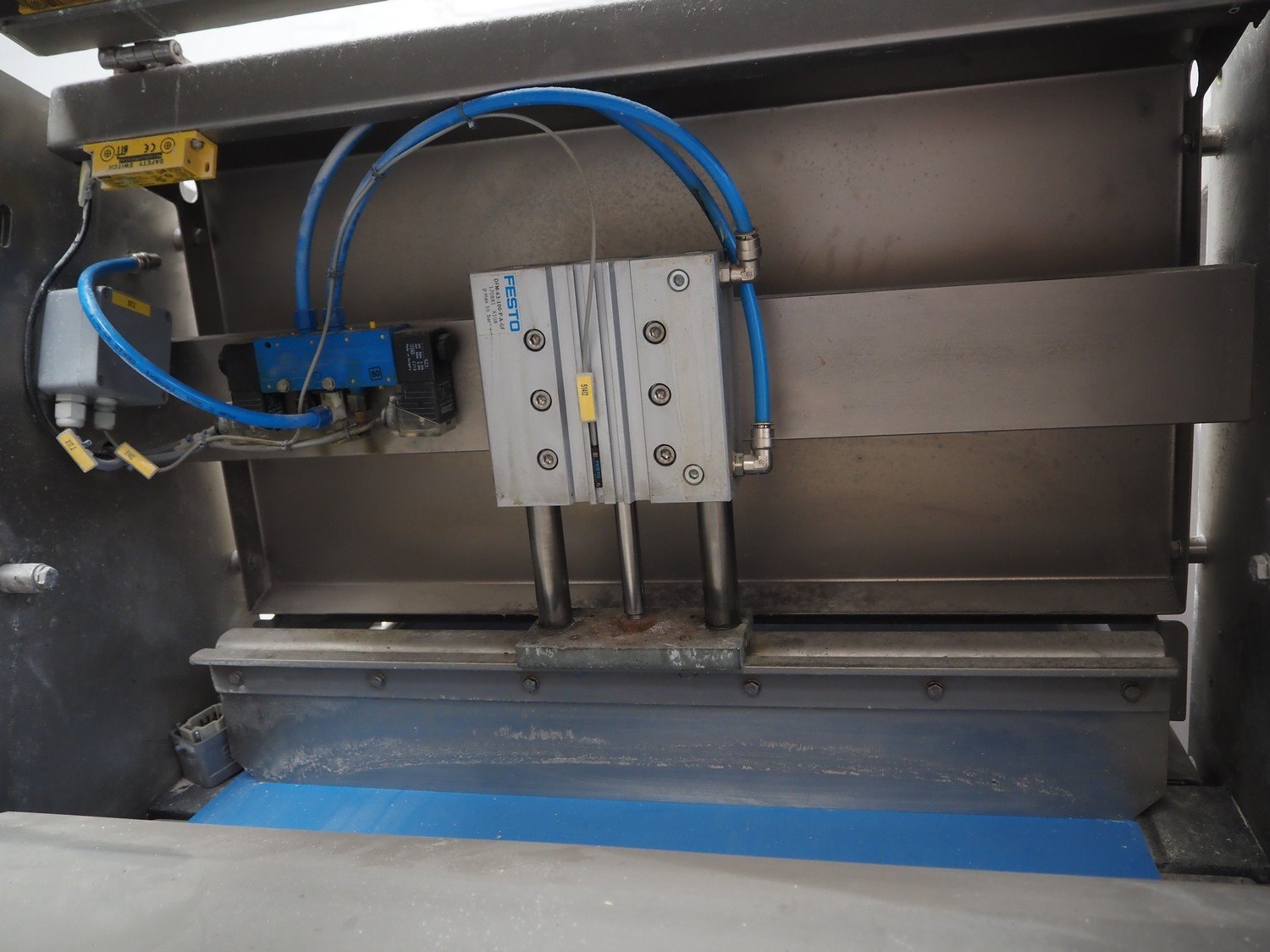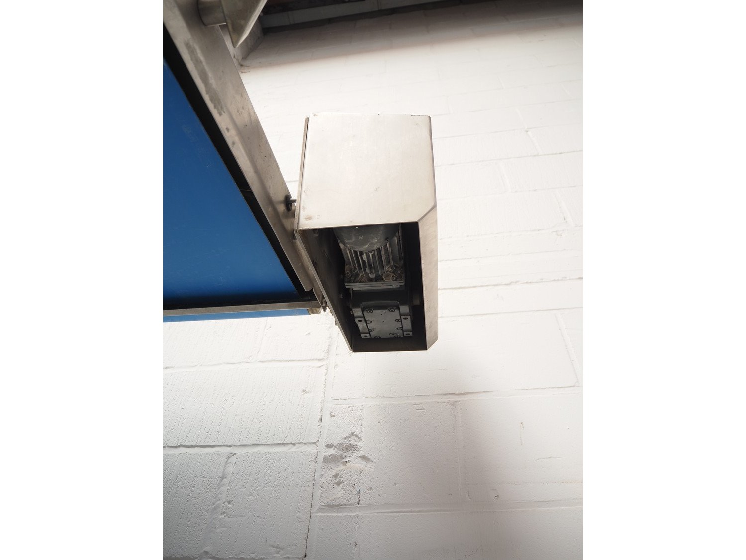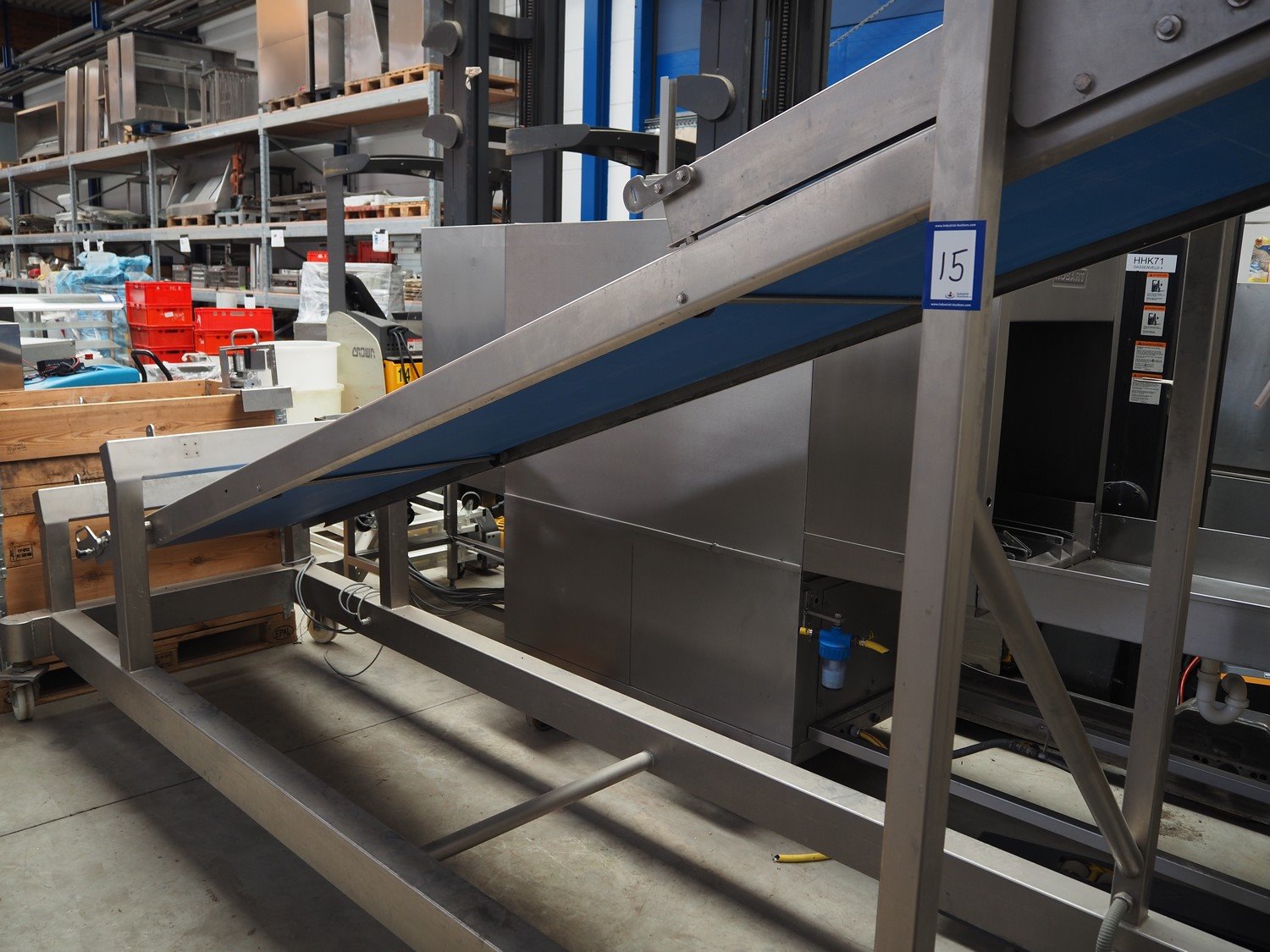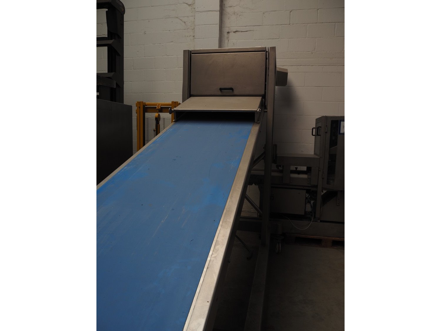Mobile elevating belt with dough portioner, plastic belt, belt width: 700 mm, elevating height: 2700 mm, total dimensions: 6100 mm x 1350 mm x 2850 mm.