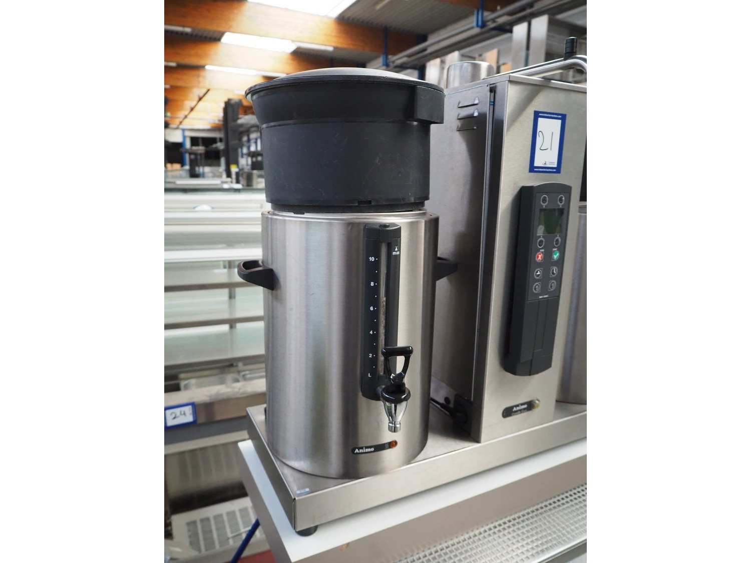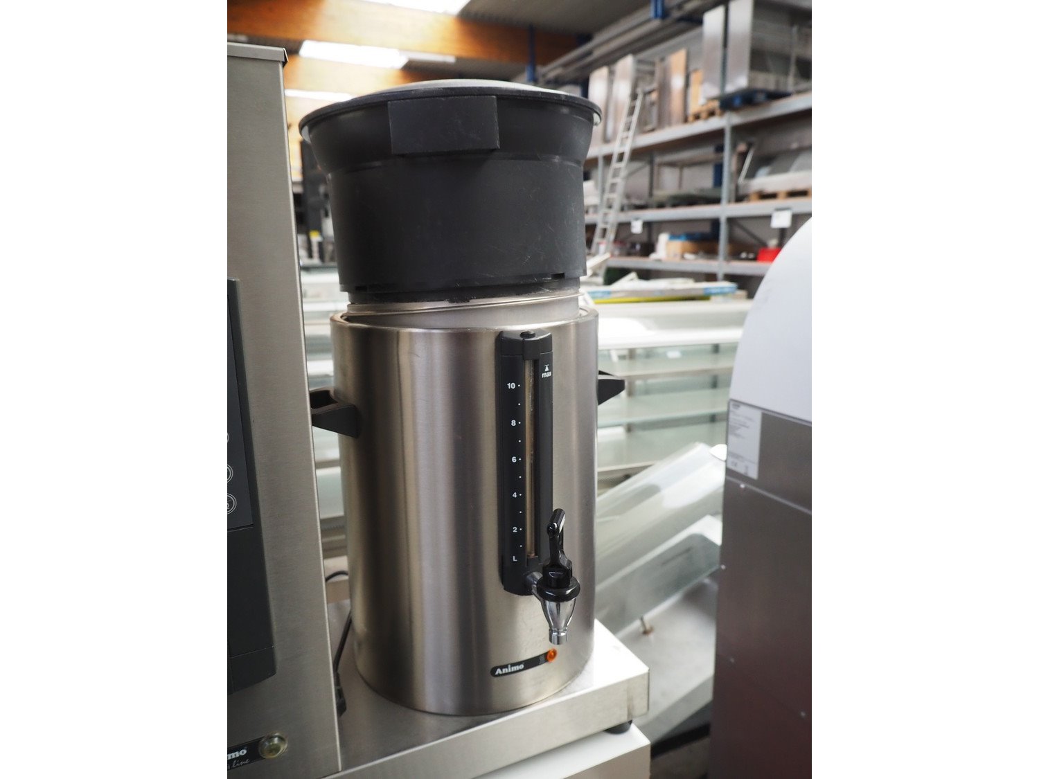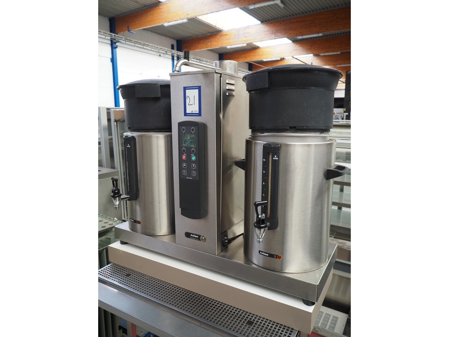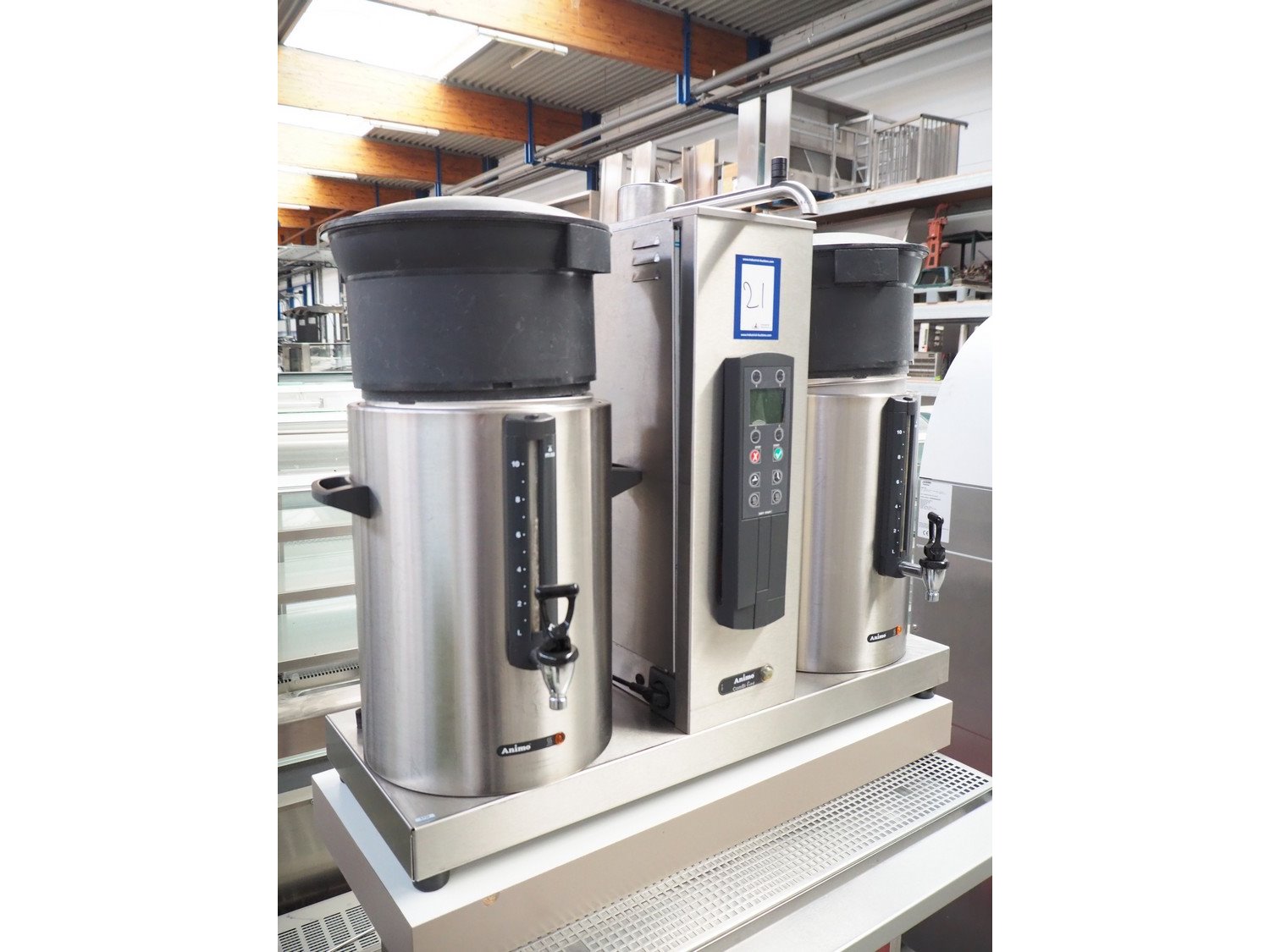 Animo double coffee machine, model: number: 10640/ 2U 13921, volume: (2x) 10 liter, total dimensions: 910 mm x 580 mm x 1700 mm.
