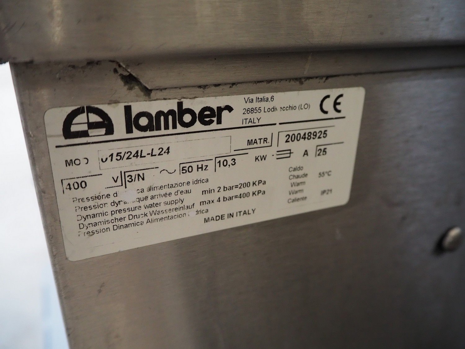Lamber dishwasher, model: 015/24L-L24, number: 20048925, 400 V, 3 Ph, 50 Hz, 25 A, 10.3 kW, dimensions inside: 580 mm x 530 mm, total dimensions: 860 mm x 750 mm x 1430 mm.