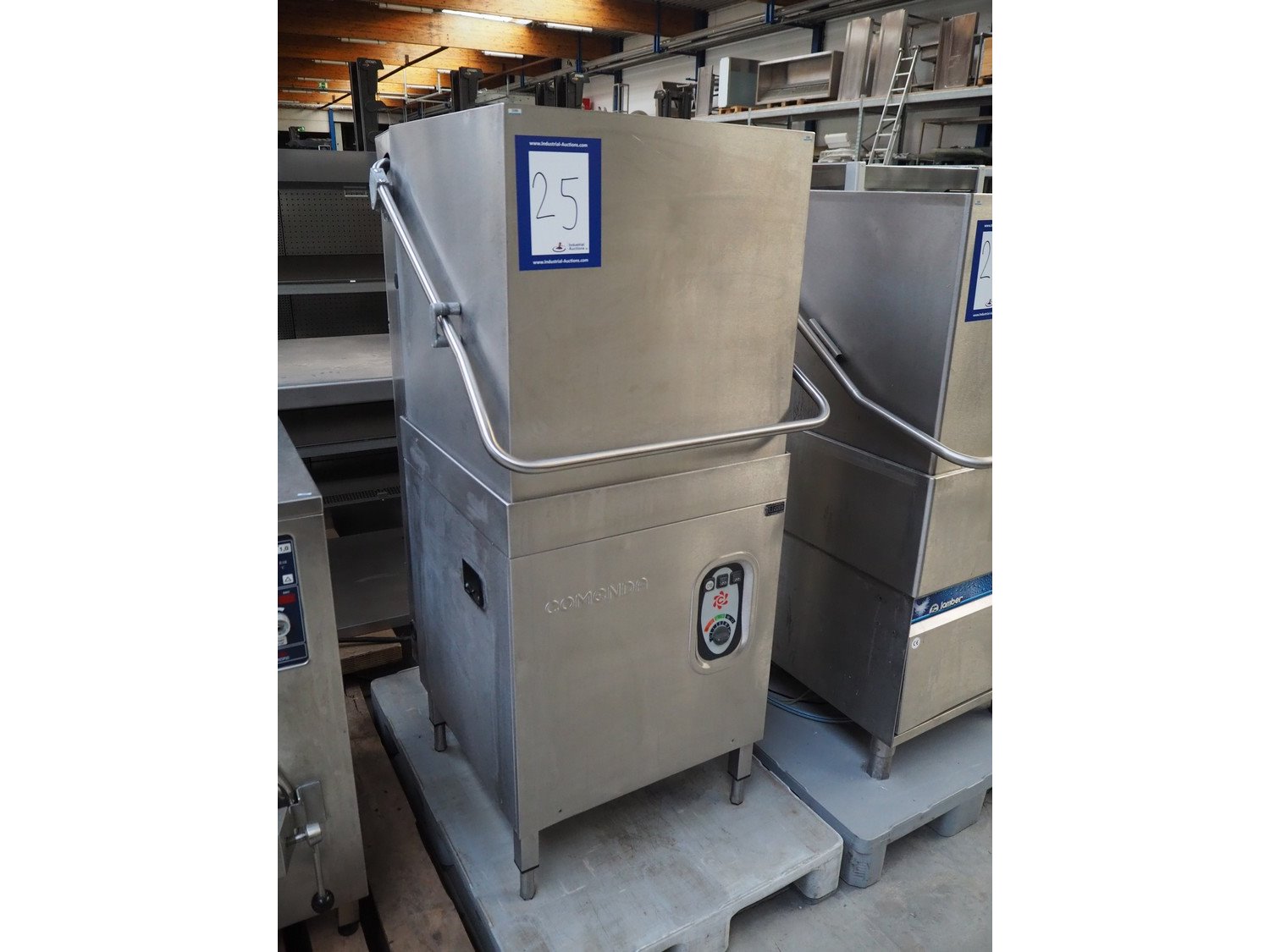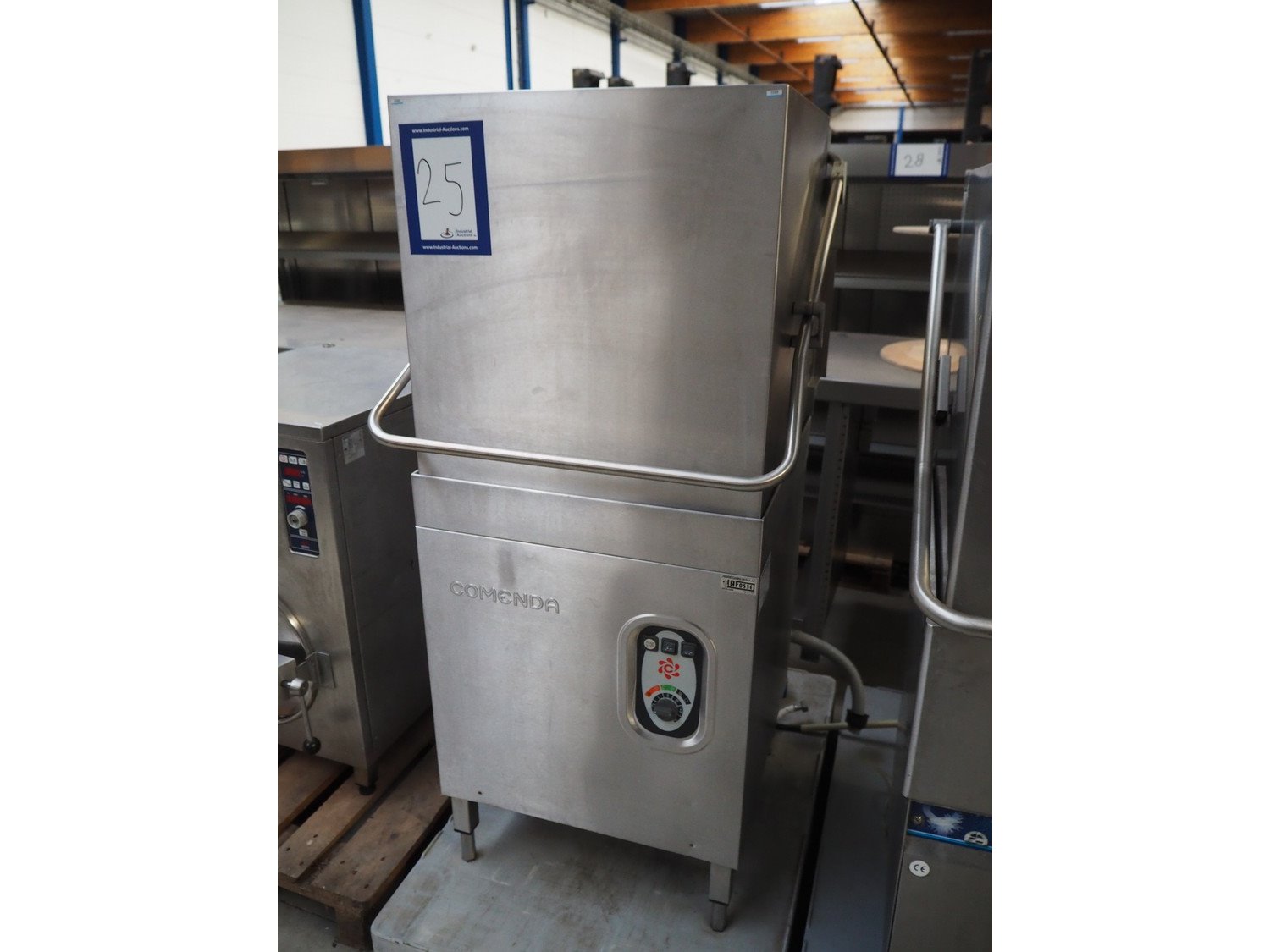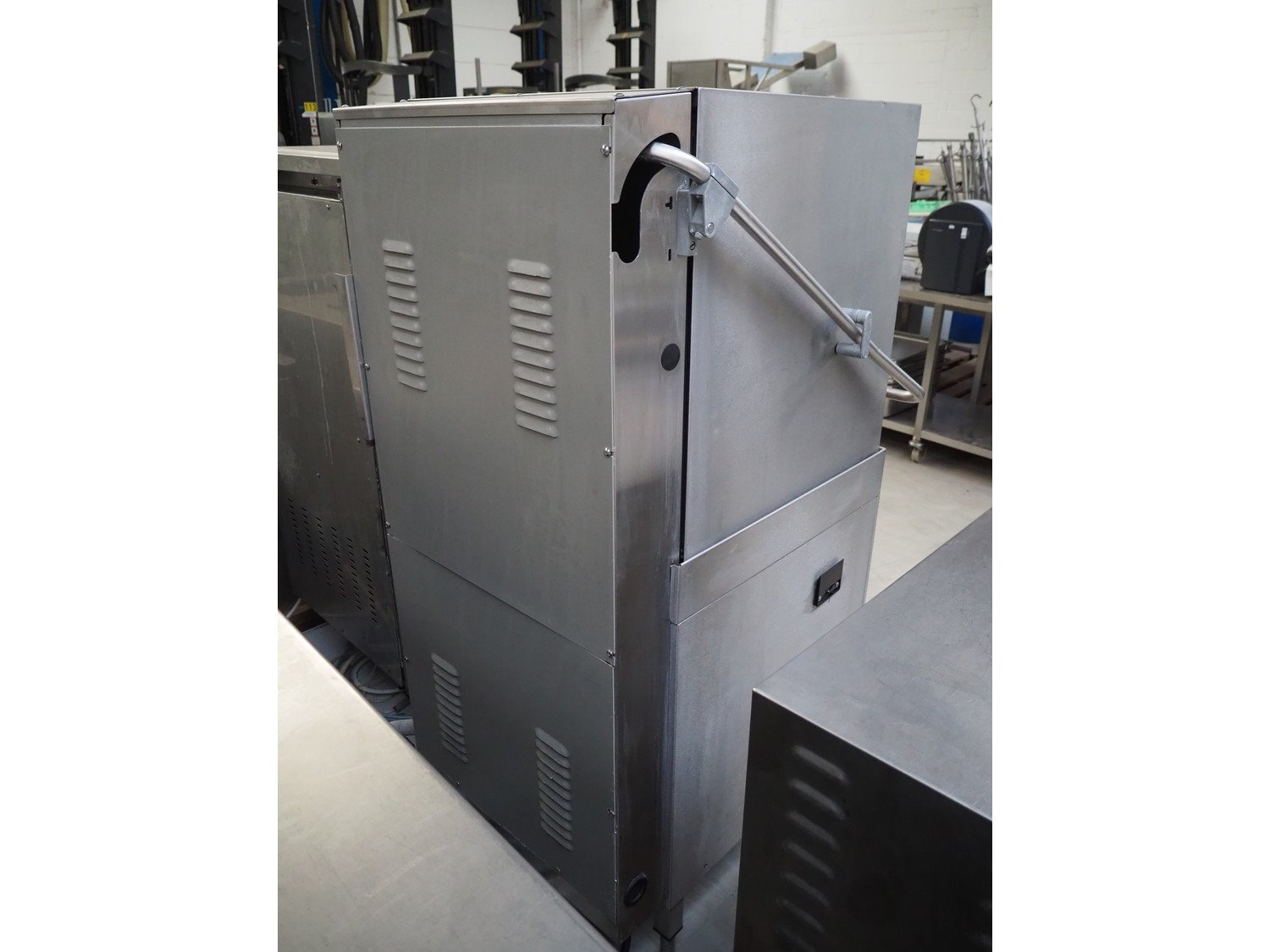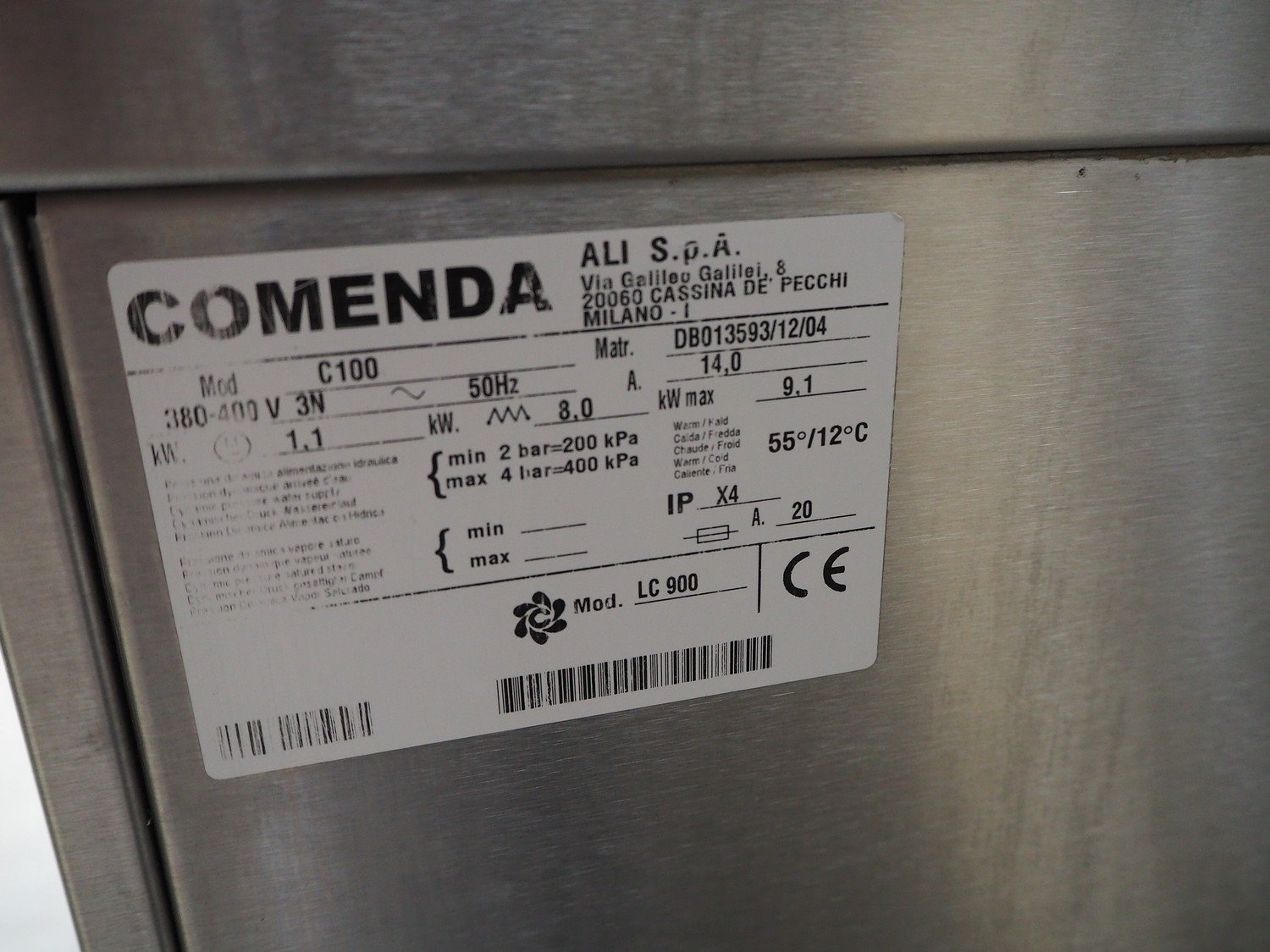 Comenda dishwasher, model: C100, number: DB013593/12/04, 380/400 V, 3 Ph, 50 Hz, 14 A, 8/9.1 kW, dimensions inside: 500 mm x 500 mm, total dimensions: 830 mm x 730 mm x 1530 mm.