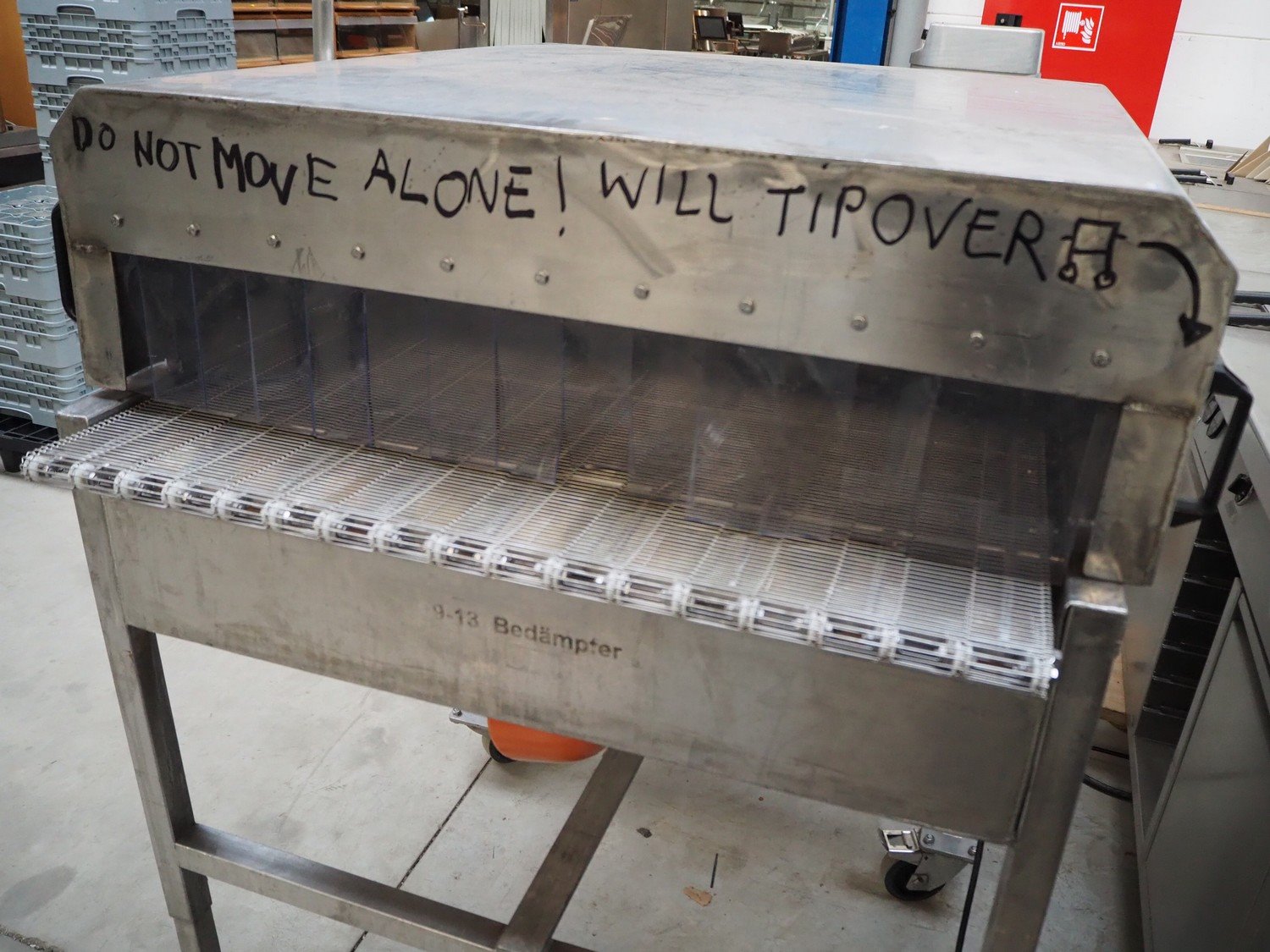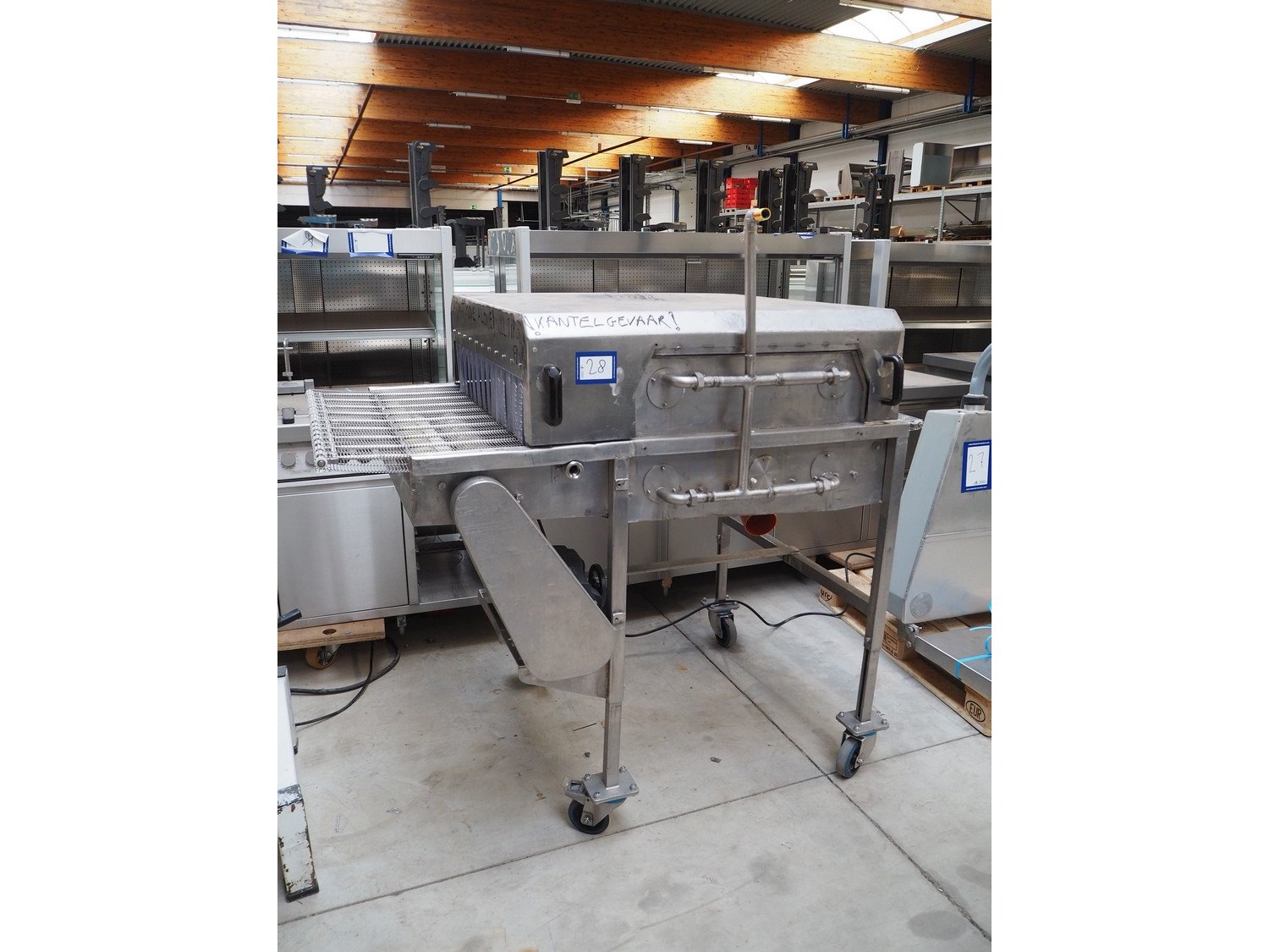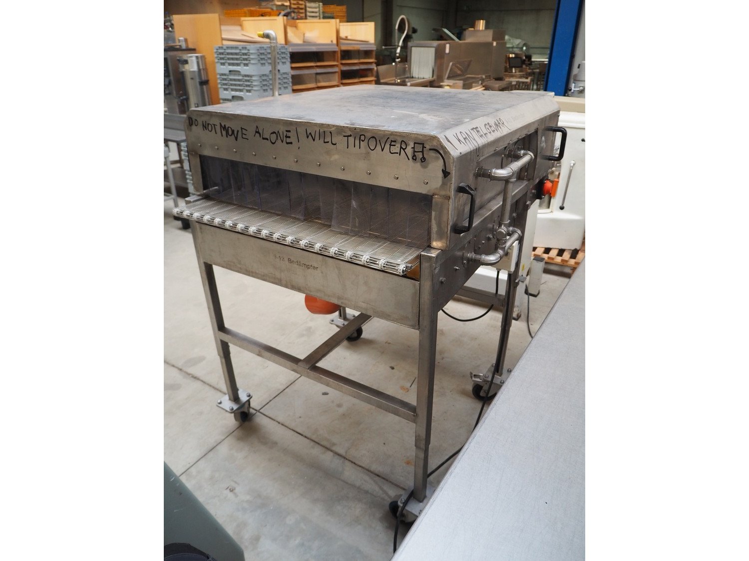 S/s mobile glazing machine, s/s mesh belt, belt width: 900 mm, clearance: 910 mm x 455 mm, total dimensions: 1700 mm x 1150 mm x 1650 mm.
