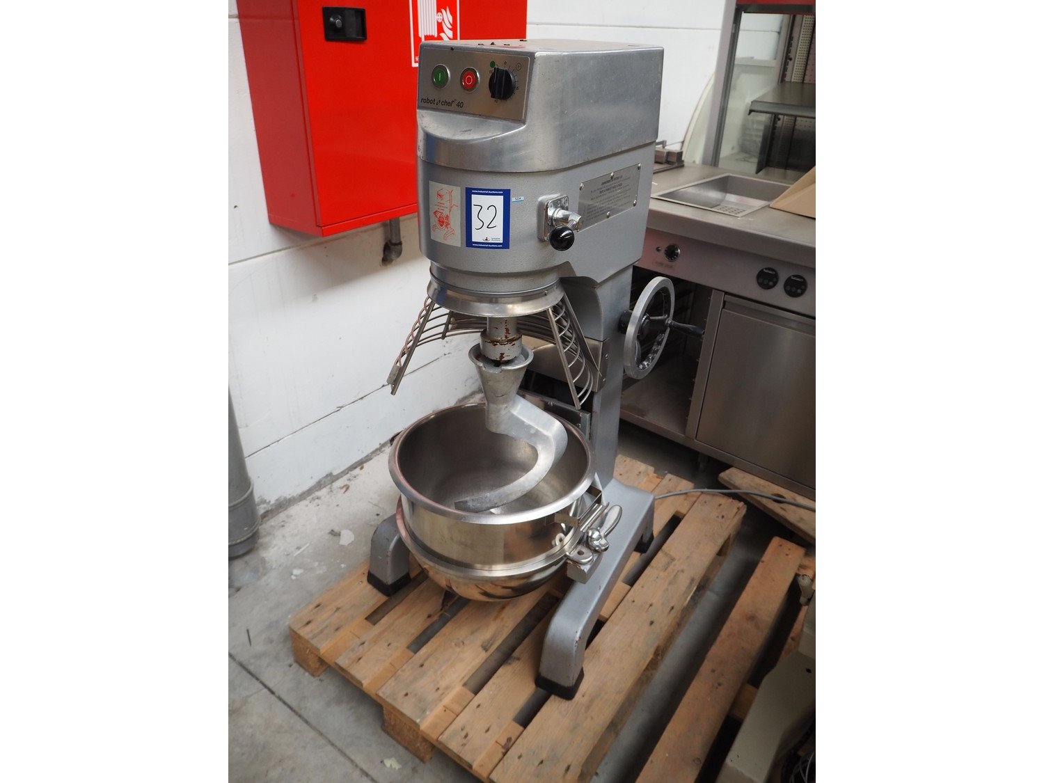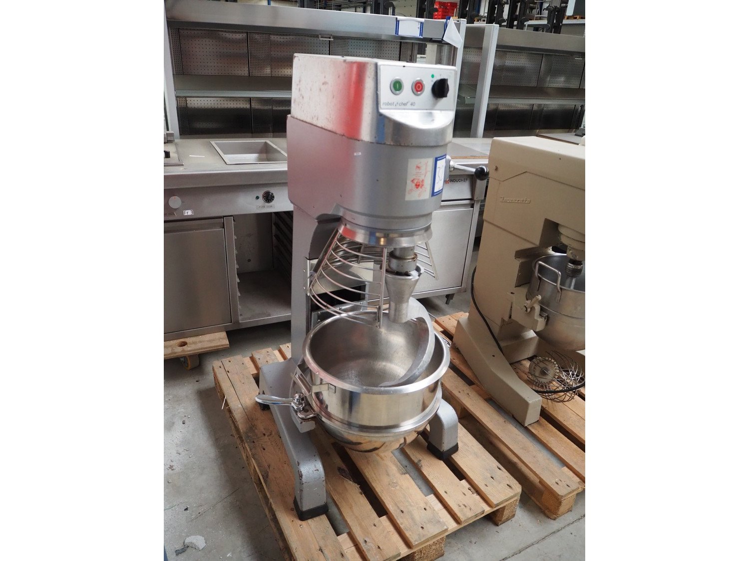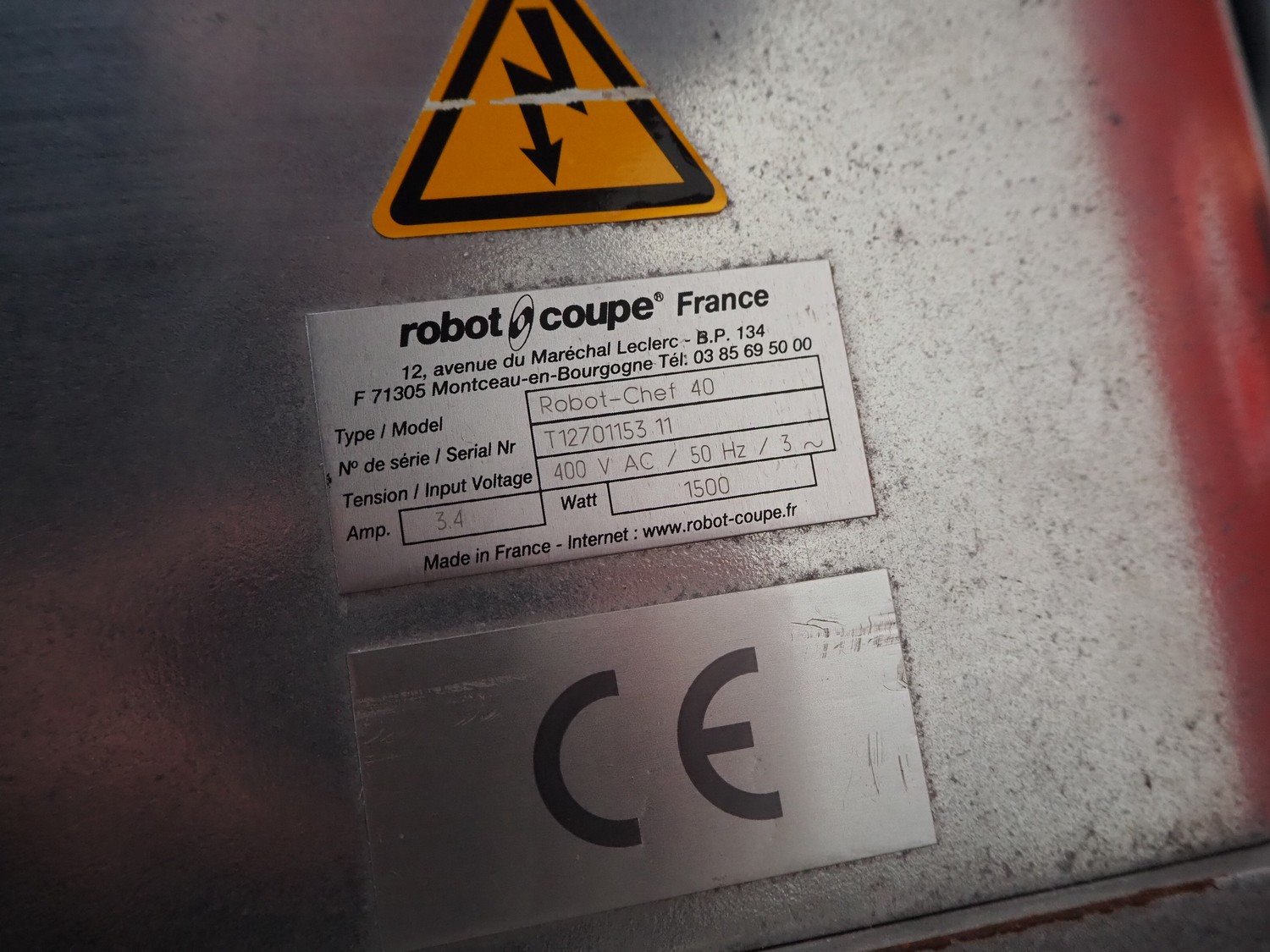 Robot Coupe mixer, model: Robot-Chef 40, serial number: T12701153 11, 400 V, 3 Ph, 50 Hz, 3.4 A, 1500 W, s/s bowl, volume: 40 liter, dimensions: 800 mm x 700 mm x 1320 mm. With whisk, hook and flat beater.