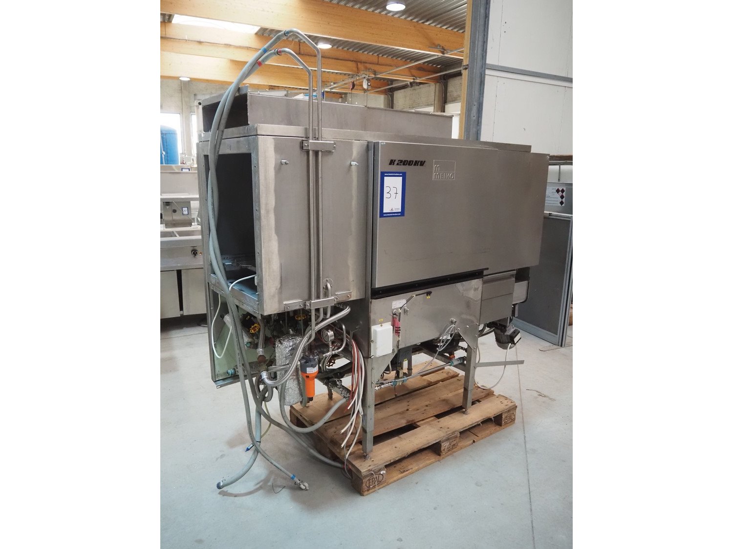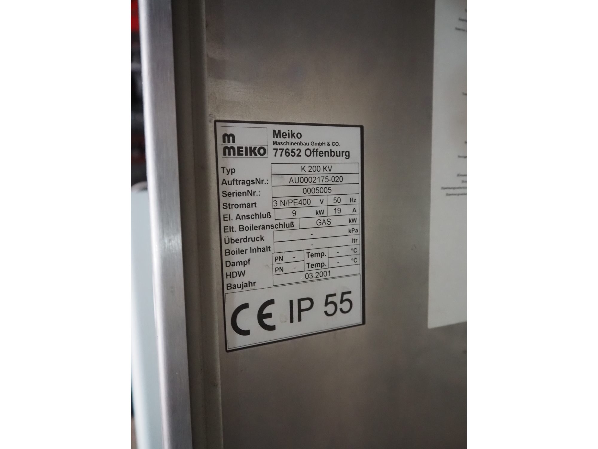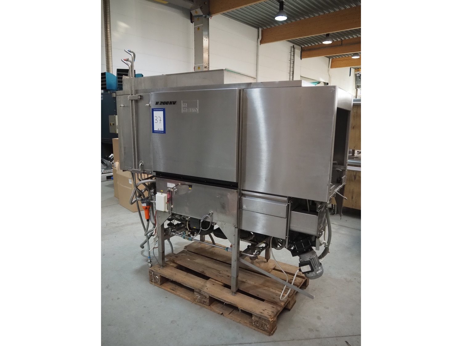 Meiko crate washer, model: K 200KV, serial number: 0005005, year of construction: 03.2001, 400 V, 3 Ph, 50 Hz, 19 A, 9 kW, clearance: 510 mm x 510 mm, total dimensions: 1910 mm x 780 mm x 1950 mm. Incomplete. Including pallet with switch cabinet, dimensions: 1730 mm x 600 mm x 300 mm and pallet with dryer, dimensions: 1190 mm x 870 mm x 1000 mm.