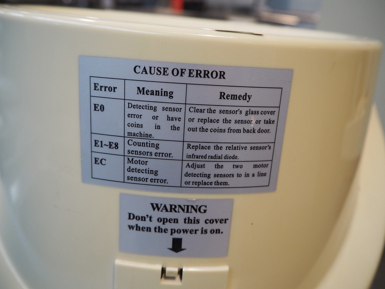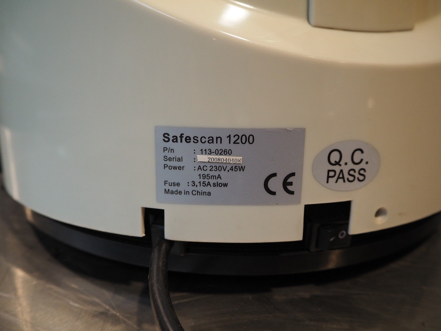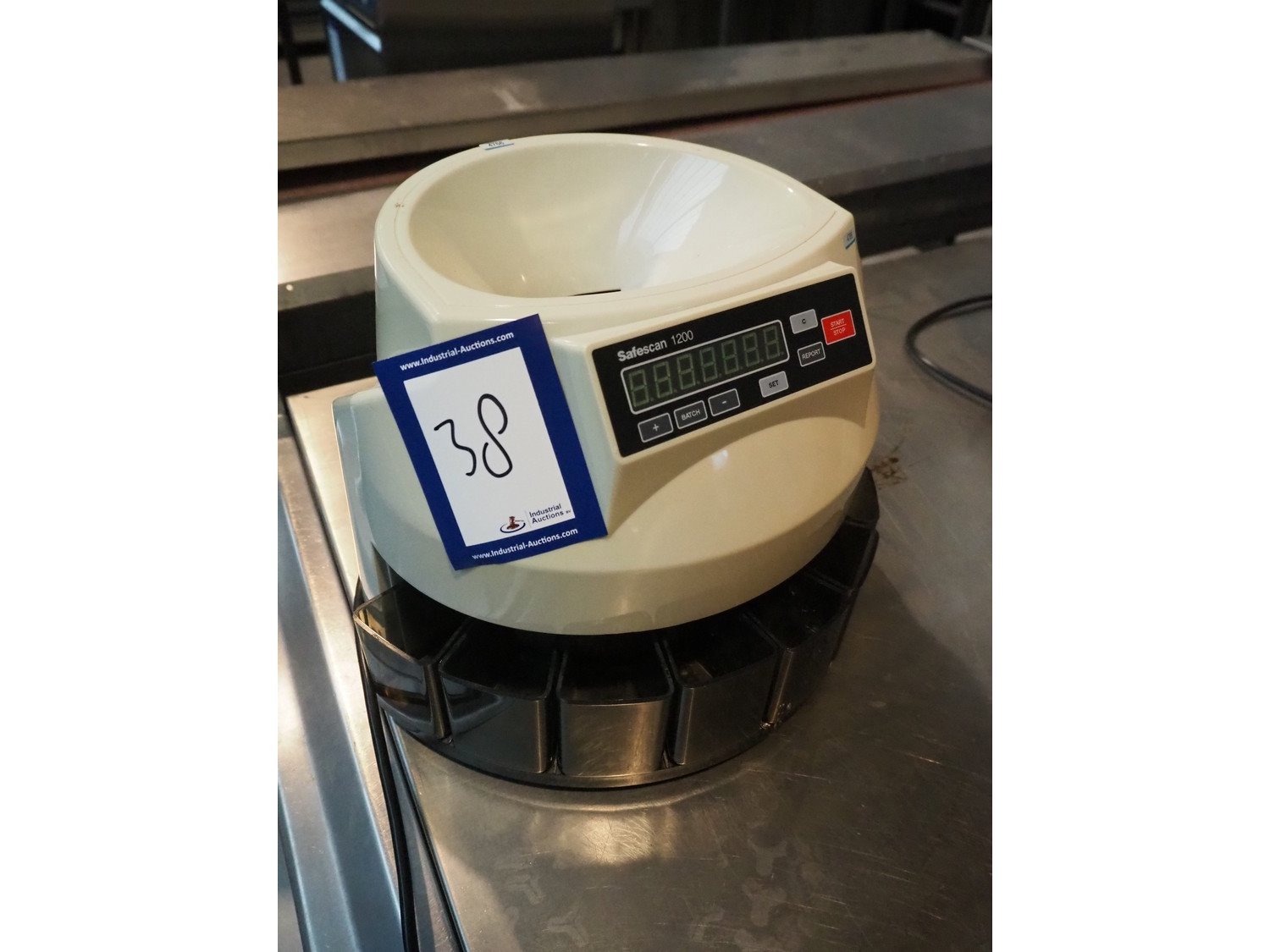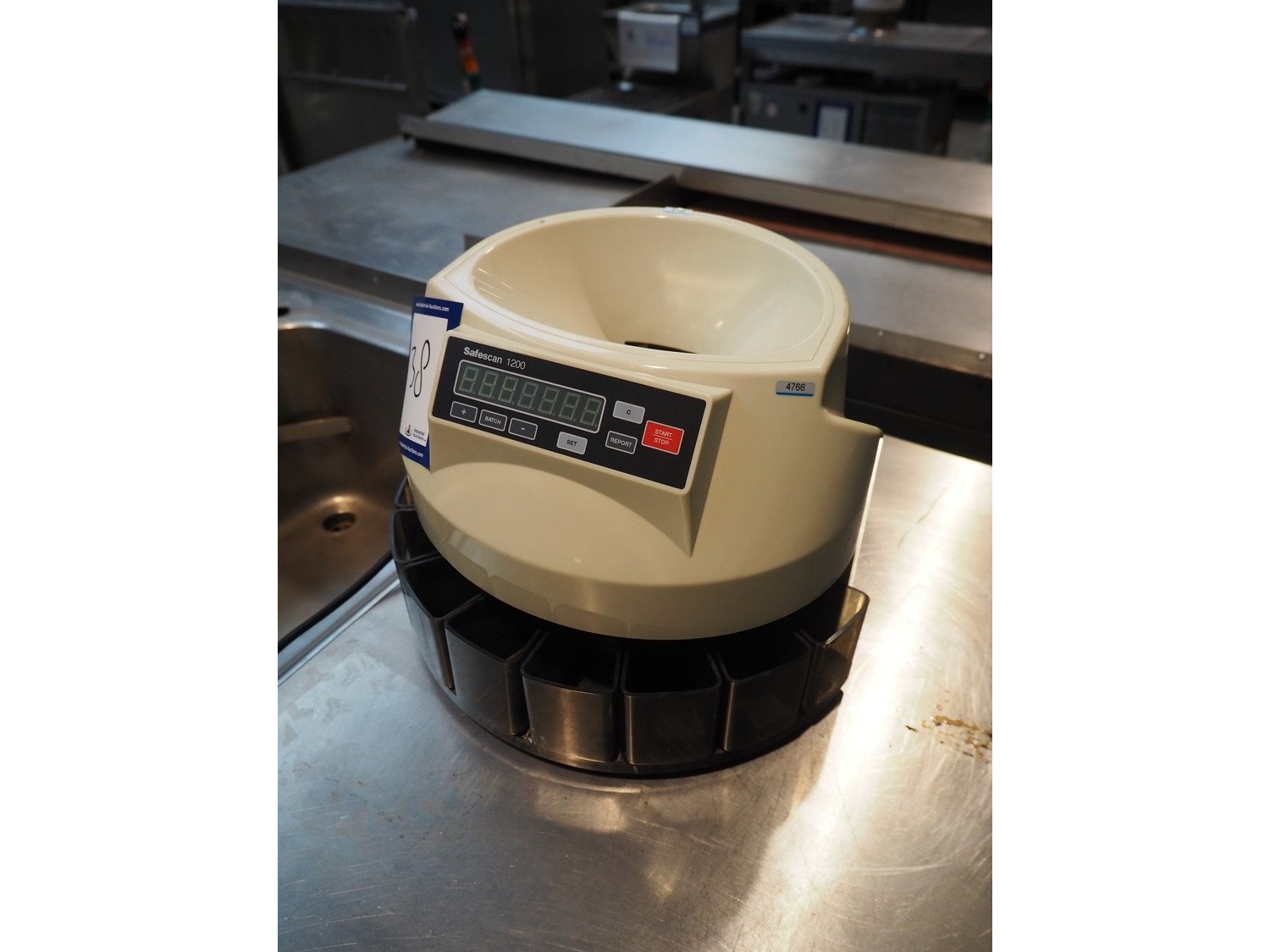 Safescan coin counter, model: 1200, serial number: 2008040408, 230 V, 3.15 A, 45 W, dimensions: 350 mm x 350 mm x 300 mm.