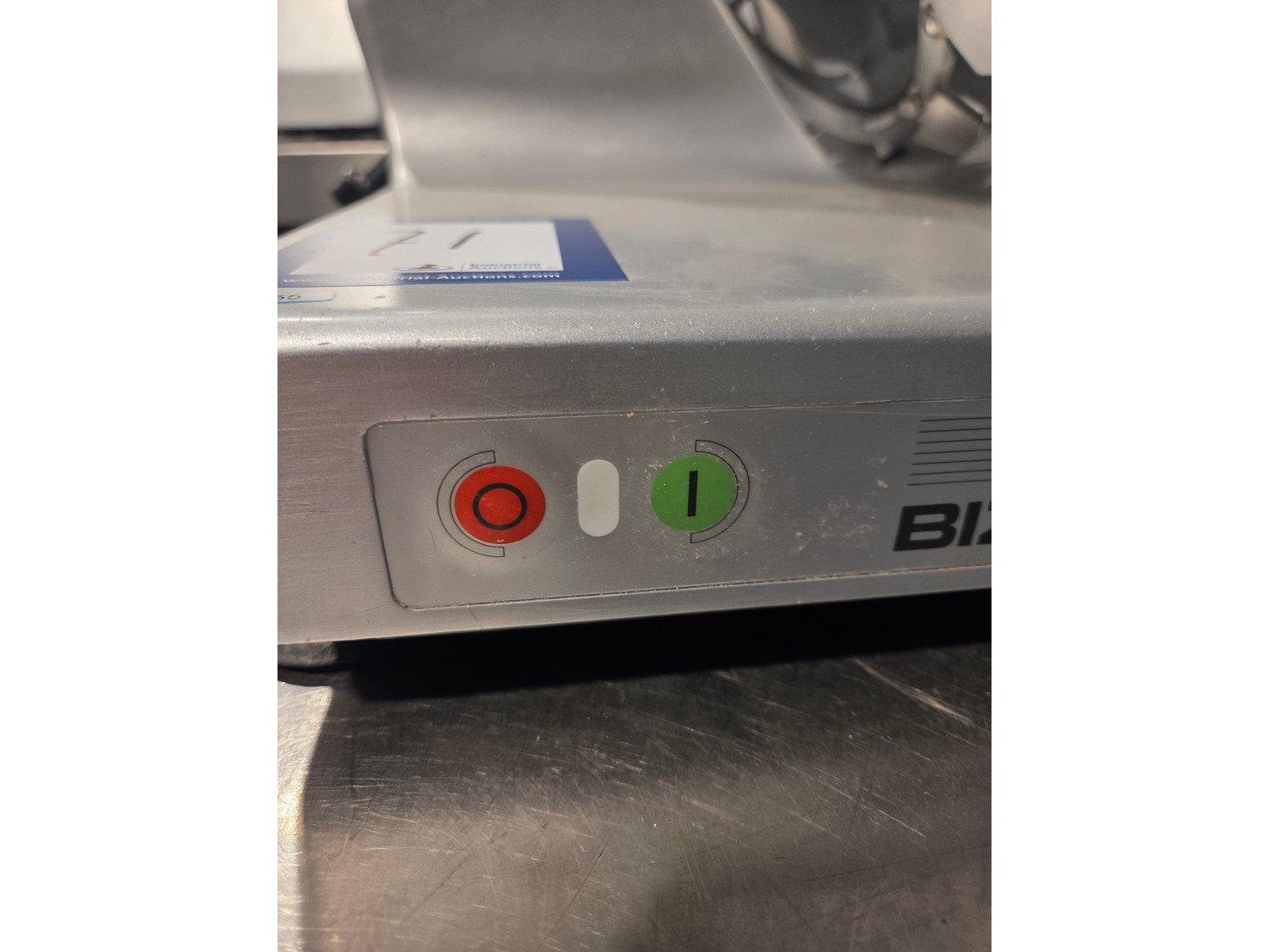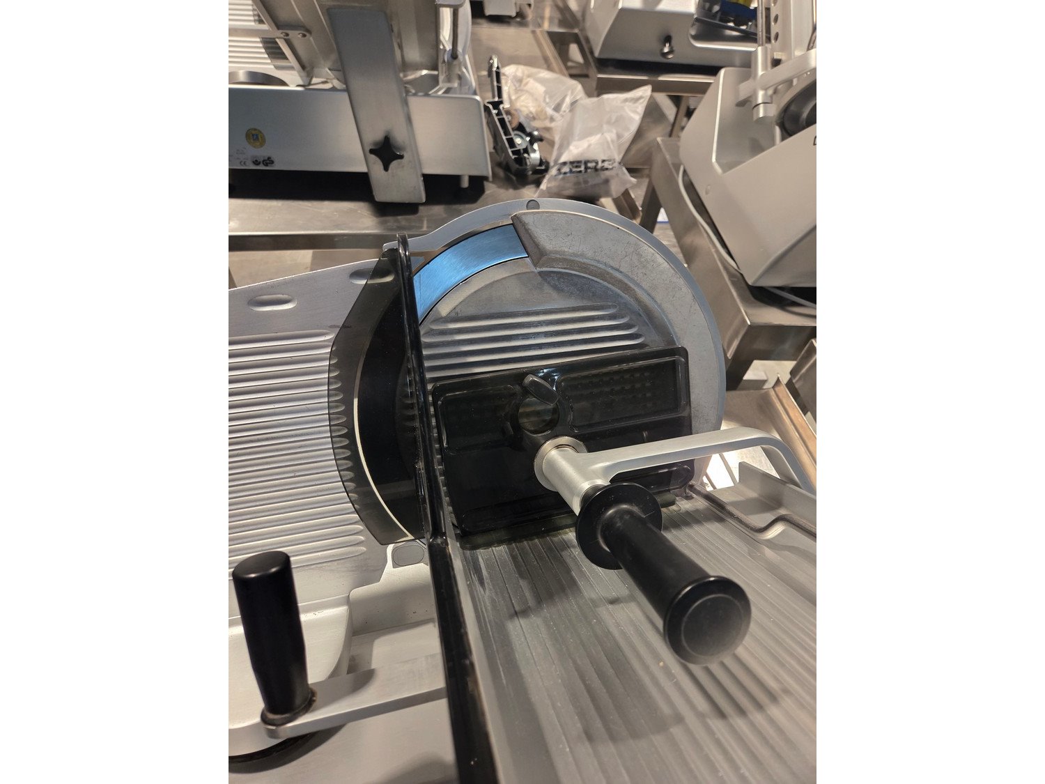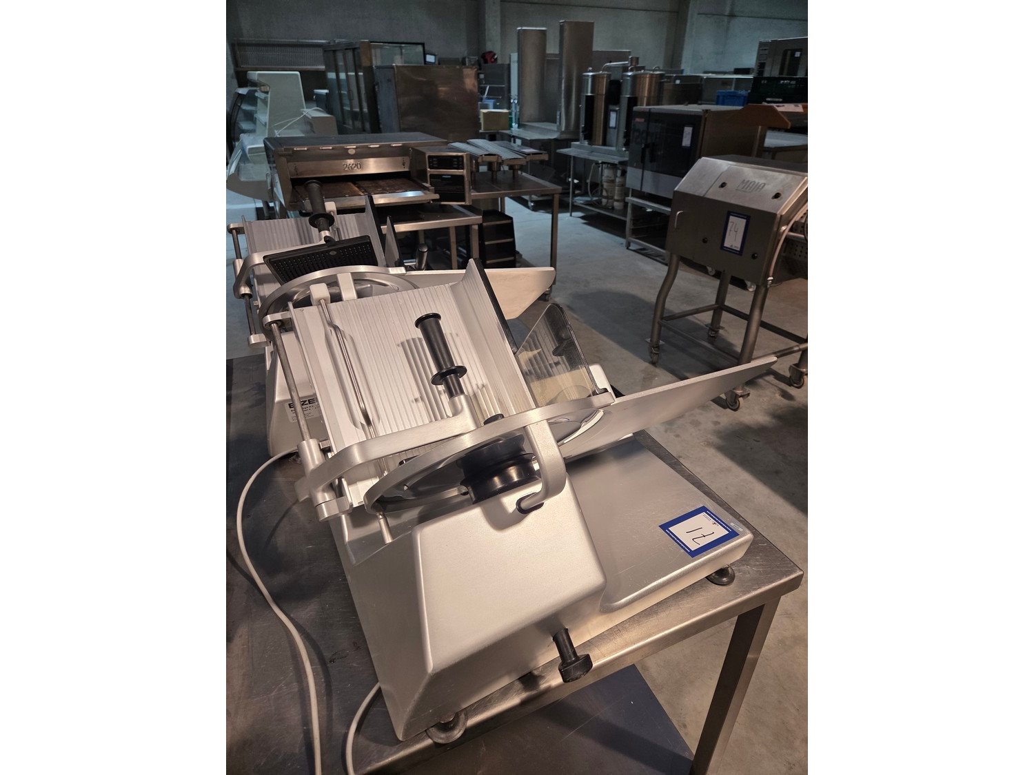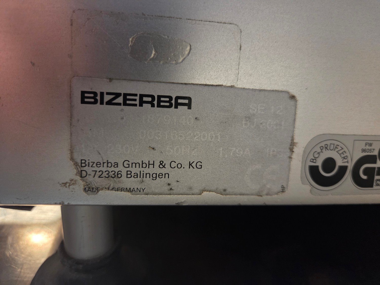 Bizerba slicer, model: SE12, serial number: 00316522001, year of construction: 2001, 230 V, 50 Hz, 1.79 A, dimensions: 700 mm x 600 mm x 450 mm.