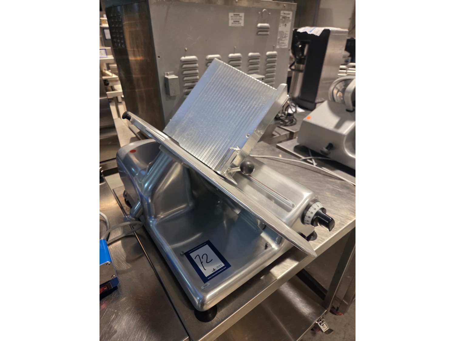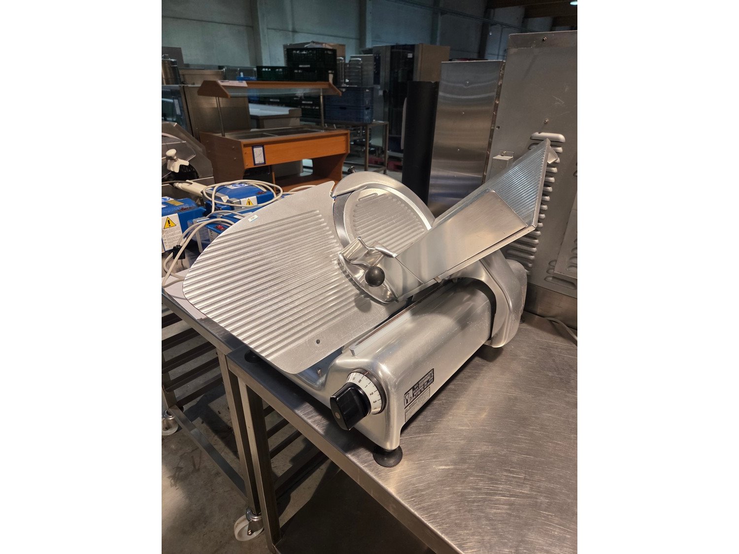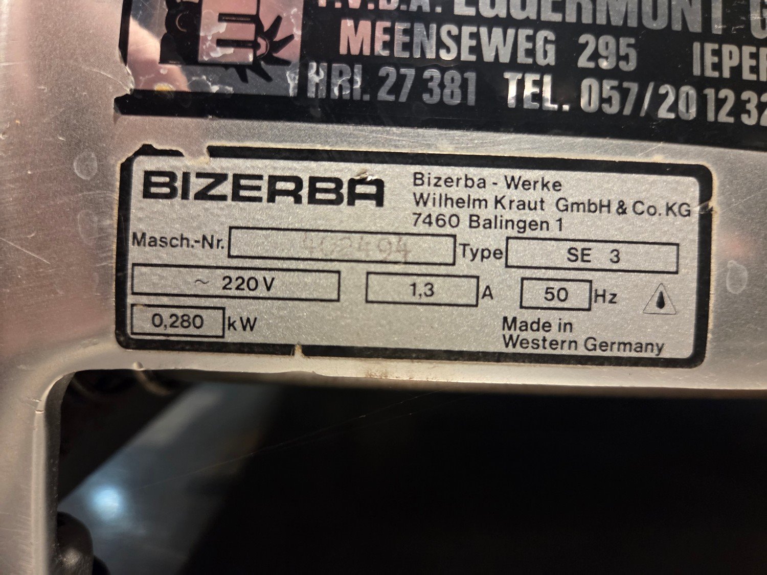 Bizerba slicer, type: SE 3, machine number: 402494, 220 V, 50 Hz, 1.3 A, 0.280 kW, dimensions: 730 mm x 450 mm x 450 mm.