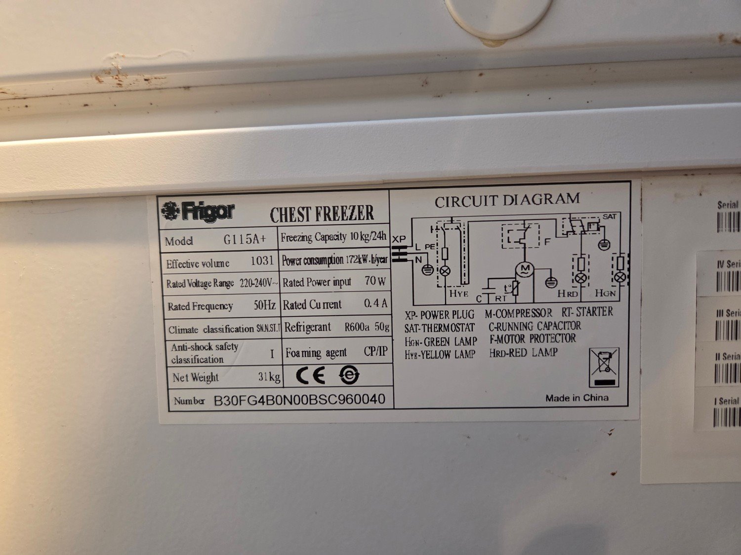 Frigor freezer, model: G115A+, number: B30FG4B0N00BSC960040, 220/240 V, 50 Hz, 0.4 A, 70 W, refrigerant: R600a, weight: 31 kg, dimensions: 550 mm x 570 mm x 850 mm.