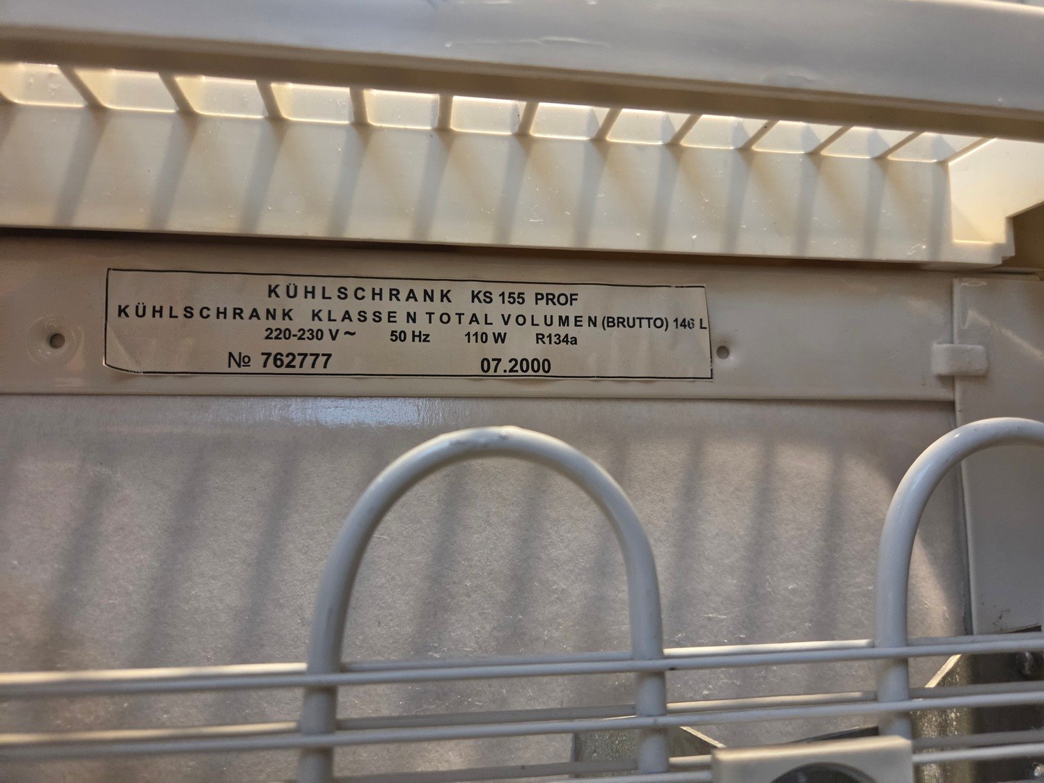 Kühlschrank refrigerator, model: KS 155 PROF, serial number: 762777, year of construction: 07.2000, 220/230 V, 50 Hz, 110 W, refrigerant: R134a, 6 floors, floor dimensions: 500 mm x 340 mm, total dimensions: 630 mm x 580 mm x 840 mm.