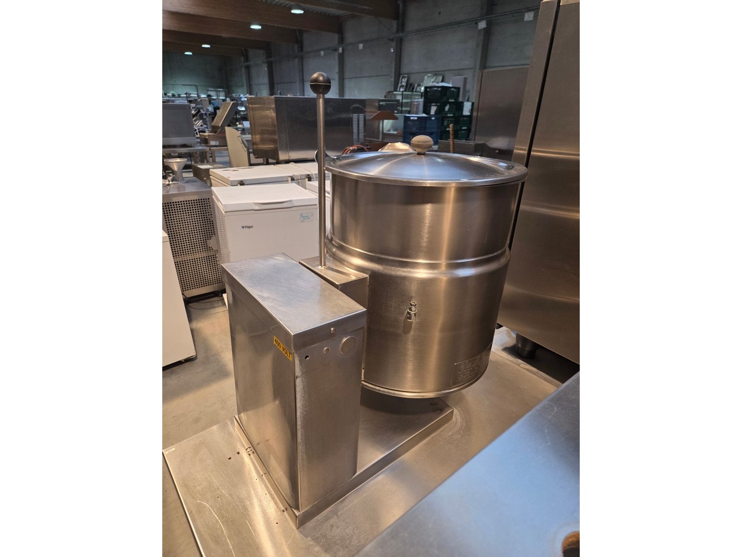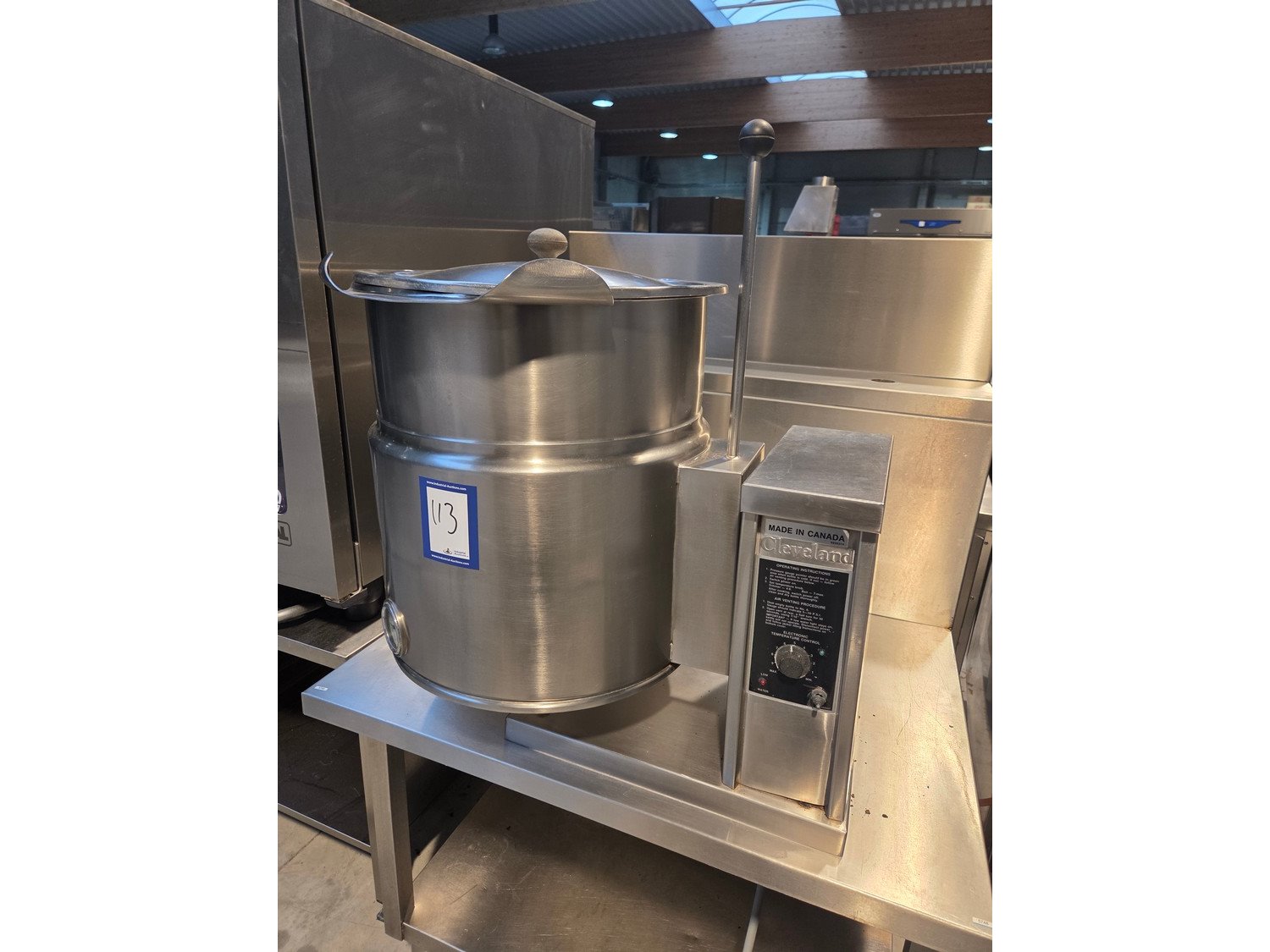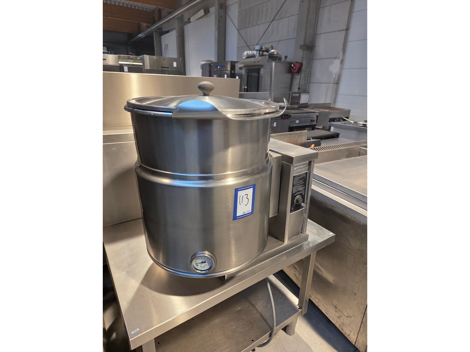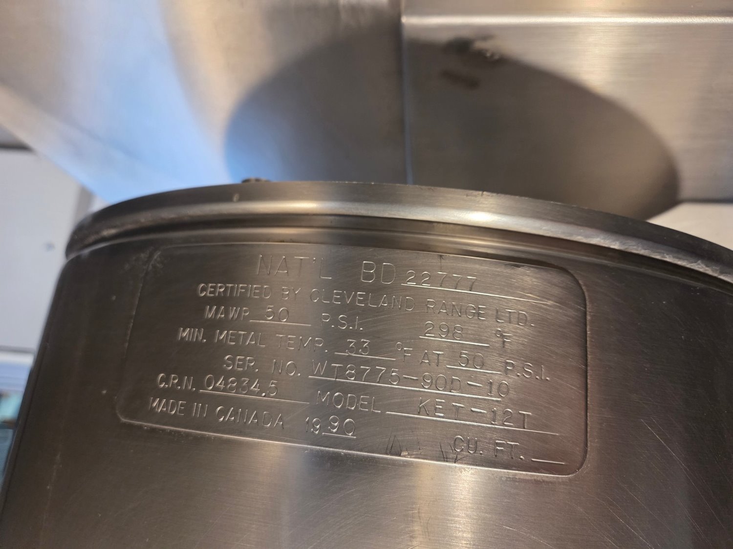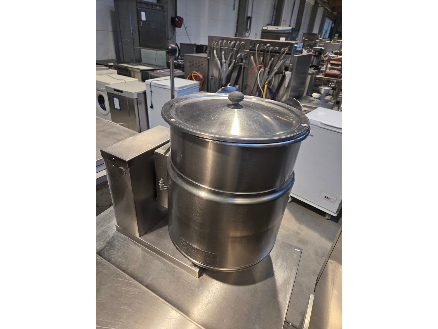 Cleveland tiltable cooking vessel on s/s table, model: KET-12T, serial number: WT8775-90D-10, year of construction: 1990, volume: 45 liter, dimensions: 1000 mm x 950 mm x 1550 mm.