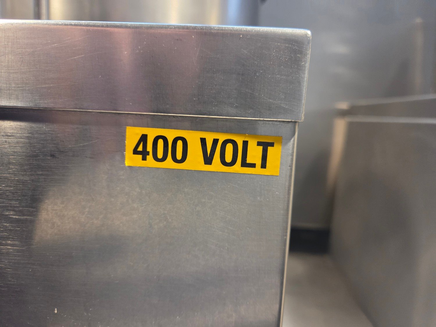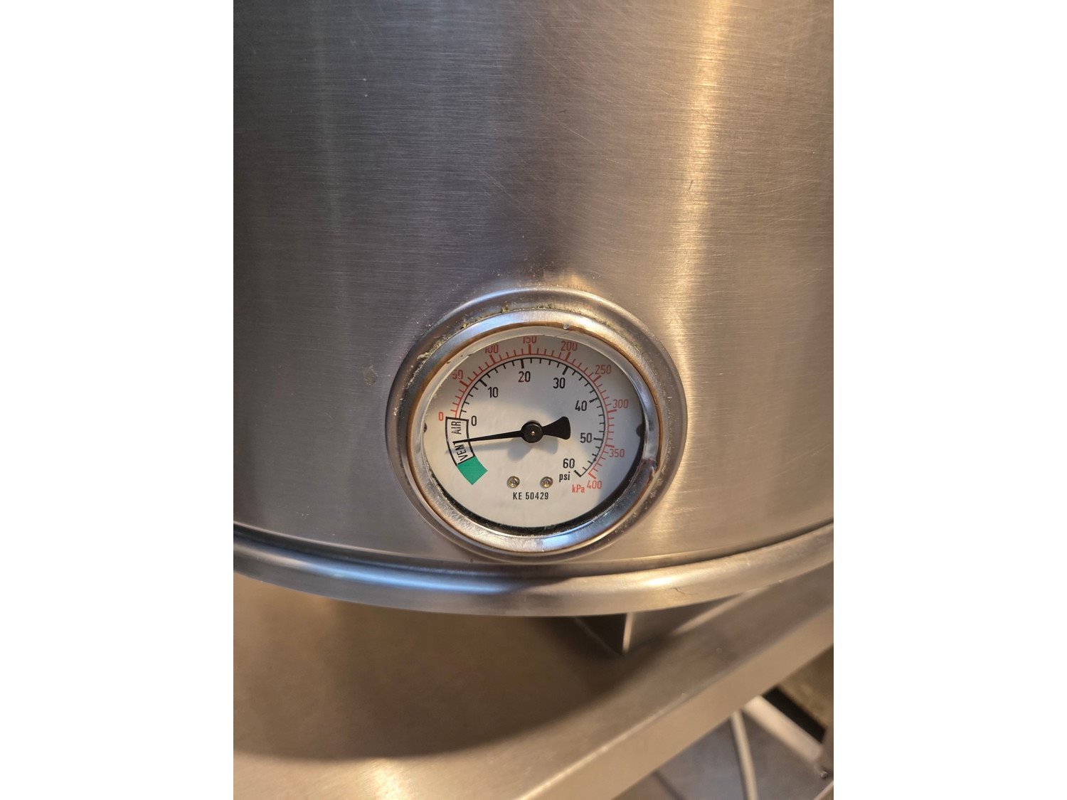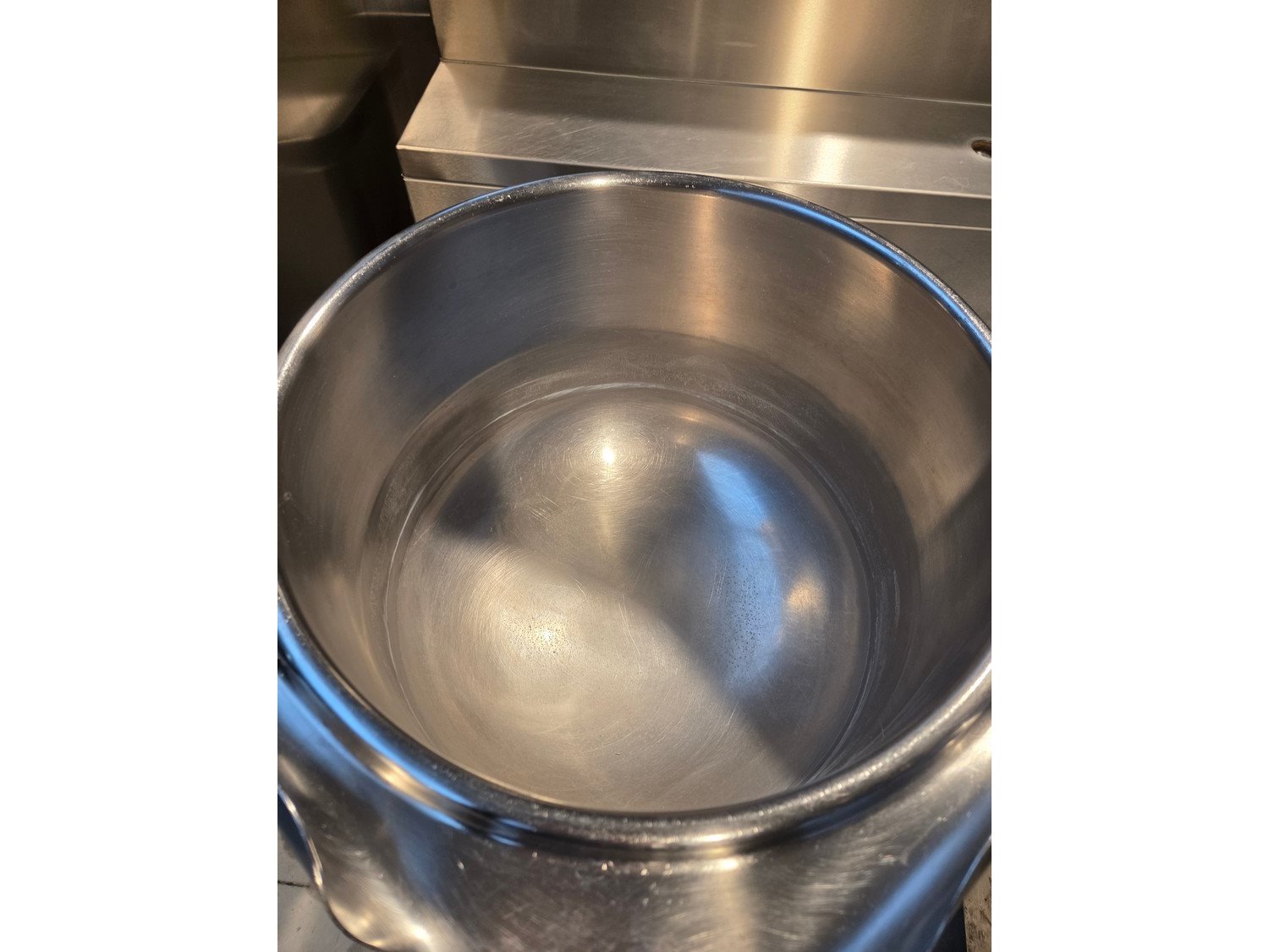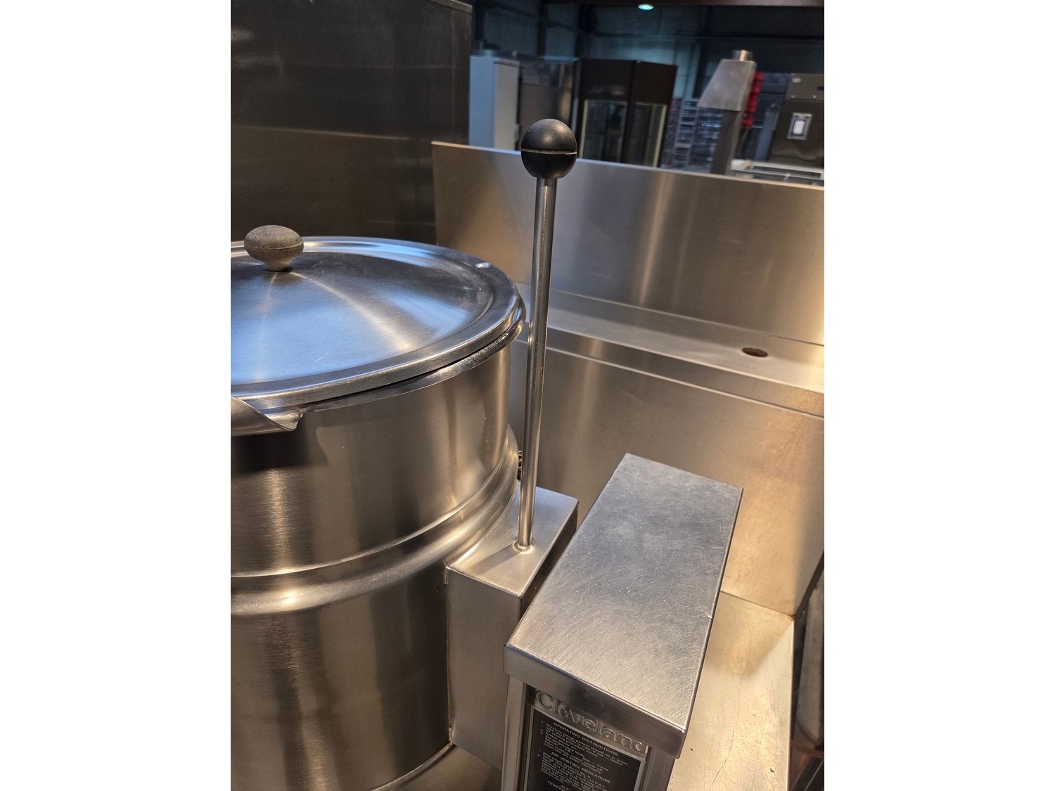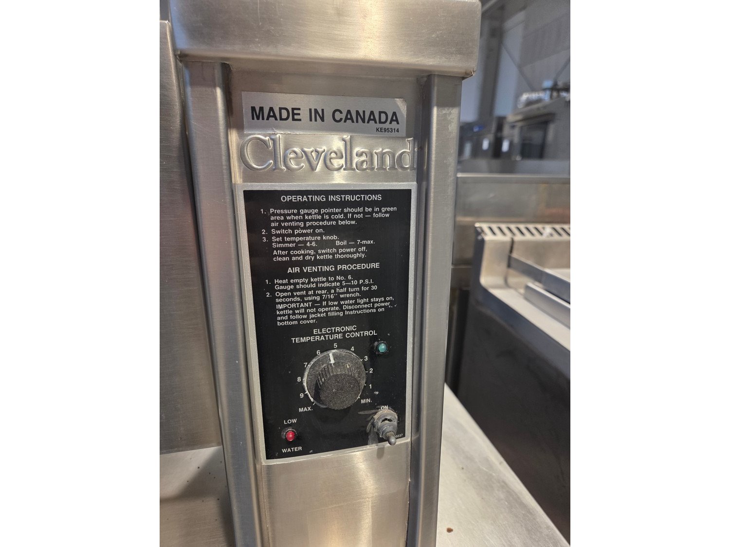 Cleveland tiltable cooking vessel on s/s table, model: KET-12T, serial number: WT8775-90D-10, year of construction: 1990, volume: 45 liter, dimensions: 1000 mm x 950 mm x 1550 mm.