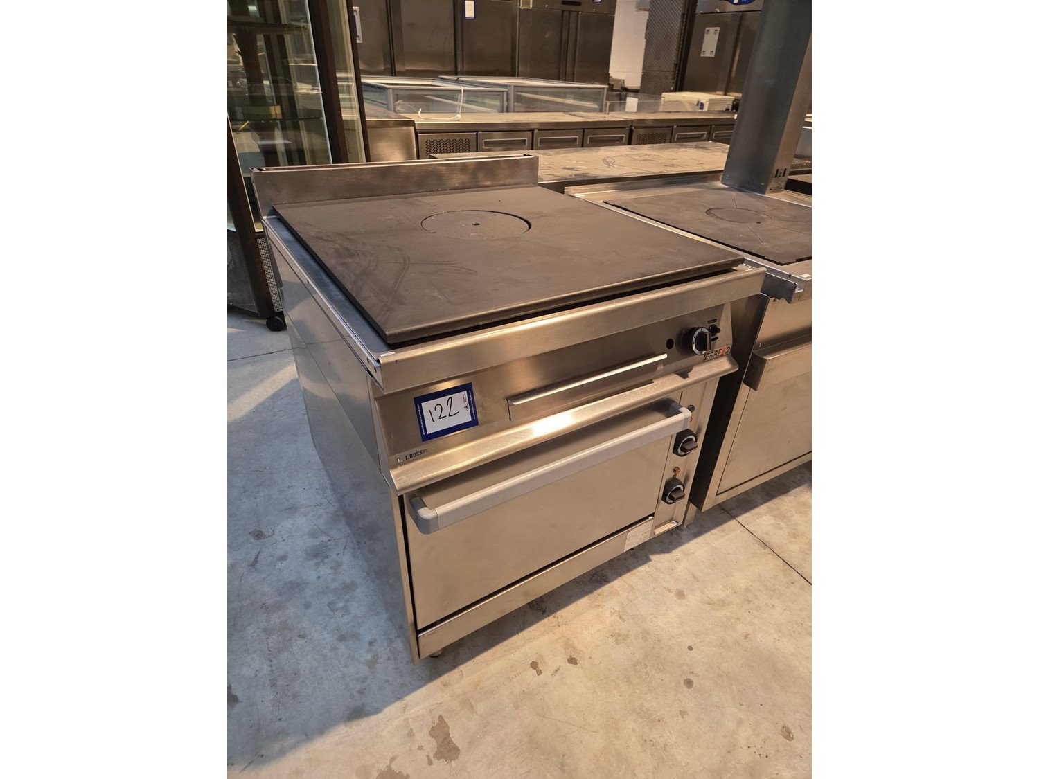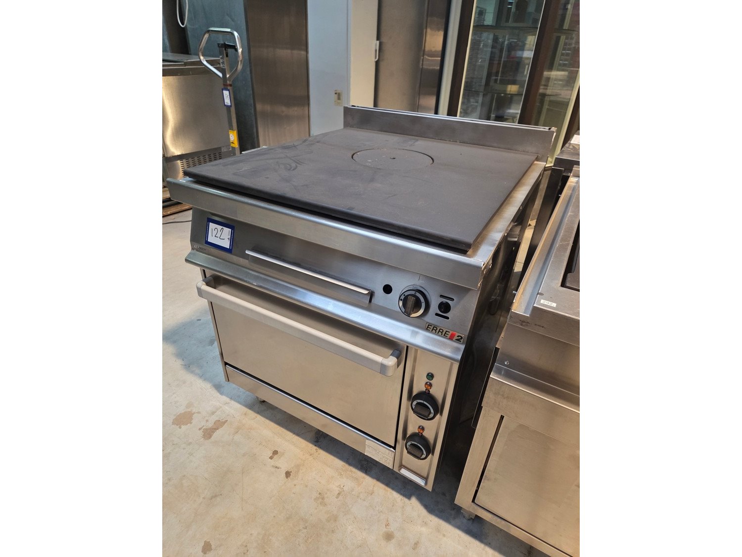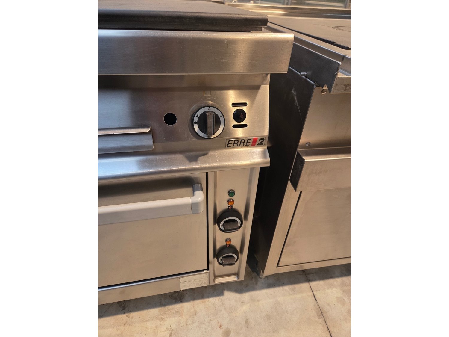 ERRE 2 srl gas stove with oven, model: 90/200 FE, number: OM12057002, 400 V, 3 Ph, 50 Hz, 6.55 kW, dimensions: 800 mm x 900 mm x 970 mm.