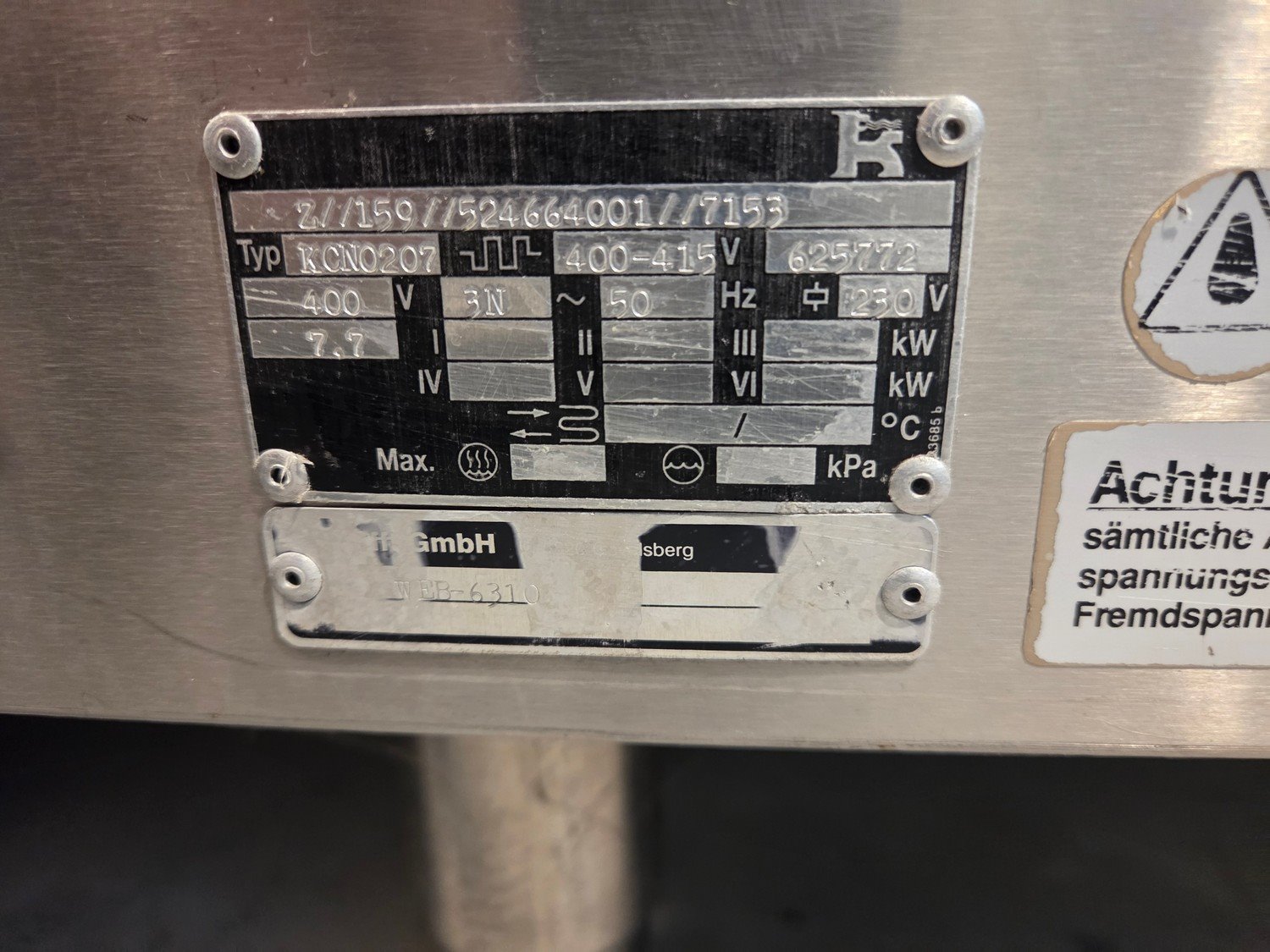 Krefft induction plate, type: KCN0207, number: 625772, 400-415 V, 3 Ph, 50 Hz, plate dimensions: 715 mm x 575 mm, total dimensions: 850 mm x 800 mm x 1080 mm.