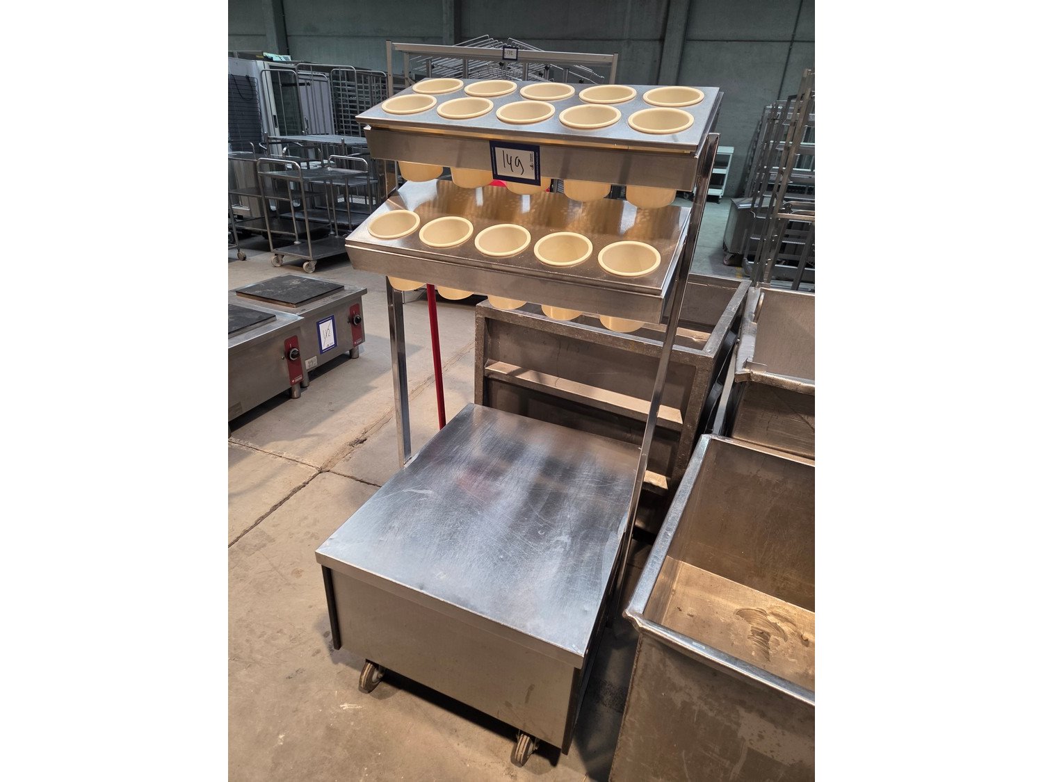 S/s cup holder trolley for 15 cups, cup dimensions: Ø95 mm x 140 mm, dimensions: 800 mm x 705 mm x 1490 mm. Missing 1 cup.