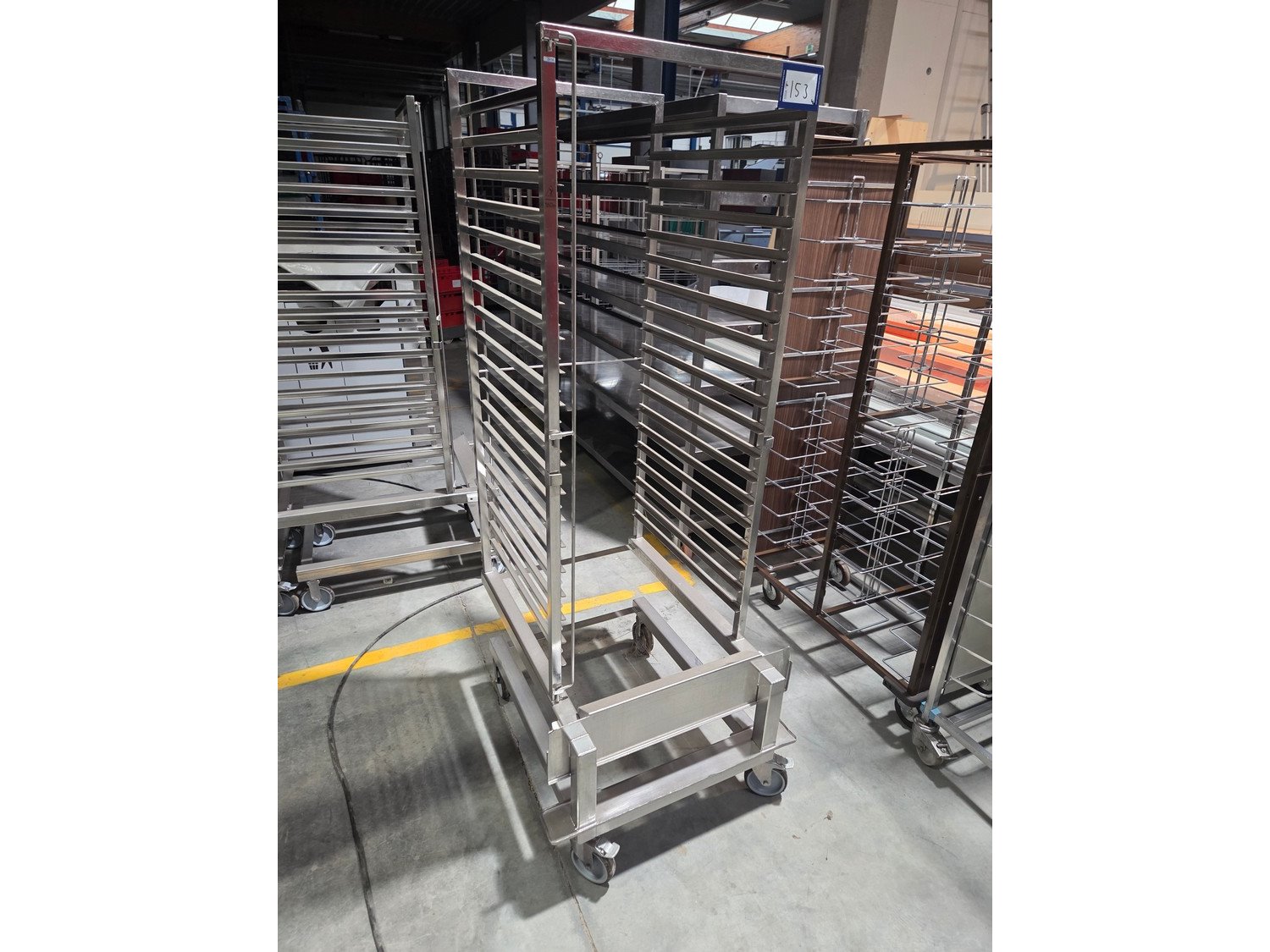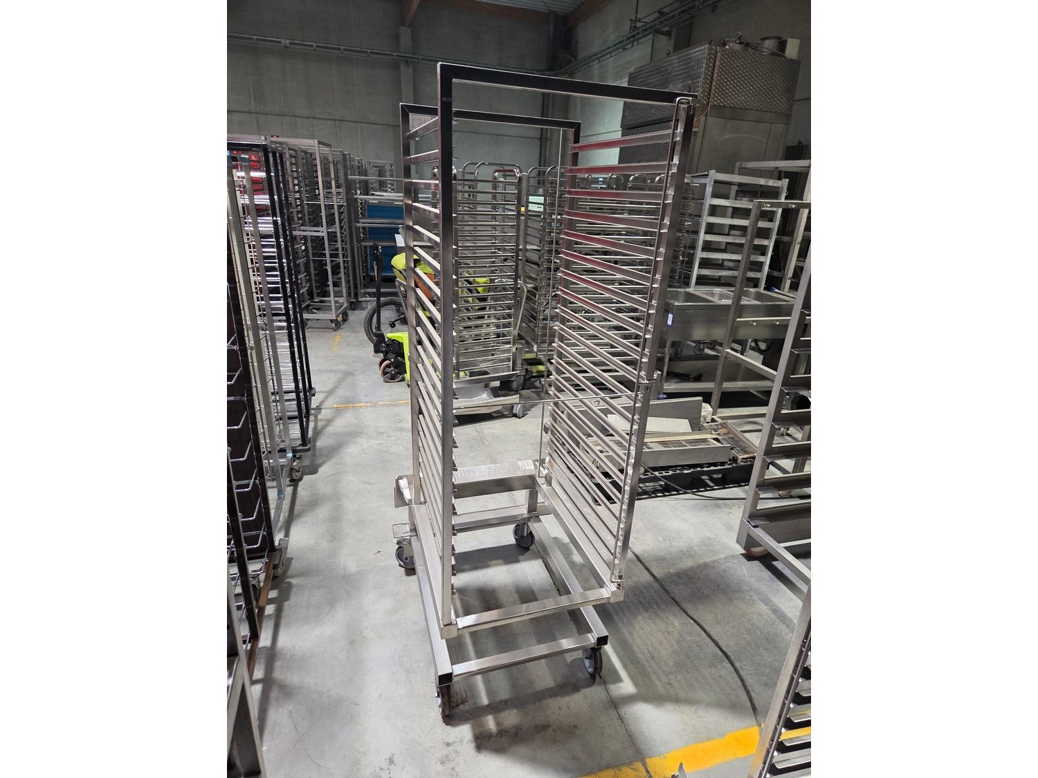 4 s/s trolleys for combi steamer, 20 floors each, dimensions floors: (20x) 650 mm x 535 mm, total dimensions: (4x) 850 mm x 750 mm x 1850 mm.