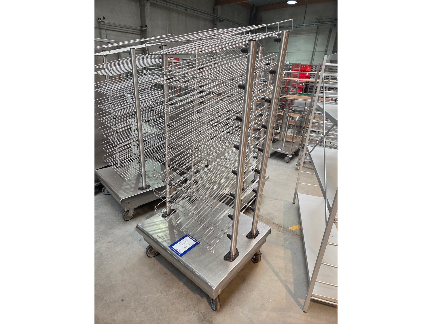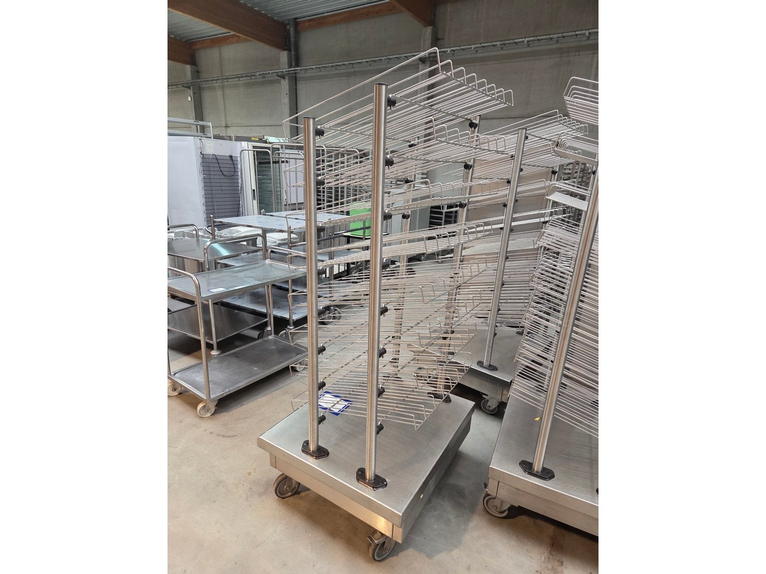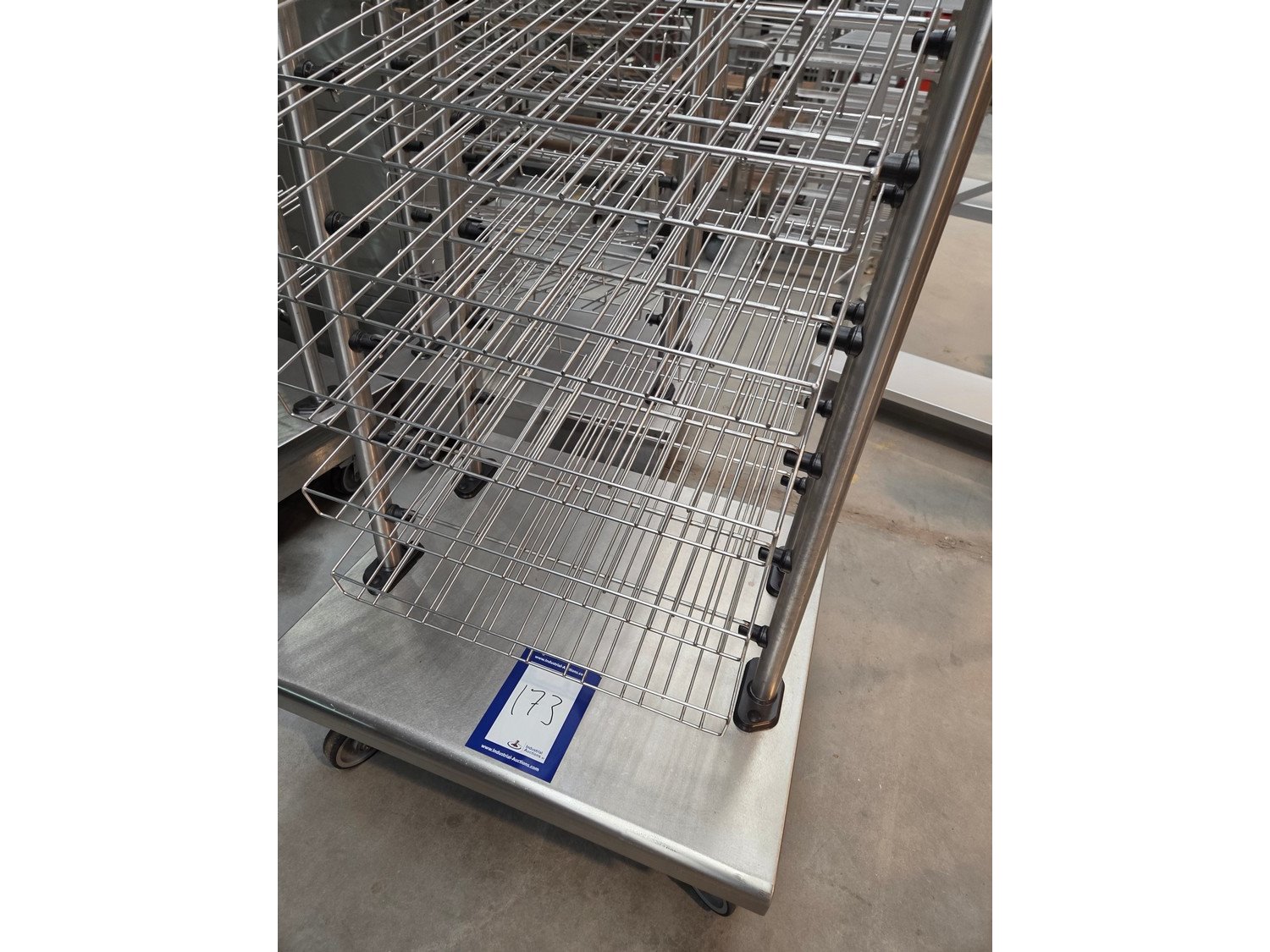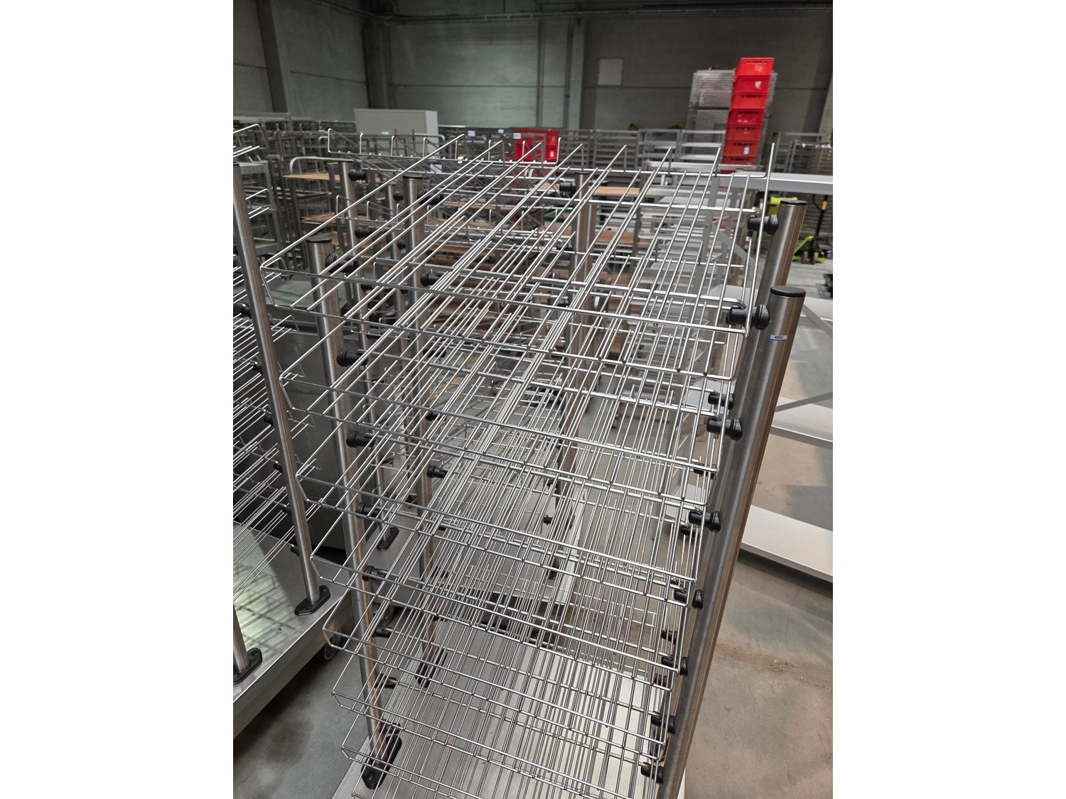 S/s trolley for glasses, 8 floors, floor dimensions: 630 mm x 650 mm, max glass diameter: 85 mm, total dimensions: 1000 mm x 800 mm x 2000 mm.