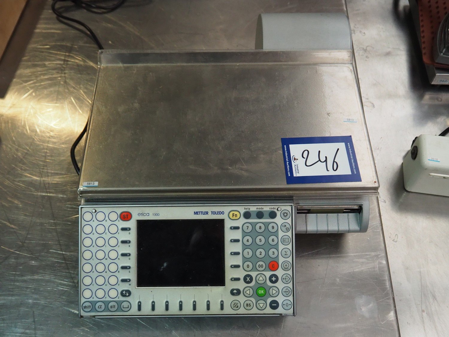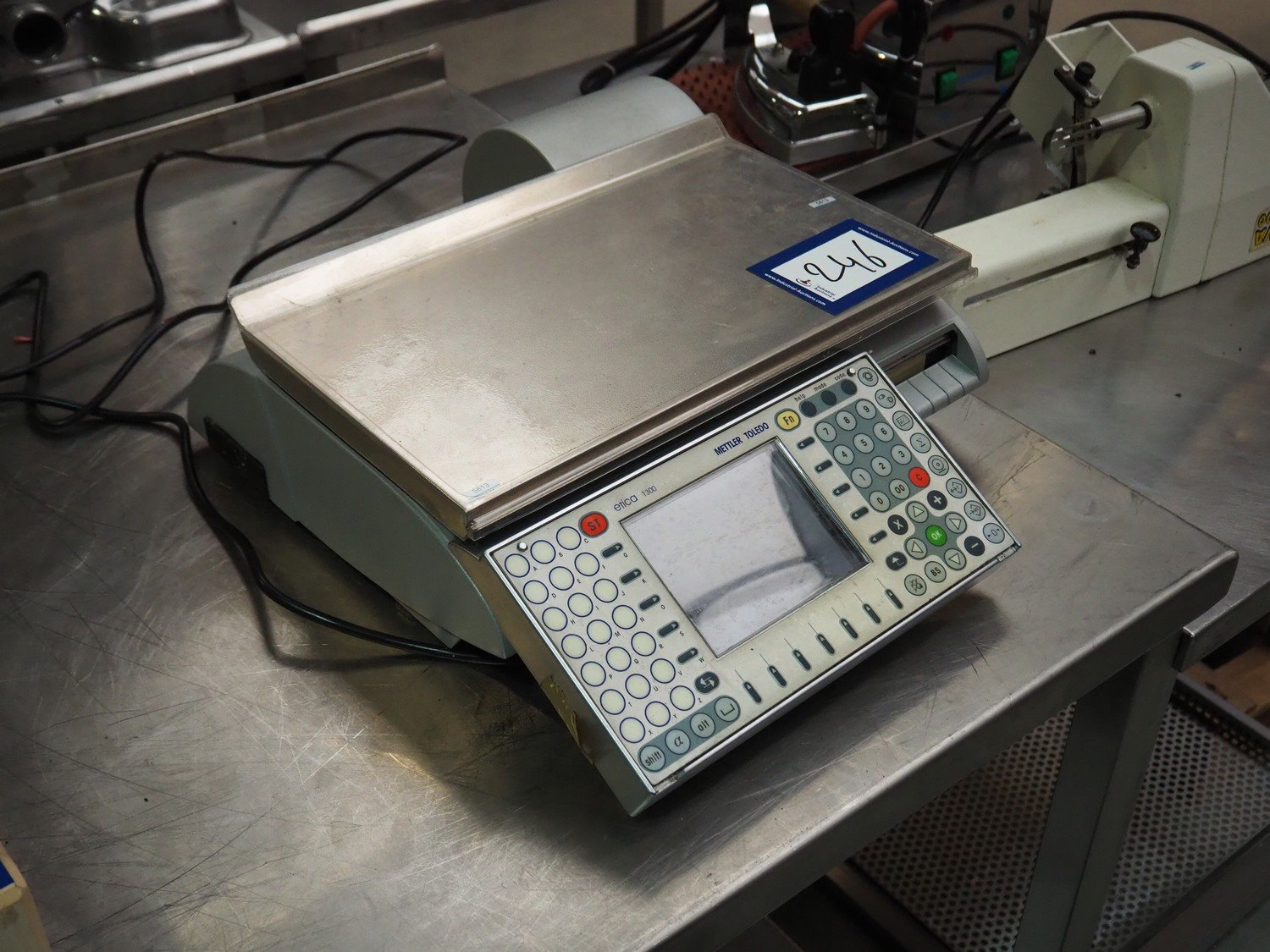 Mettler-Toledo GmbH weighing scale with label printer, type: E1300 / ETM03, serial number: 3031371, 100-240 V, 50/60 Hz, 2.2 A, minimum load: 40 g, maximum load: 6/15 kg, e=2/5 g, scale dimensions: 400 mm x 220 mm, total dimensions: 400 mm x 500 mm x 150 mm.