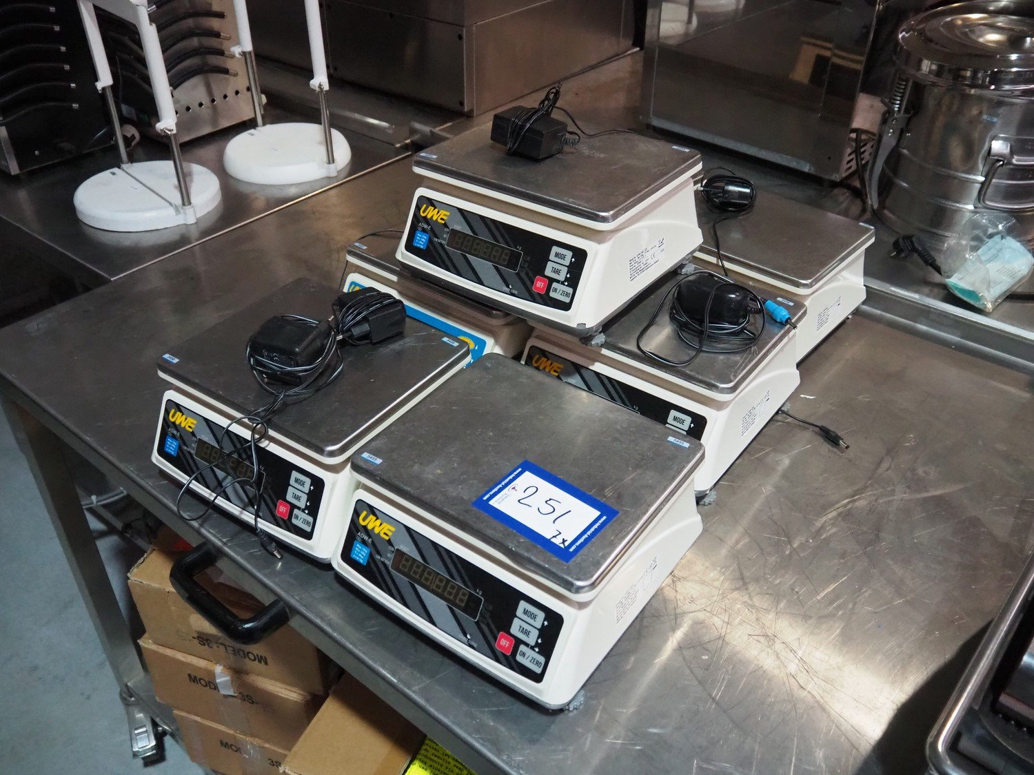 7 Uwe/Riba B.V. weighing scales, model: ADW-15KE, maximum weight: 15 kg, minimum weight: 100 gram, e=d= 5 gram, dimensions: (7x) 270 mm x 270 mm x 150 mm.