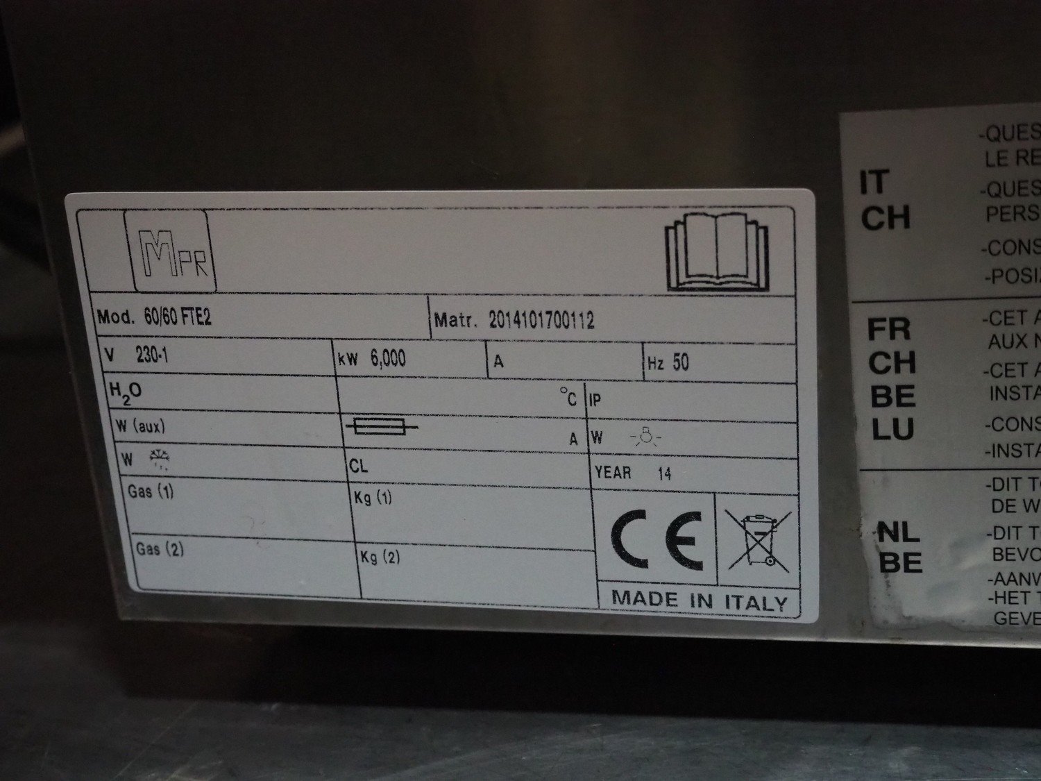Diamond/MPR grill, model: 60/60 FTE2, number: 2014101700112, year of construction: 2014, 230 V, 1 Ph, 50 Hz, 6 kW, grill dimensions: 595 mm x 470 mm, total dimensions: 630 mm x 600 mm x 420 mm.