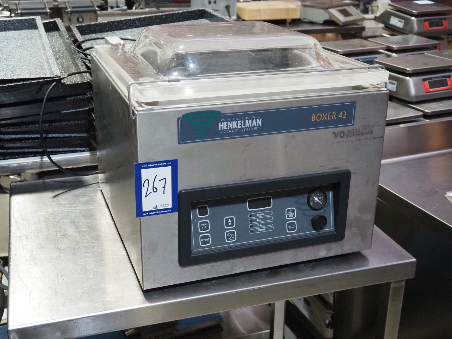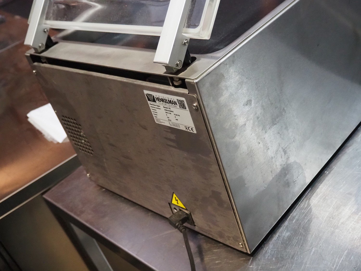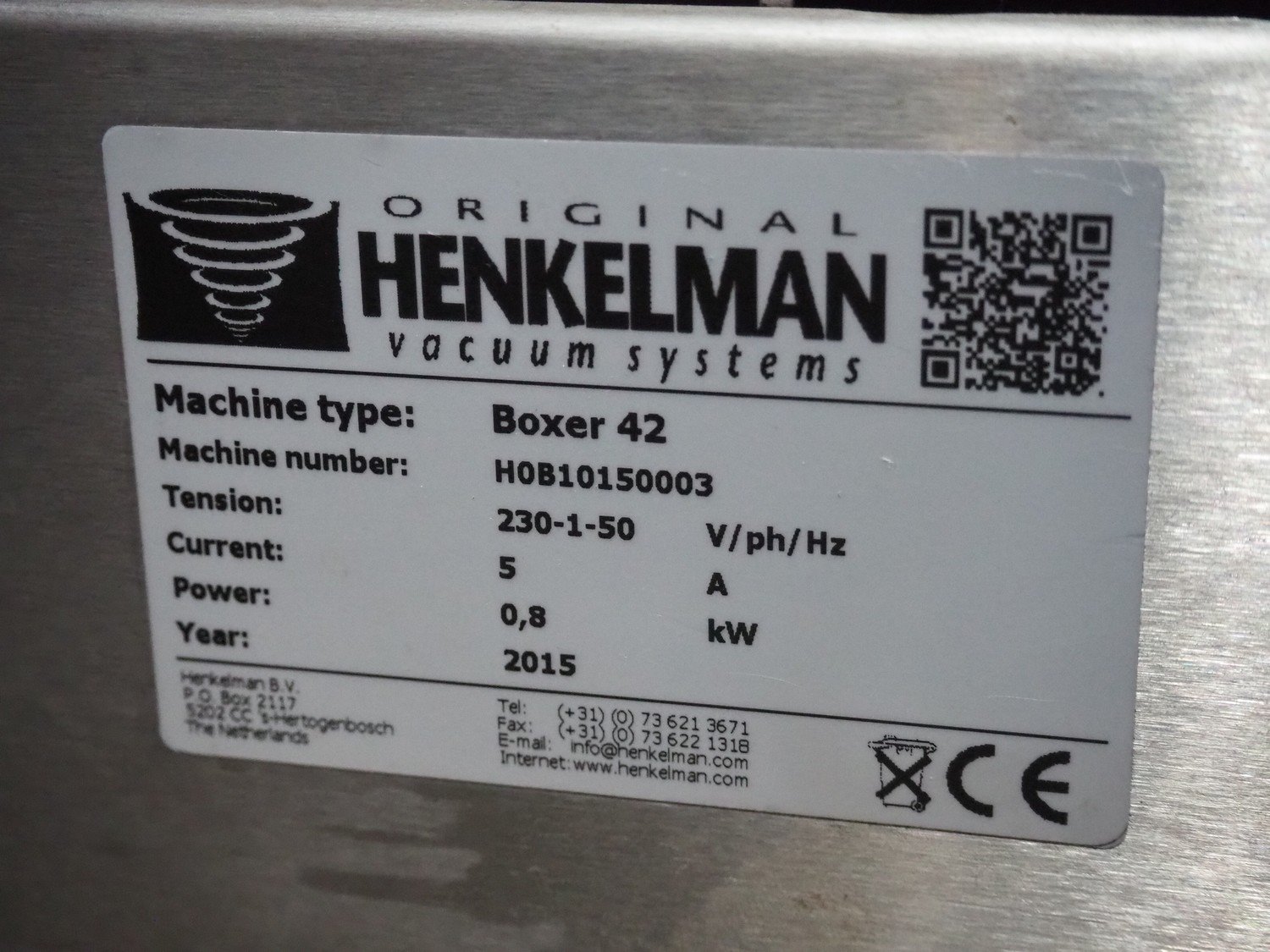 Henkelman vacuum machine, type: Boxer 42, machine number: H0B10150003, year of construction: 2015, 230 V, 1 Ph, 50 Hz, 5 A, 0.8 kW, chamber dimensions: 430 mm x 420 mm, seal length: 425 mm, total dimensions: 500 mm x 520 mm x 480 mm.