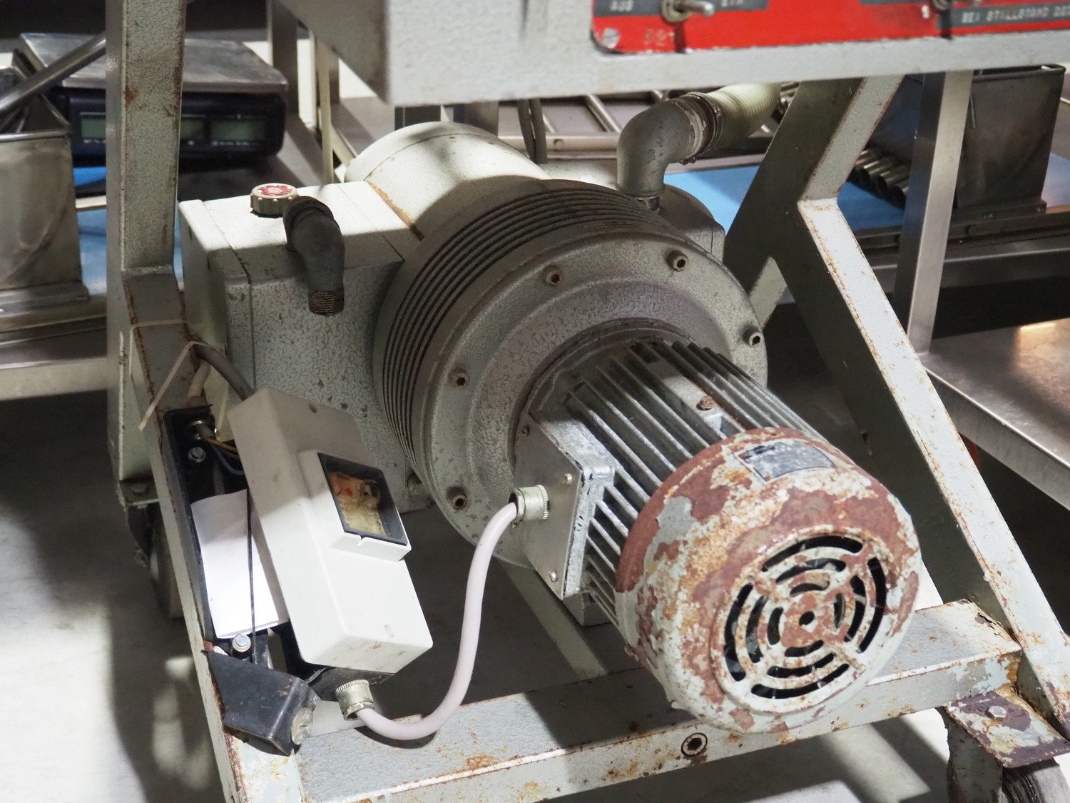 Mobile vacuum machine, dimensions chamber: 490 mm x 480 mm, seal length: 445 mm, with Rietschle vacuum pump, type: SVLE 60, number: 246261, capacity: 60 m³/h, 1400 rpm, total dimensions: 800 mm x 680 mm x 1080 mm.