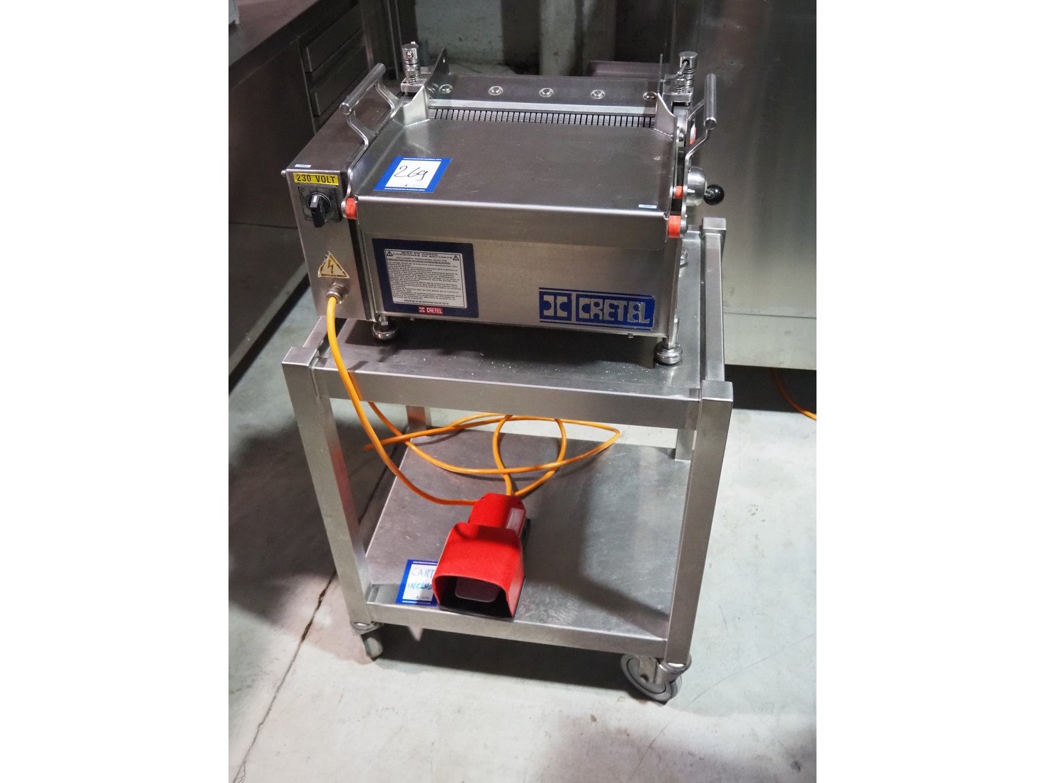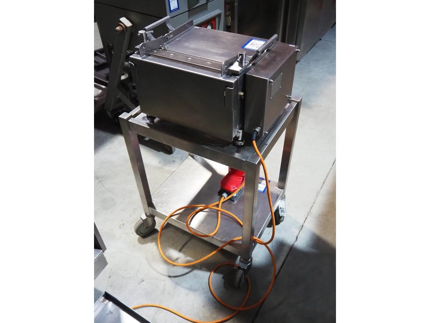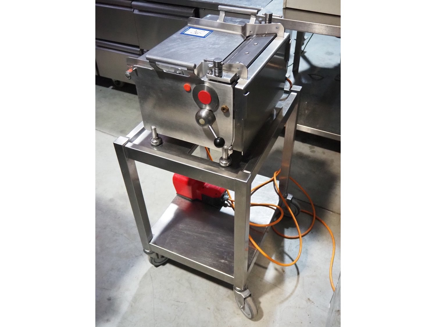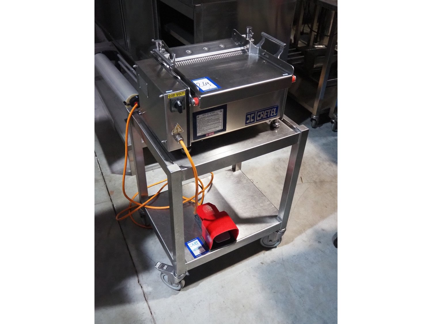 Cretel skinning machine on s/s trolley with foot control, type: 362 RK, number: 16090806, year of construction: 2006, 220/400 V, 3 Ph, 50 Hz, 3.8/2.4 A, 0.75 kW, working width: 315 mm, total dimensions: 620 mm x 605 mm x 1050 mm.