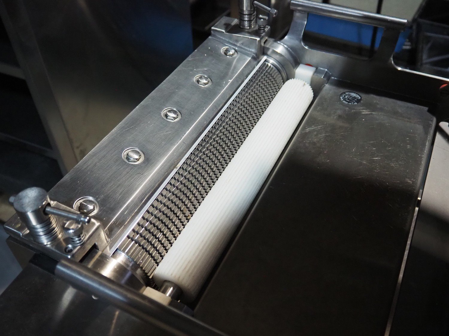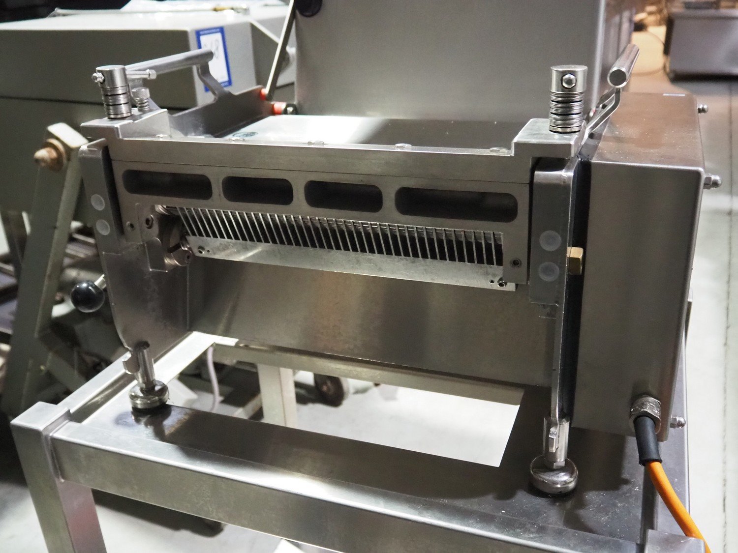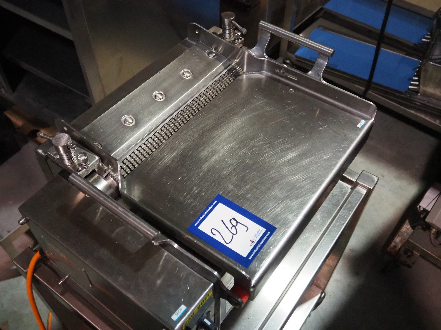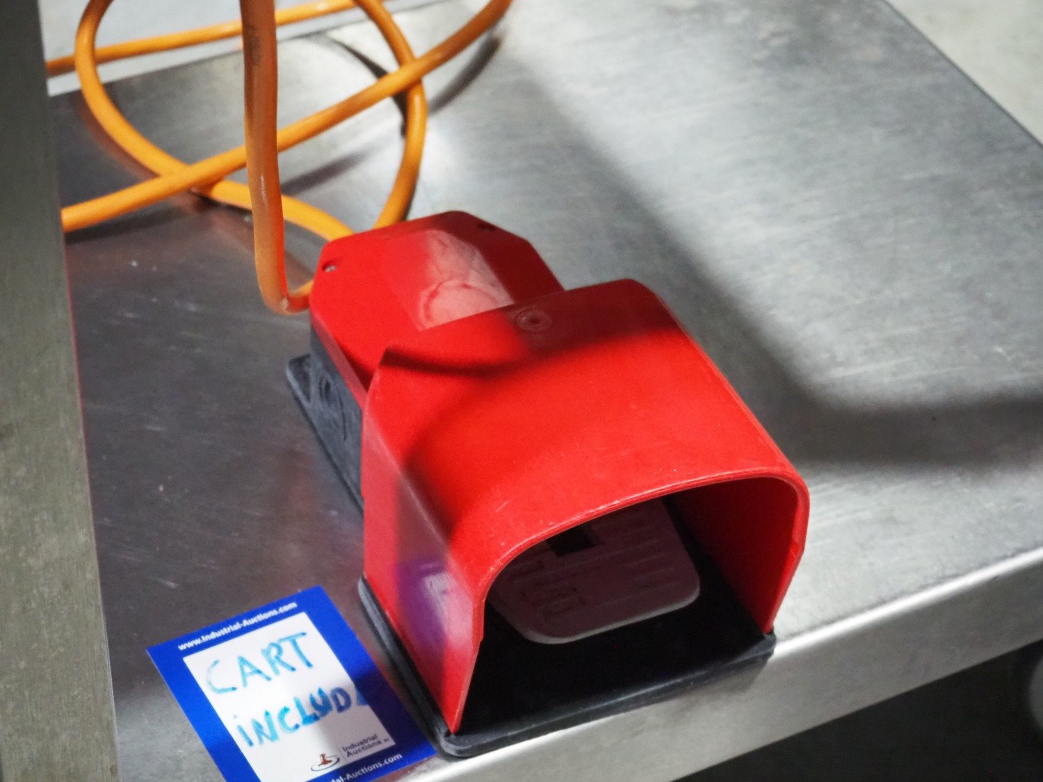 Cretel skinning machine on s/s trolley with foot control, type: 362 RK, number: 16090806, year of construction: 2006, 220/400 V, 3 Ph, 50 Hz, 3.8/2.4 A, 0.75 kW, working width: 315 mm, total dimensions: 620 mm x 605 mm x 1050 mm.