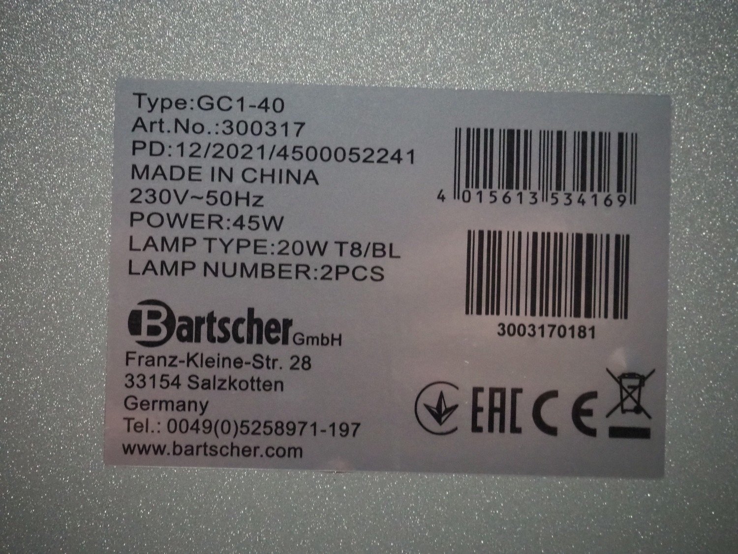 Bartscher GmbH insect killer, type: GC1-40, number: 300317, year of construction: 2012, 230 V, 1 Ph, 50 Hz, 45 W, dimensions: 640 mm x 100 mm x 370 mm.