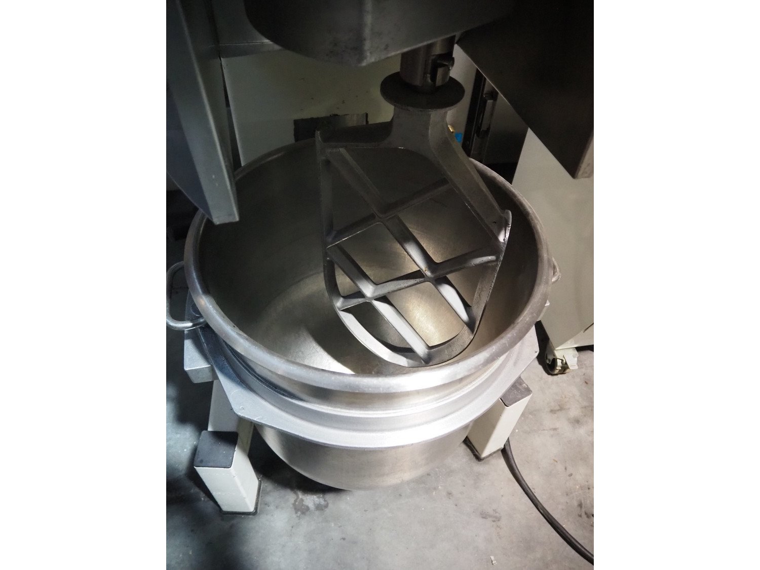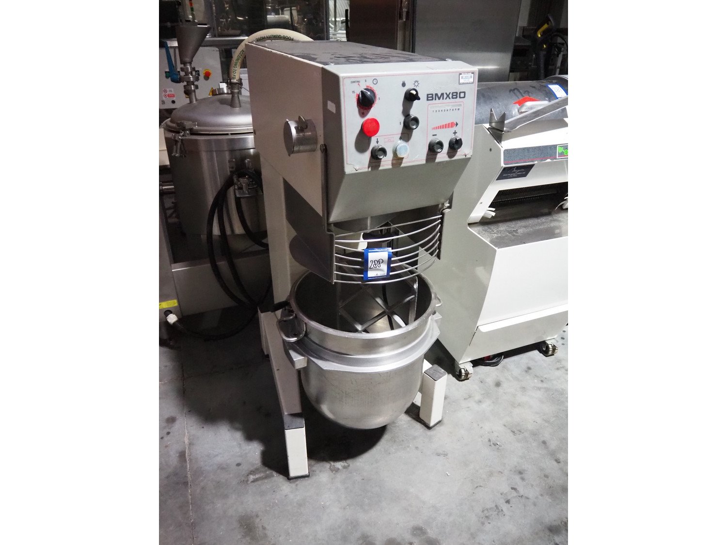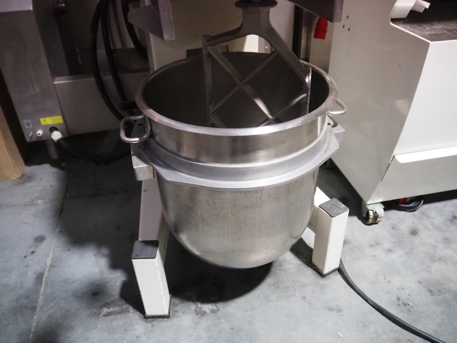 Dito-Sama planetary mixer, model: BMXE80AS, number: FF357, year of construction: 11/95, 230-400 V, 3 Ph, 50 Hz, 7.1-4.1 A, 2000 W, volume: 80 liter, dimensions: 700 mm x 1100 mm x 1450 mm. Including s/s bowl, whisk and aluminum paddle.