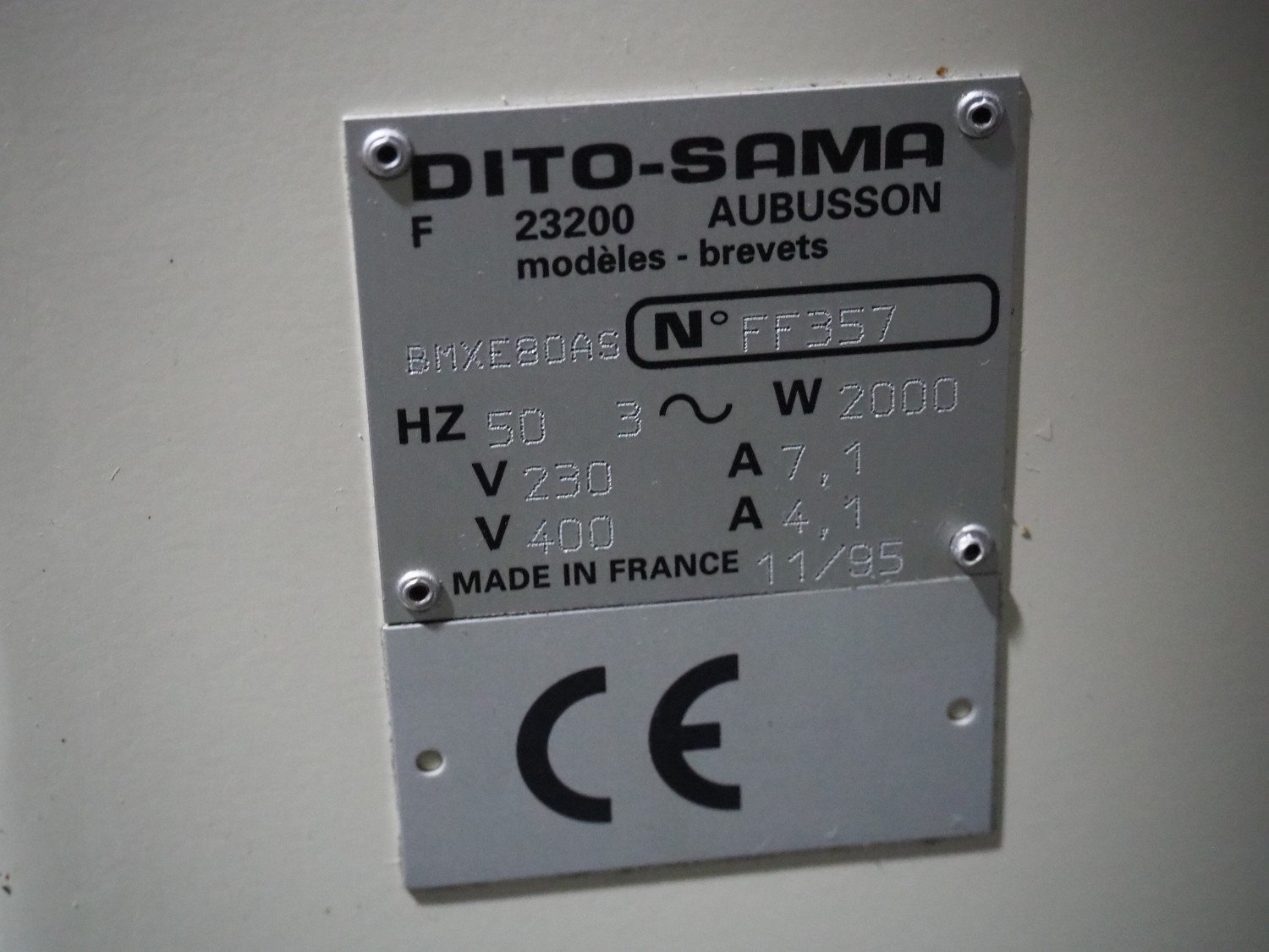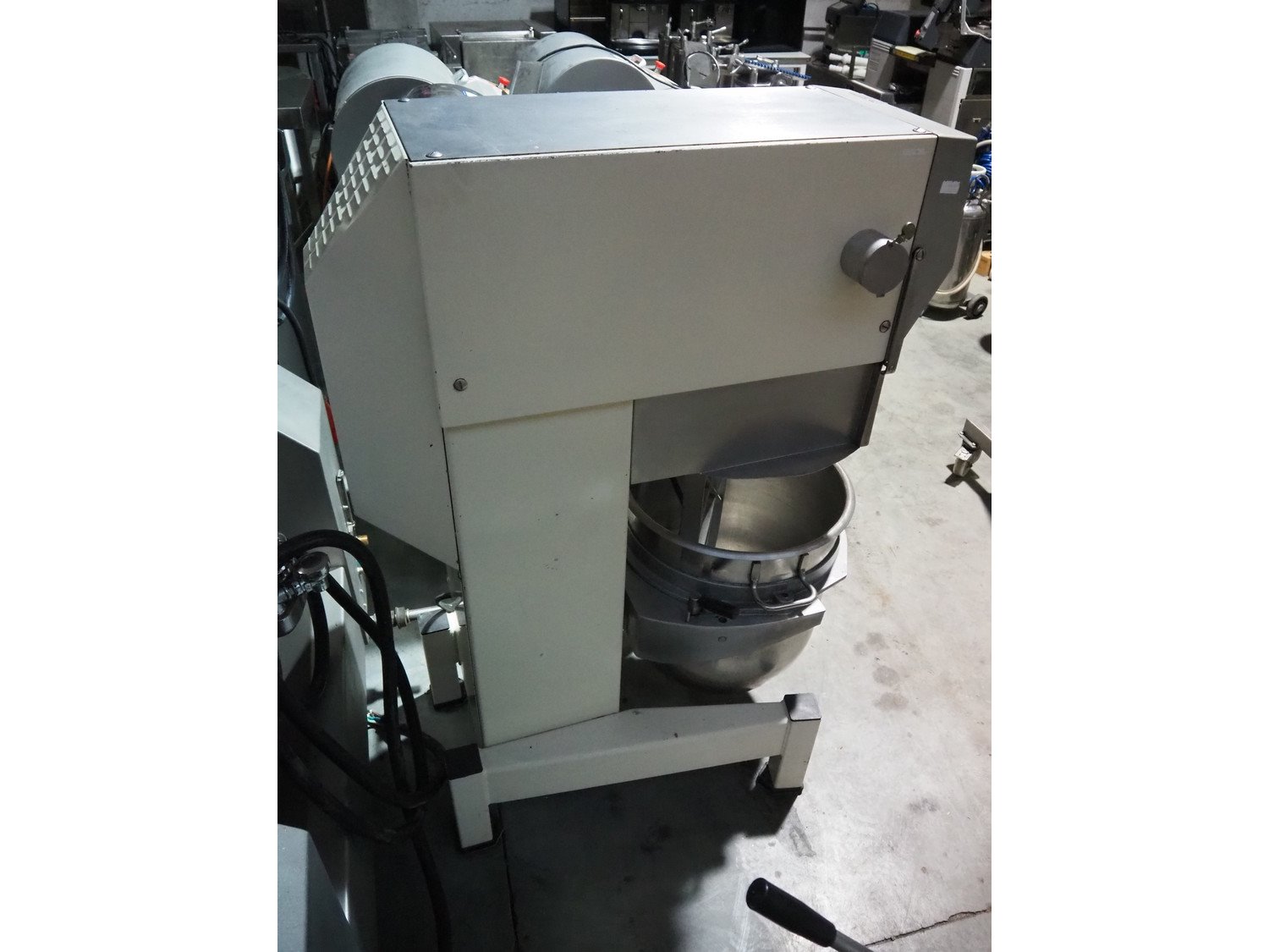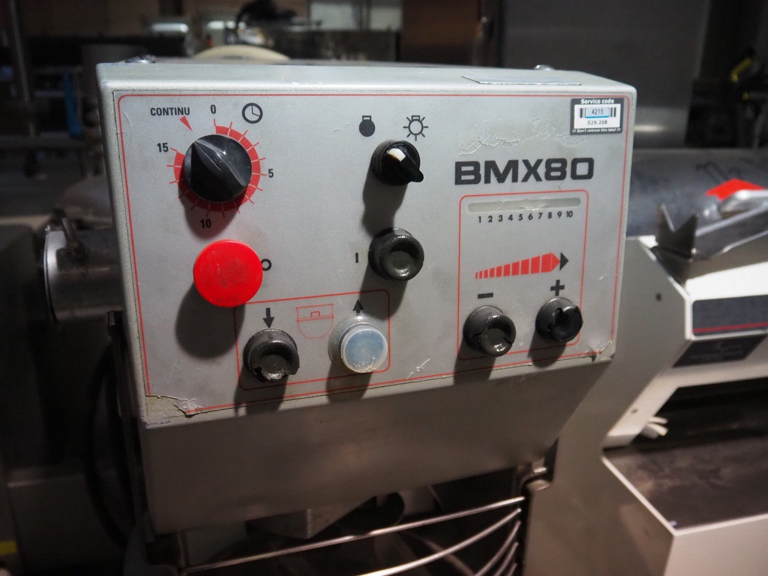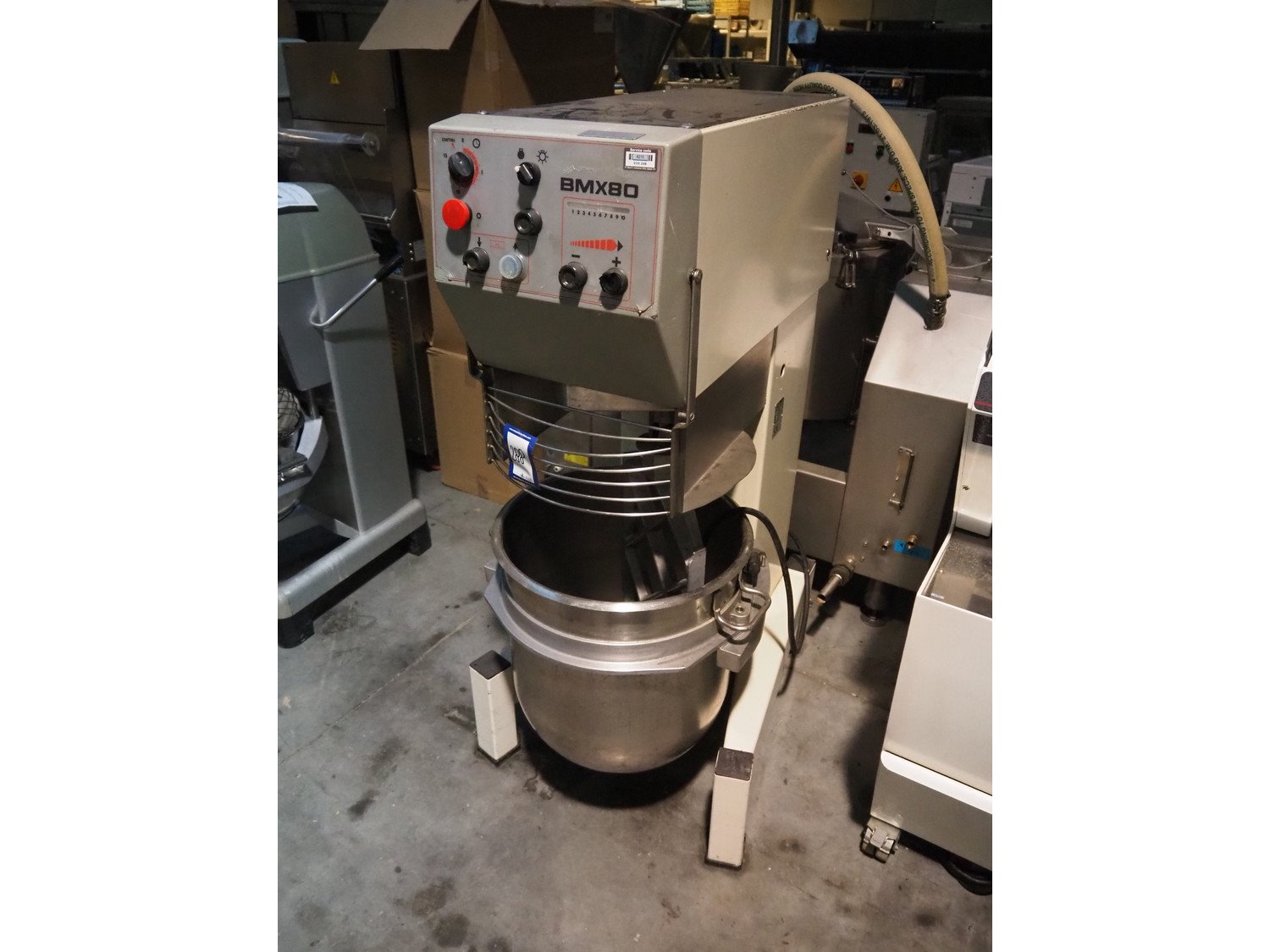 Dito-Sama planetary mixer, model: BMXE80AS, number: FF357, year of construction: 11/95, 230-400 V, 3 Ph, 50 Hz, 7.1-4.1 A, 2000 W, volume: 80 liter, dimensions: 700 mm x 1100 mm x 1450 mm. Including s/s bowl, whisk and aluminum paddle.