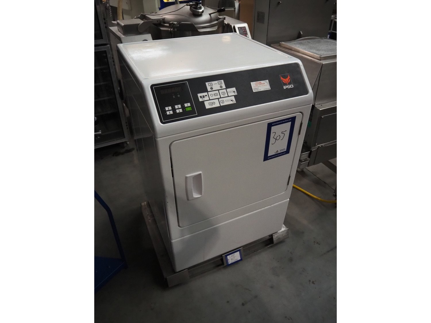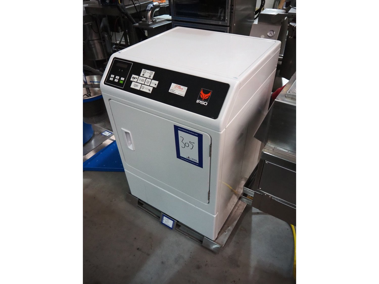 IPSO dryer, model: CD10, serial number: 1903034601, 400 V, 3 Ph, 50 Hz, 9.5 A, 5300 W, maximum capacity: 8.2 kg, dimensions: 700 mm x 700 mm x 1050 mm.