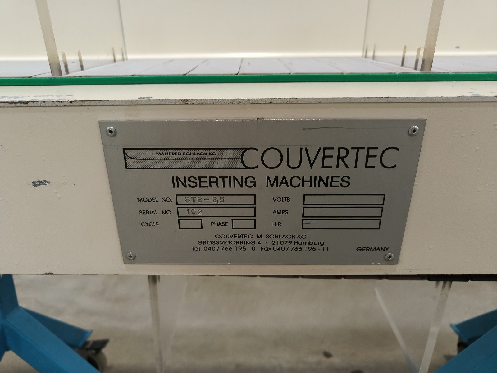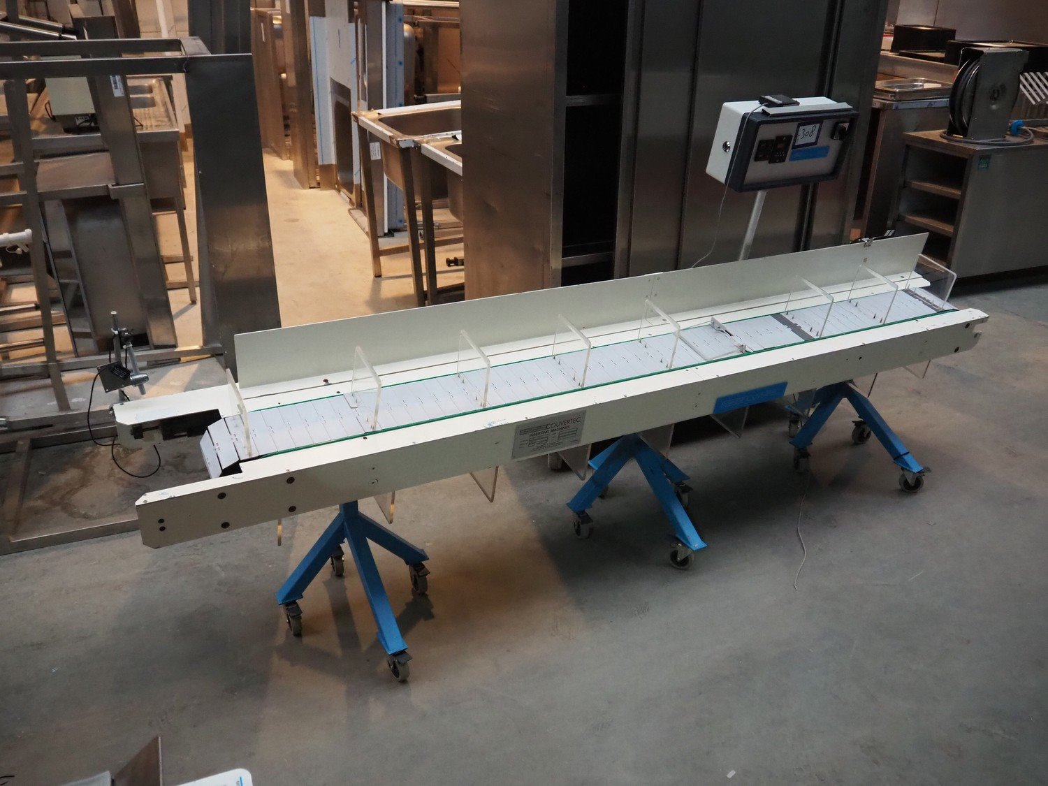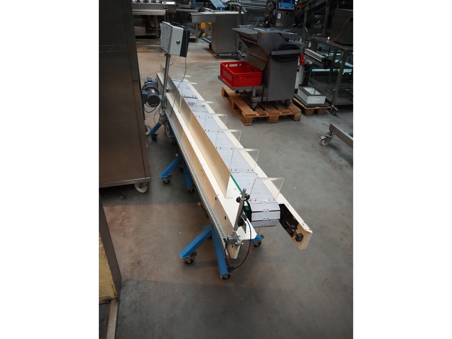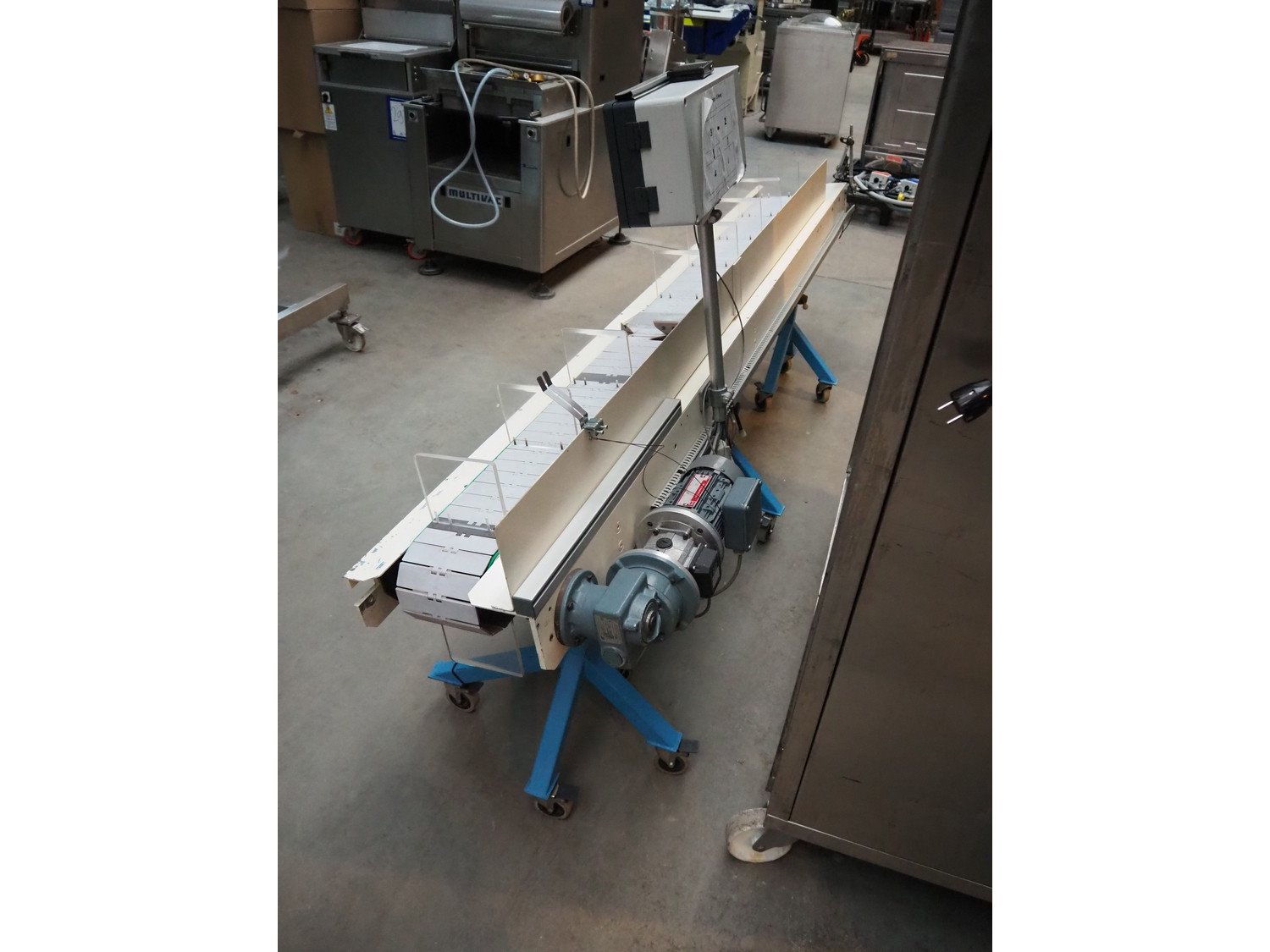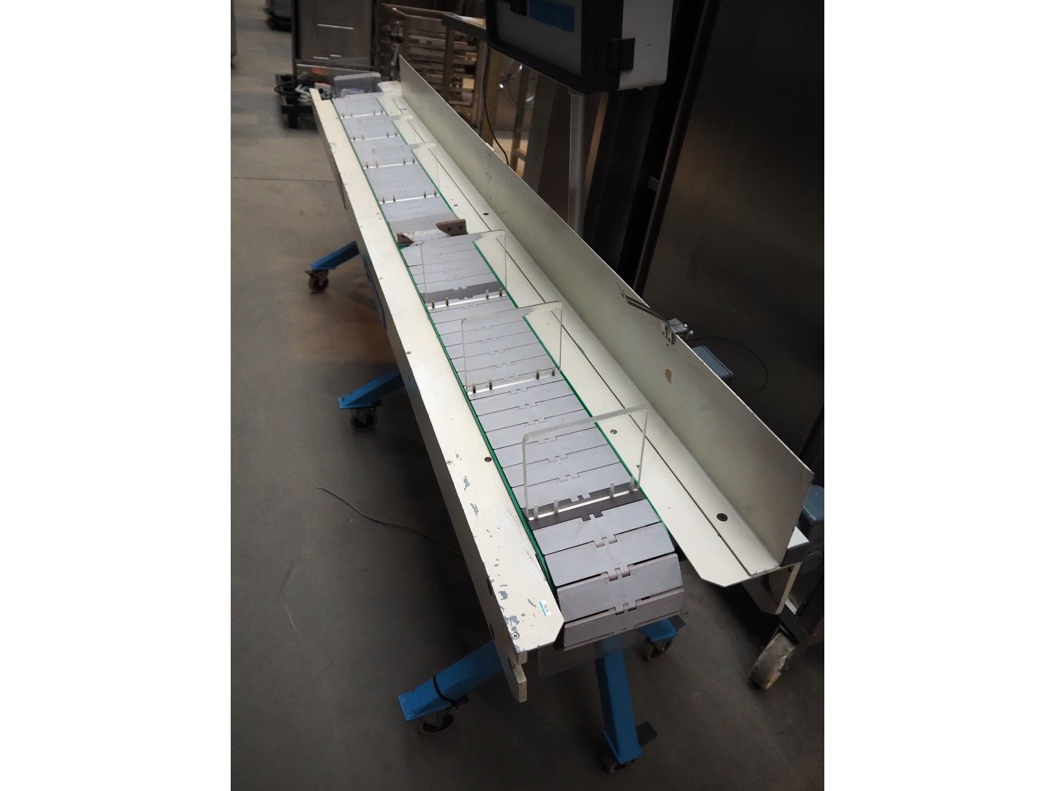 Courvertec transport belt, model: STB-2.5, serial number: 102, plastic belt with dividers, belt width: 150 mm, distance between dividers: 250 mm, total dimensions: 2550 mm x 550 mm x 1260 mm.