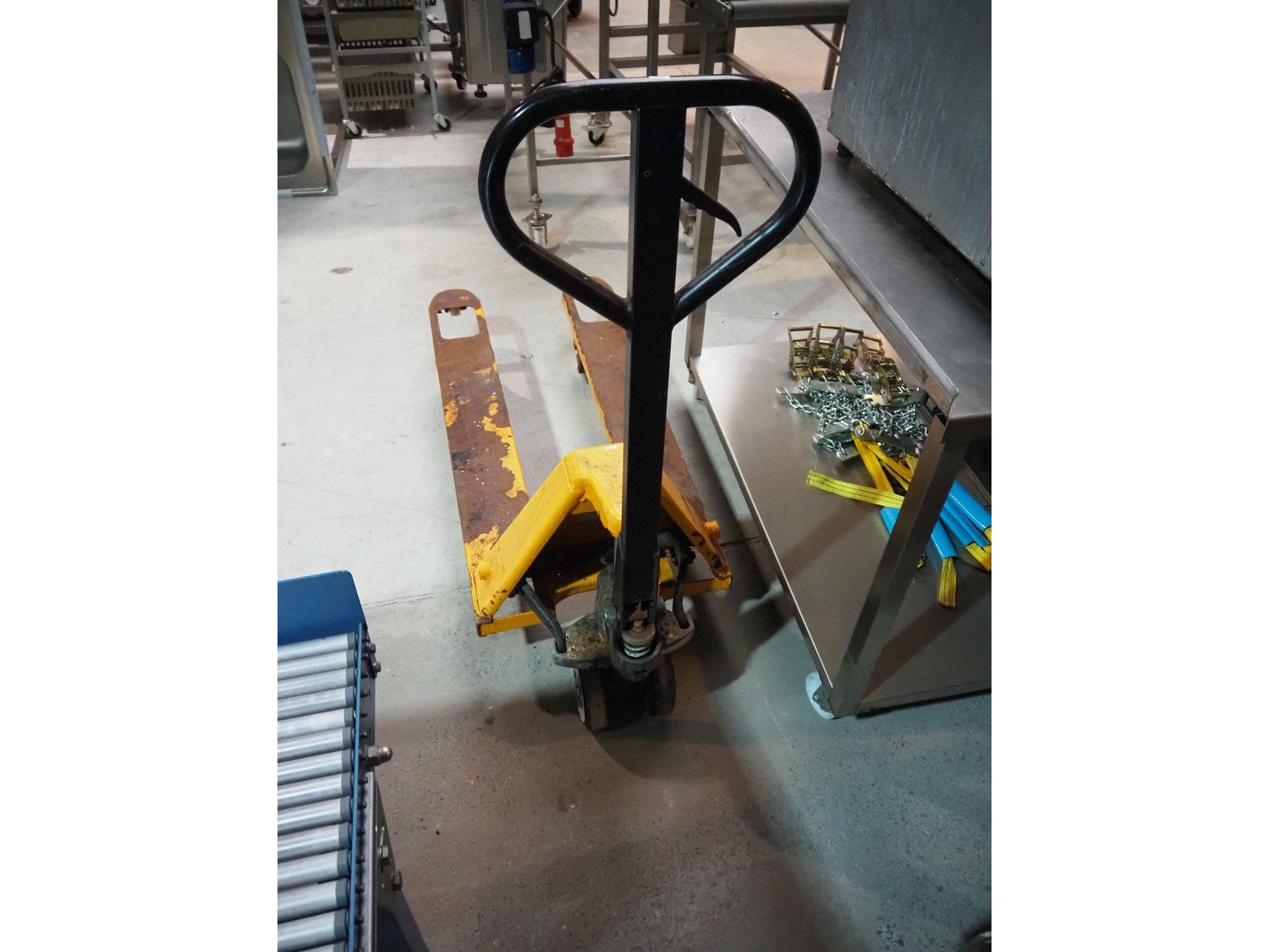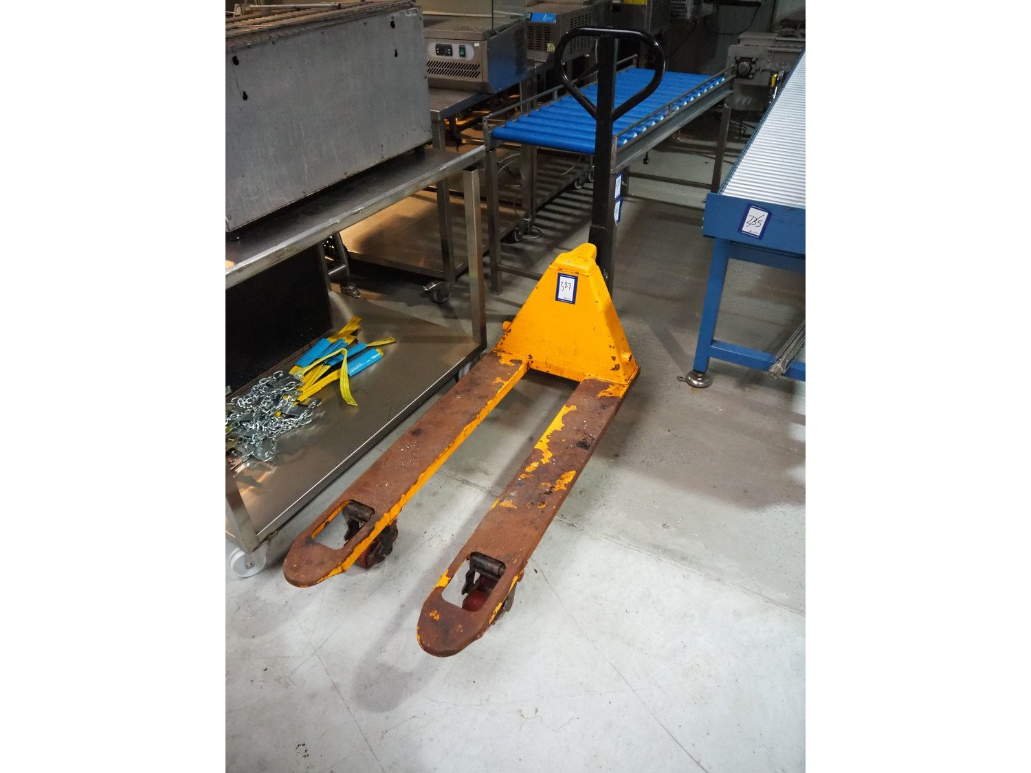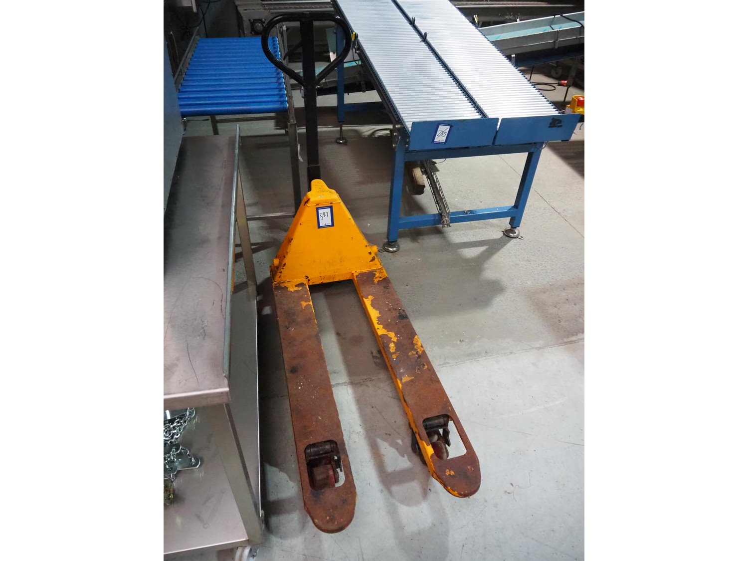 AC-Hand pallet lifter, serial number: 12011395-7/104, year of construction: 2012, capacity: 2500 kg, fork width: 540 mm, fork length: 1150 mm, total dimensions: 1550 mm x 550 mm x 1250 mm. Defect.