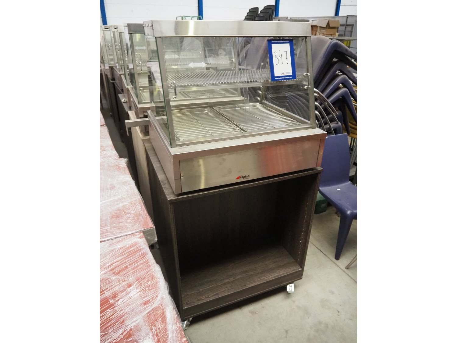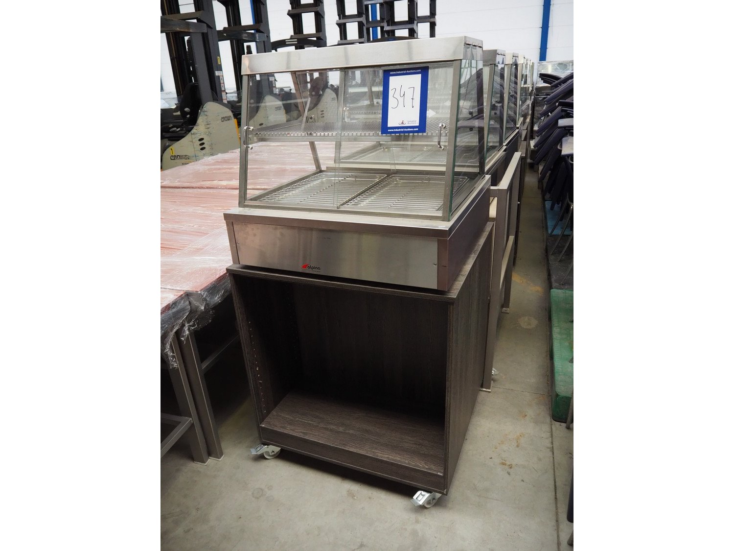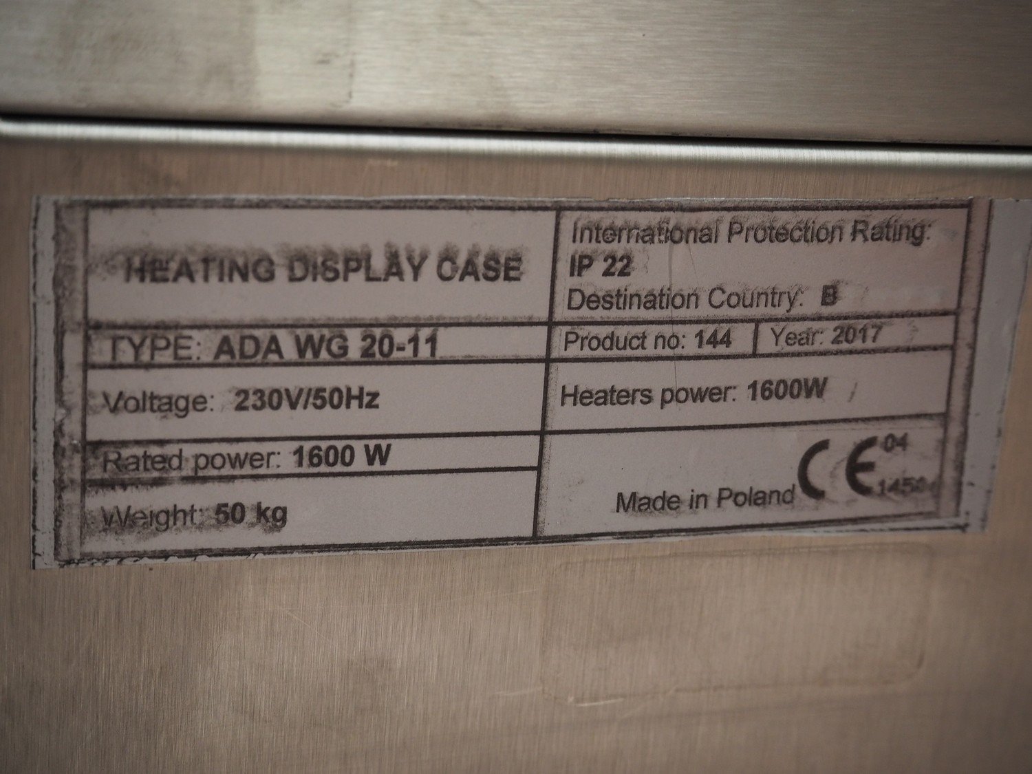 Alpina heated showcase, type: ADA WG 20-11, number: 144, year of construction: 2017, 230 V, 50 Hz, 1600 W, 50 kg, total dimensions: 800 mm x 750 mm x 1760 mm.