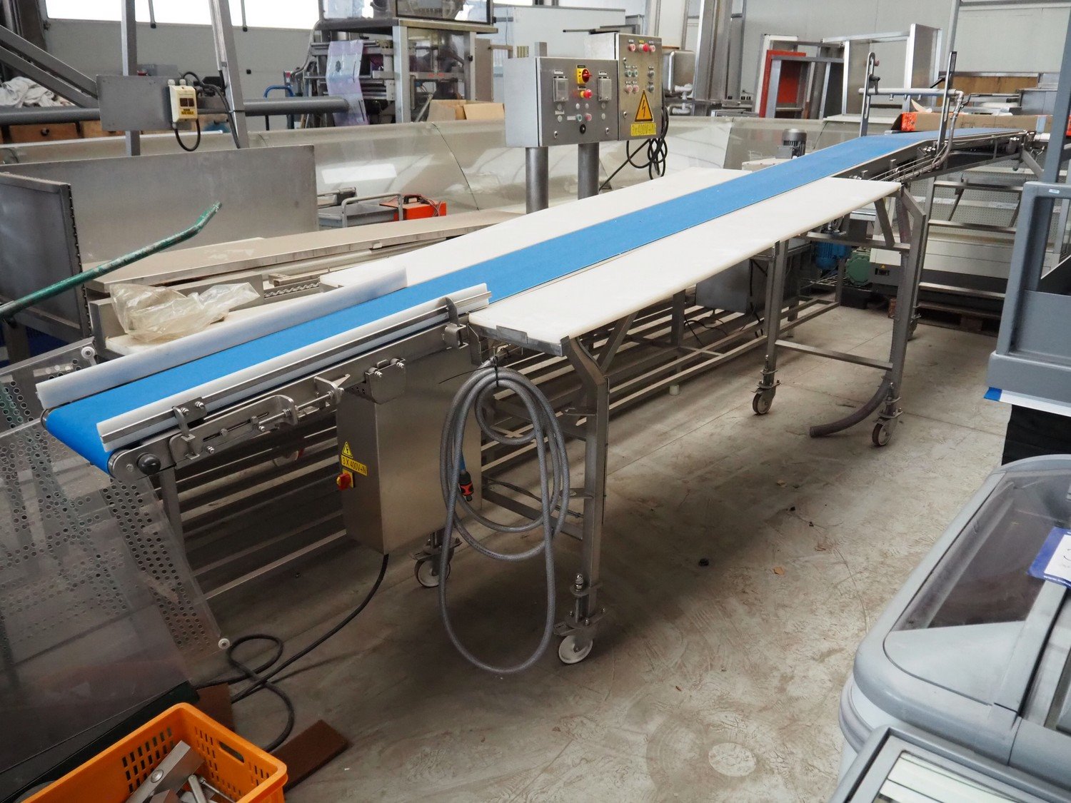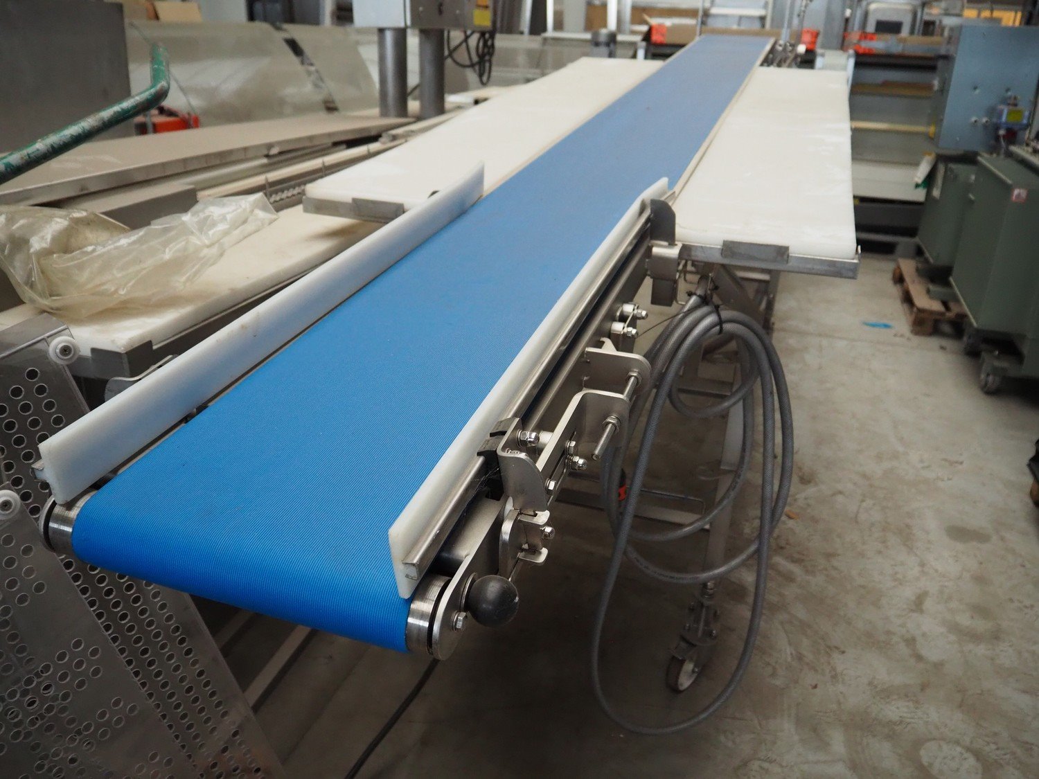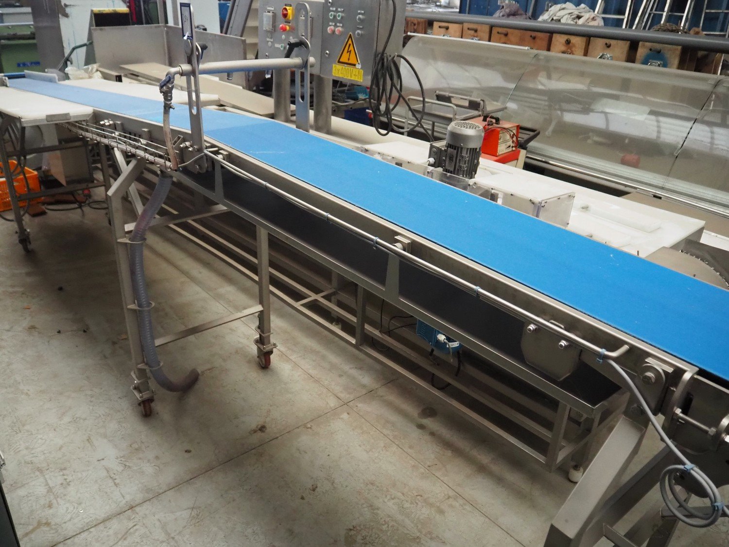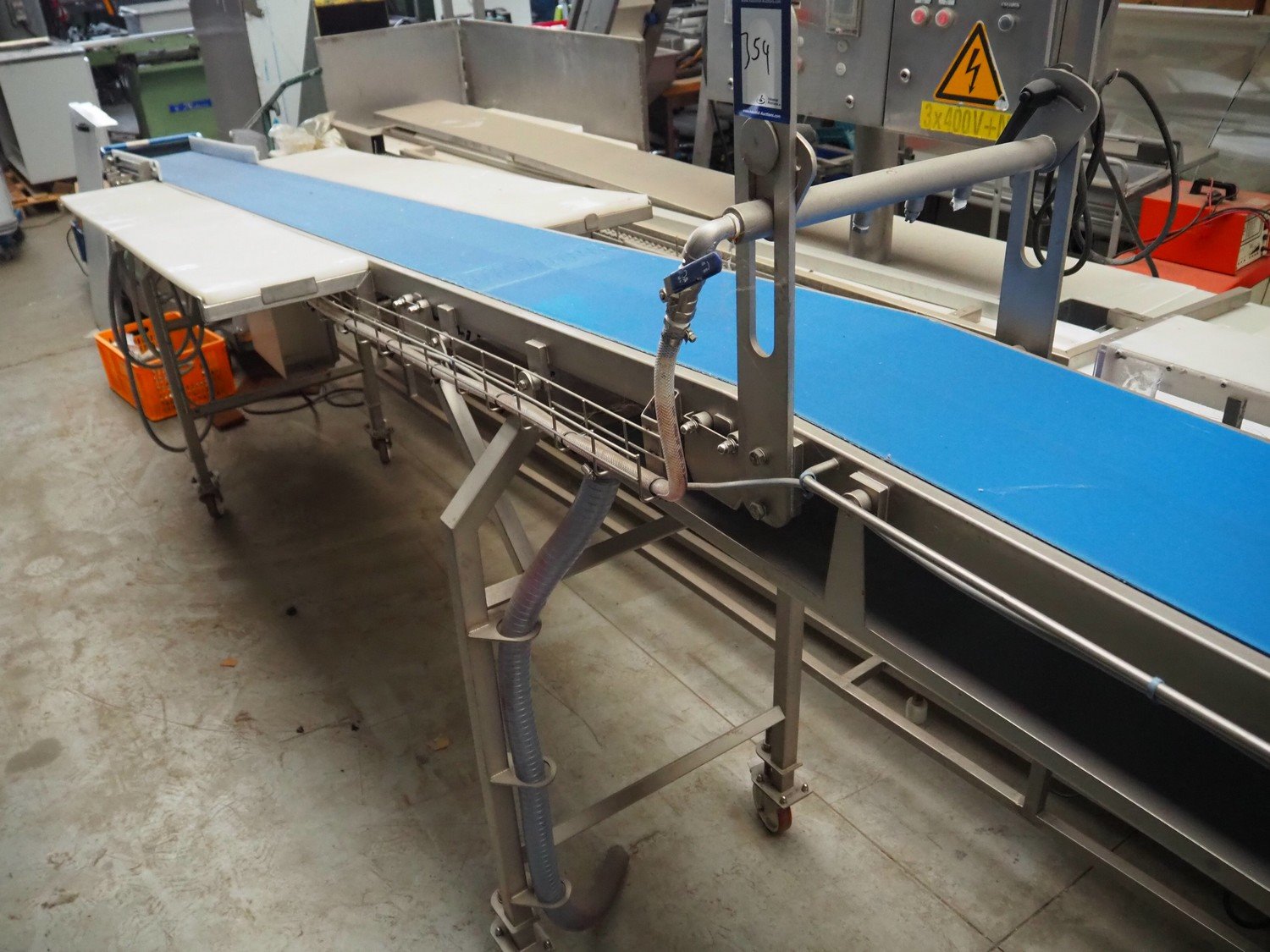 IC-S mobile elevating belt with spray unit, plastic belt, belt width: 300 mm, elevating height from 1000 mm to 1400 mm, total dimensions: 6000 mm x 950 mm x 1800 mm.