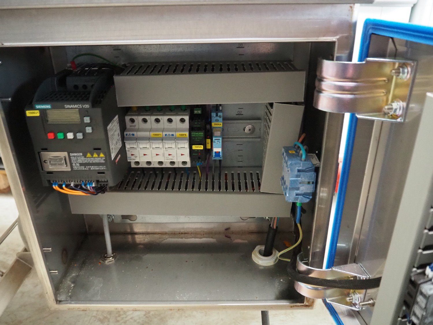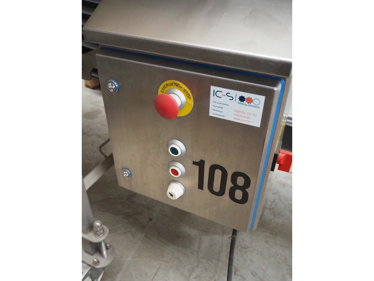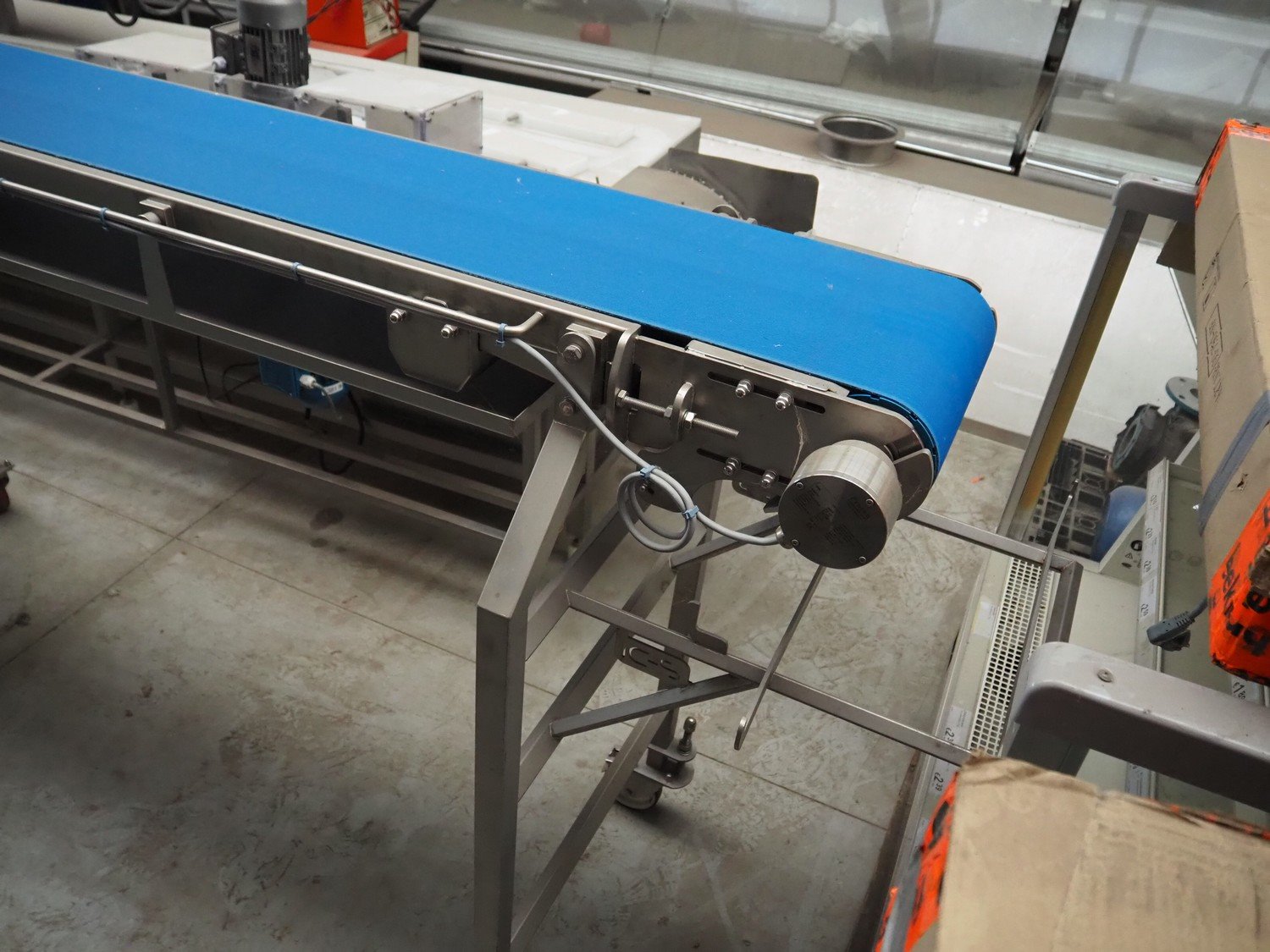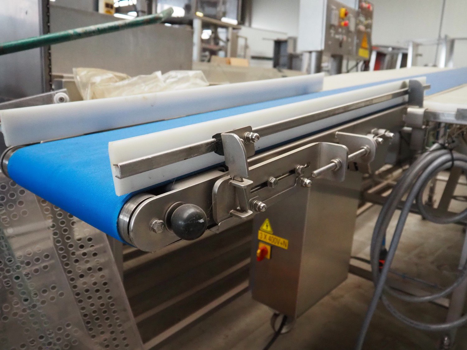 IC-S mobile elevating belt with spray unit, plastic belt, belt width: 300 mm, elevating height from 1000 mm to 1400 mm, total dimensions: 6000 mm x 950 mm x 1800 mm.