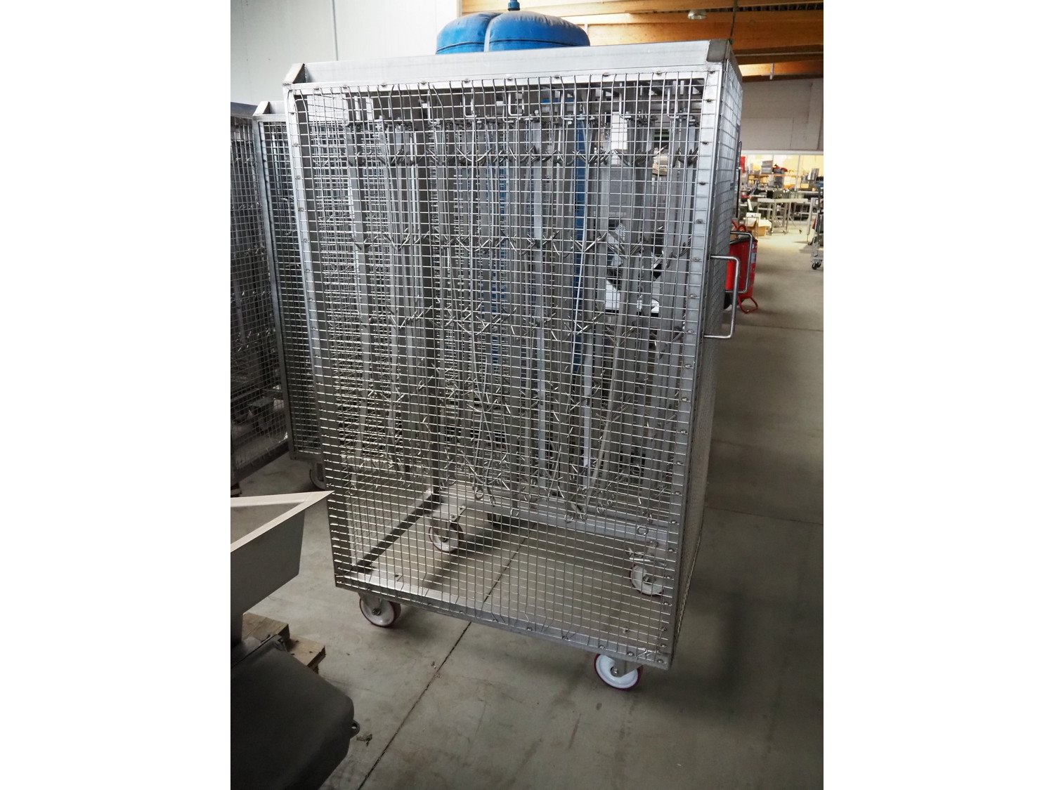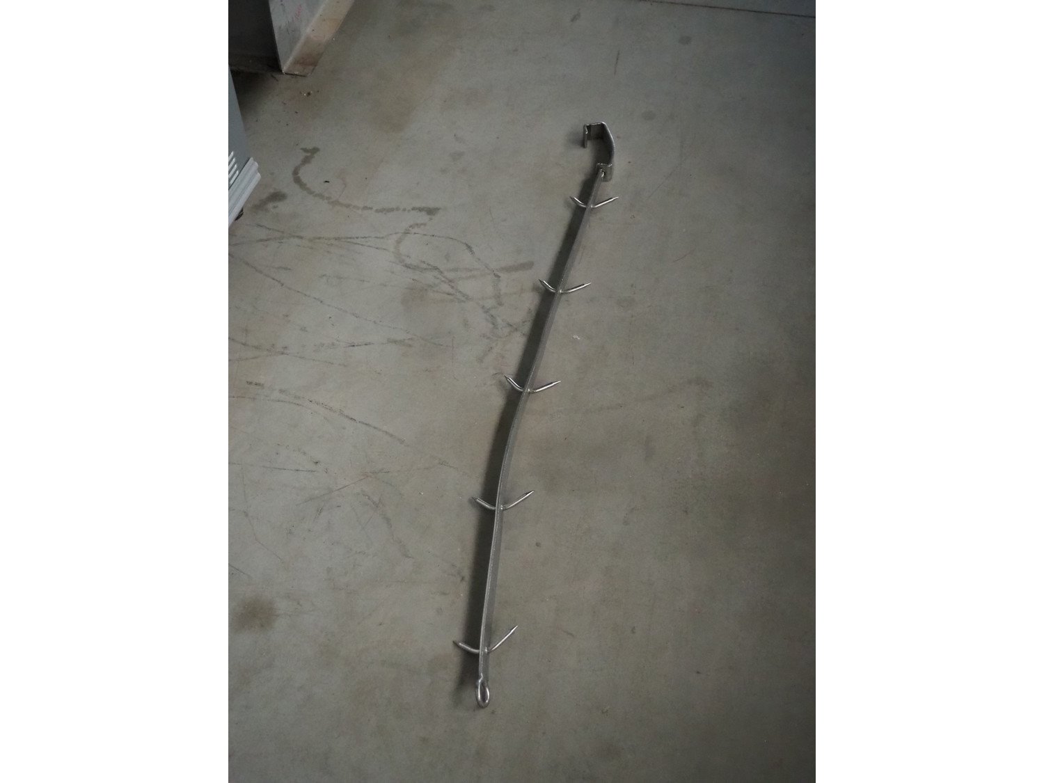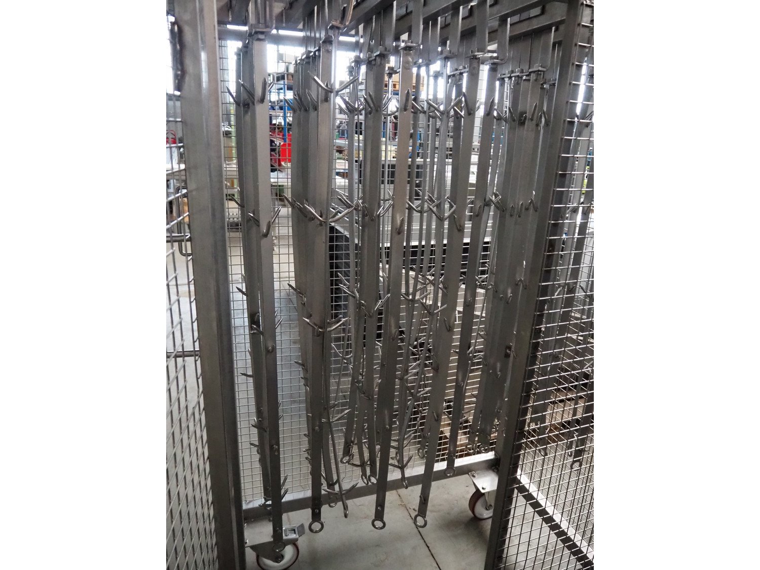 S/s trolley with large amount of meat hooks, meat hook length: 1300 mm, trolley dimensions: 800 mm x 1220 mm x 1990 mm.