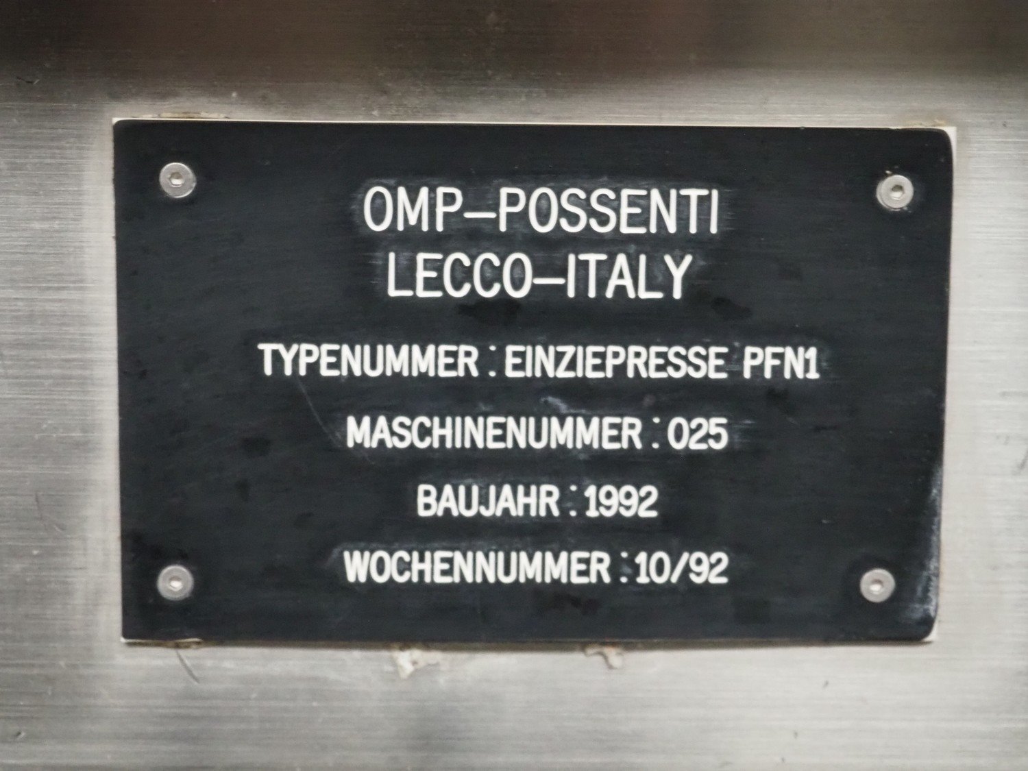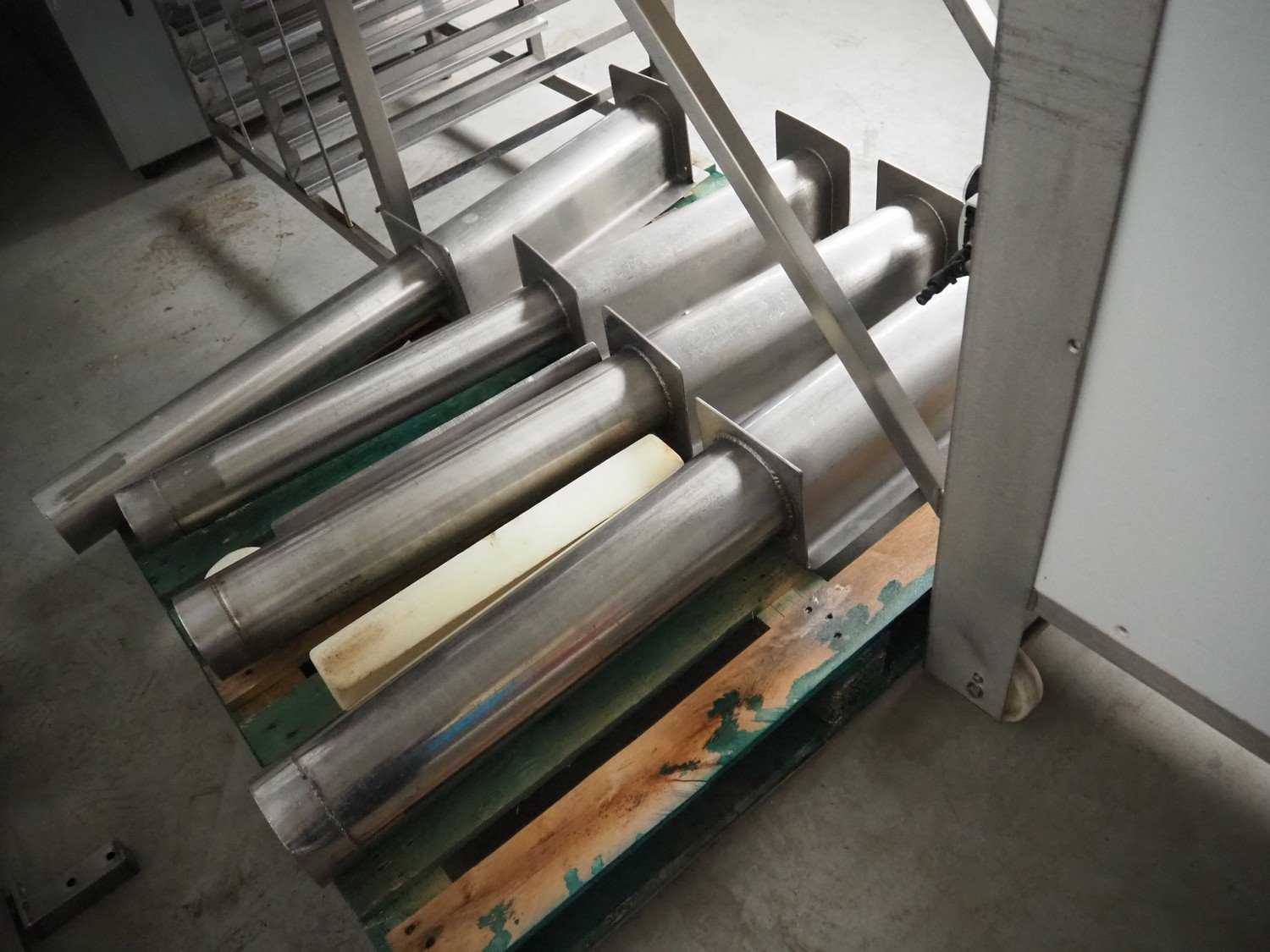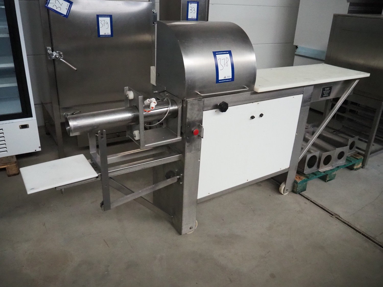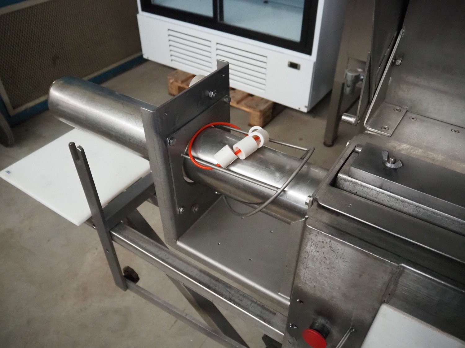 OMP-Possenti mobile meat press, type: Einziepresse PFN1, machine number: 025, year of construction: 1992, with 4 pipes, pipe diameter: 90 mm, 100 mm, 110 mm, 130 mm, total dimensions: 2900 mm x 550 mm x 1500 mm.