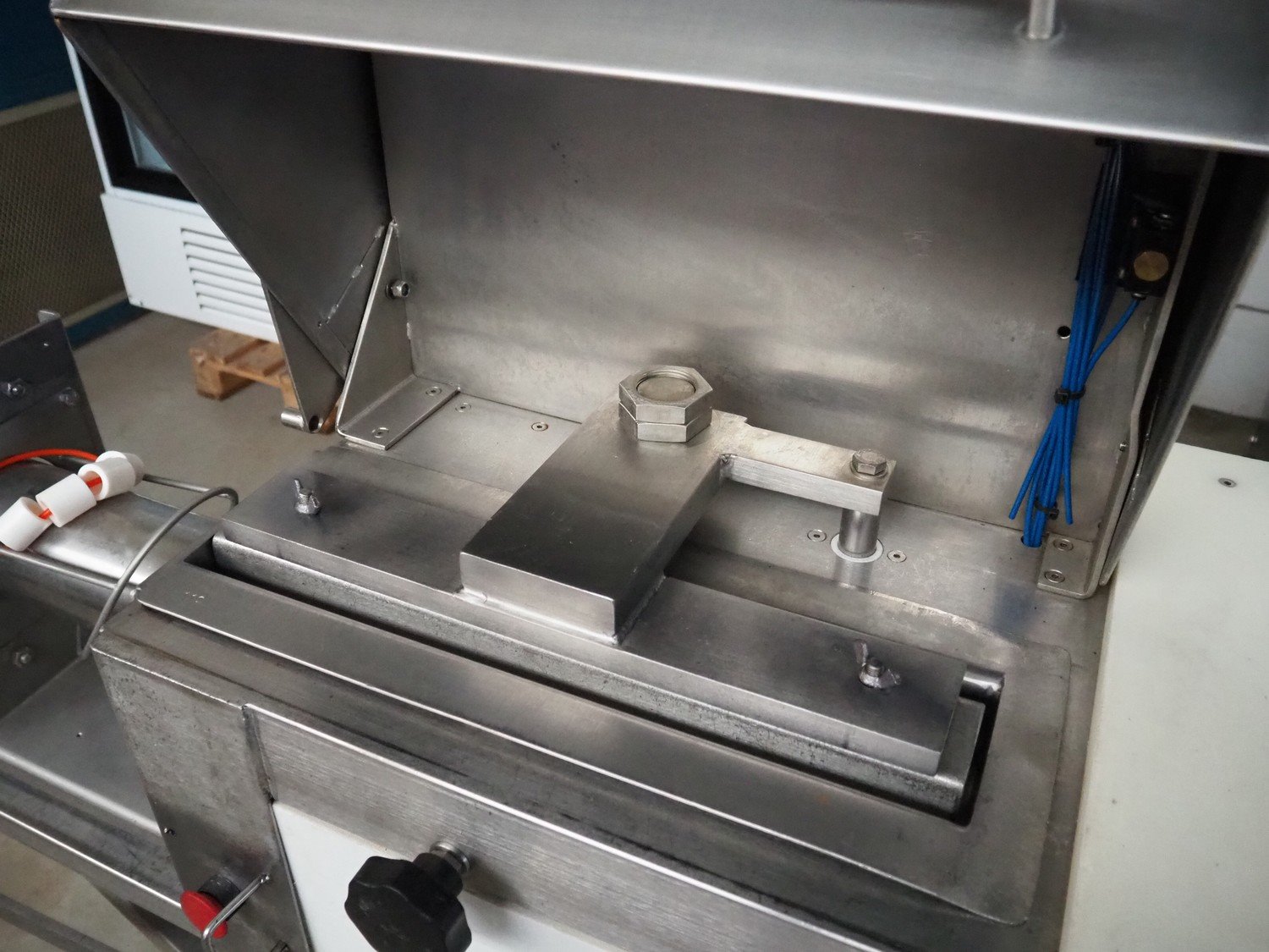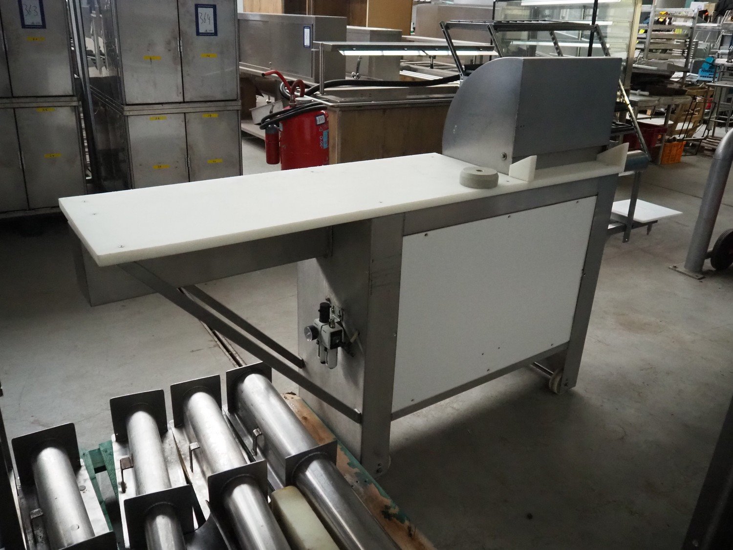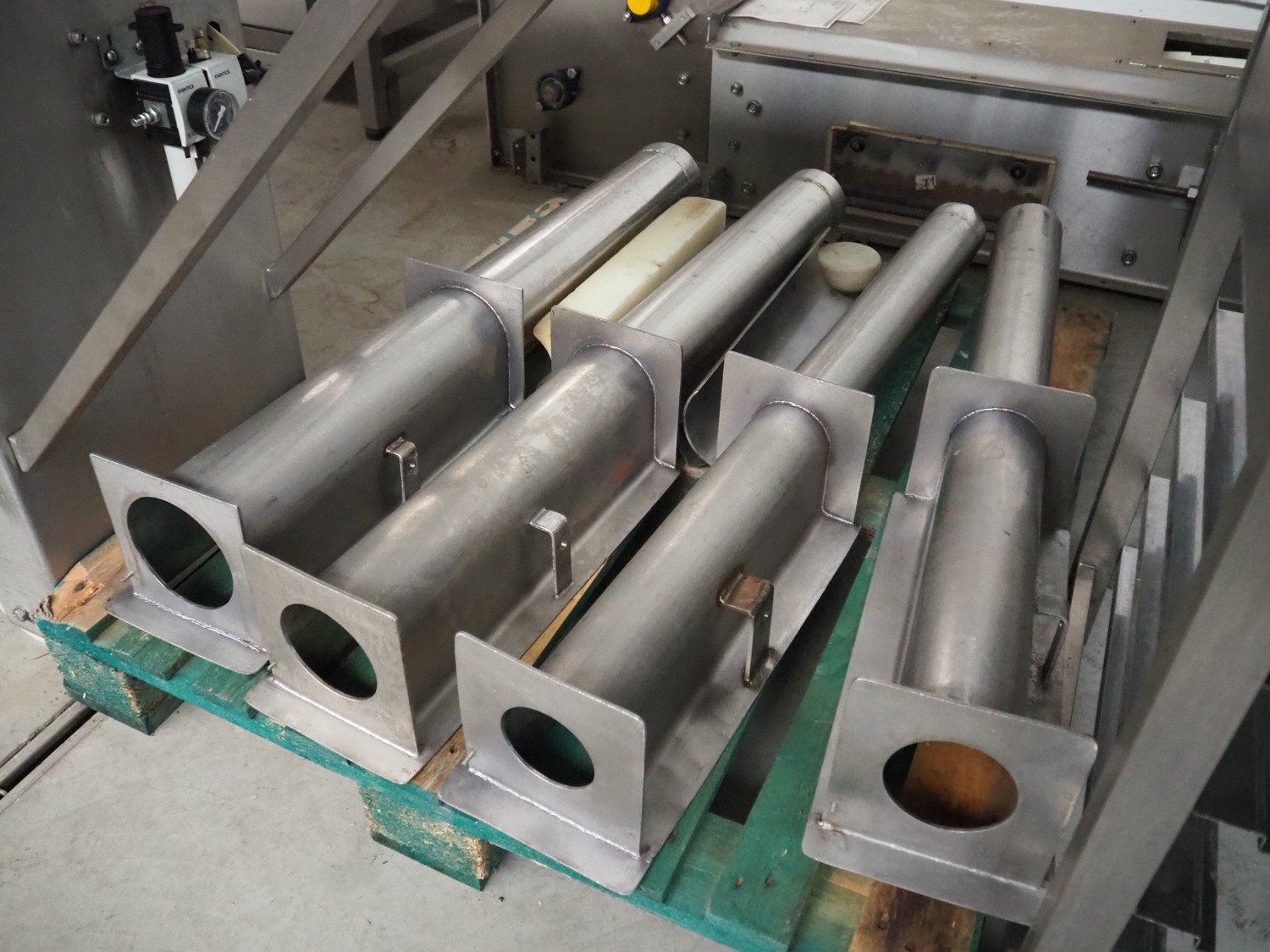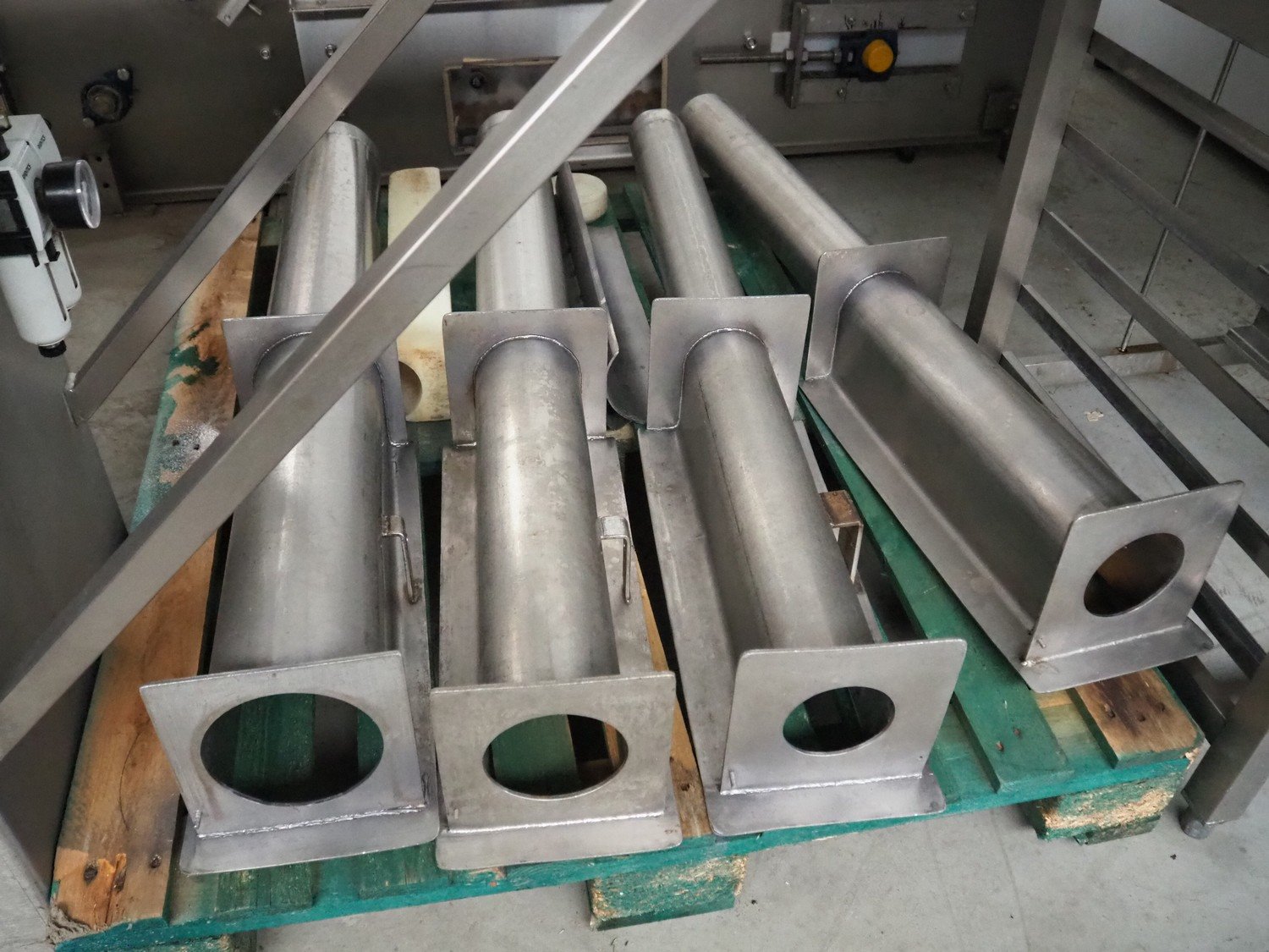 OMP-Possenti mobile meat press, type: Einziepresse PFN1, machine number: 025, year of construction: 1992, with 4 pipes, pipe diameter: 90 mm, 100 mm, 110 mm, 130 mm, total dimensions: 2900 mm x 550 mm x 1500 mm.