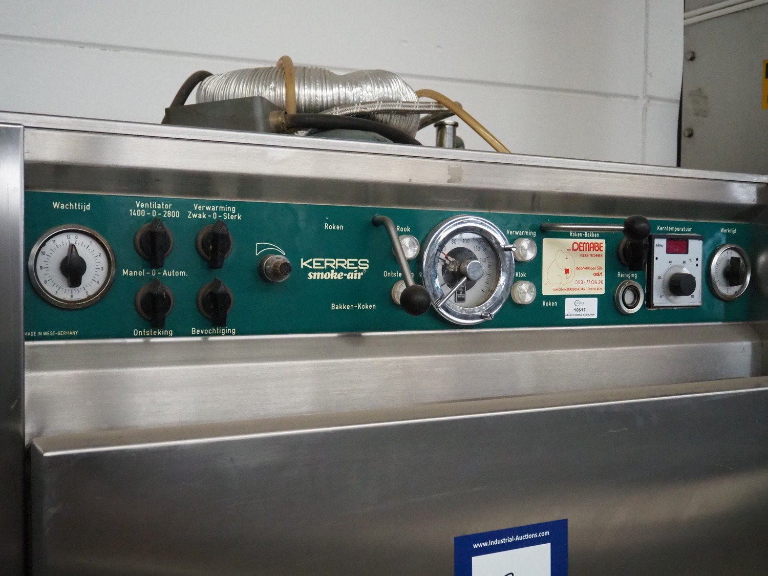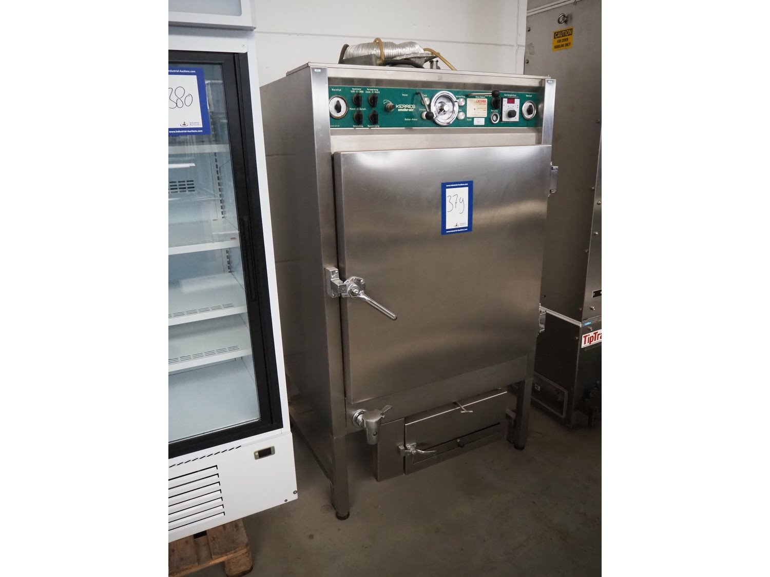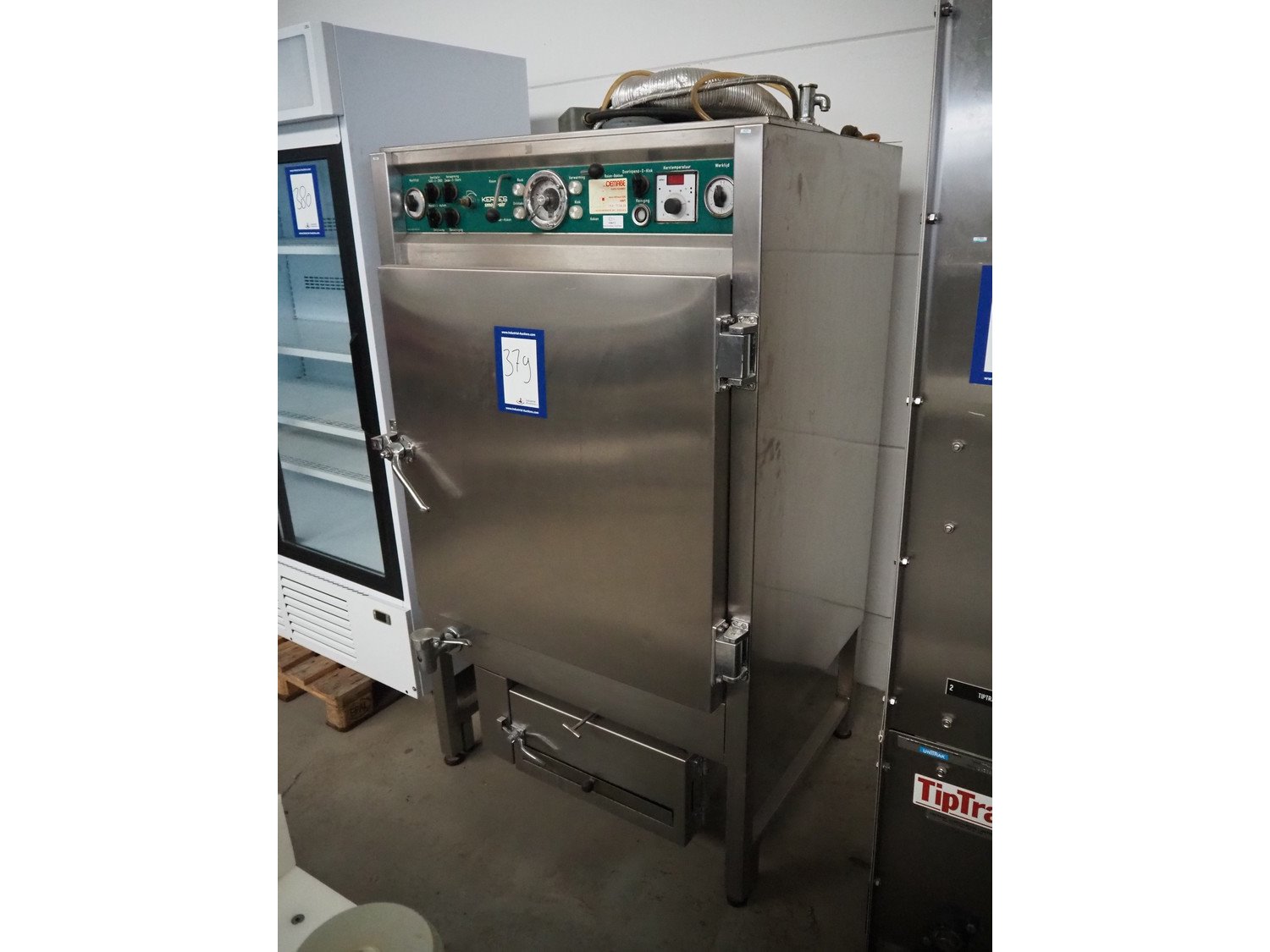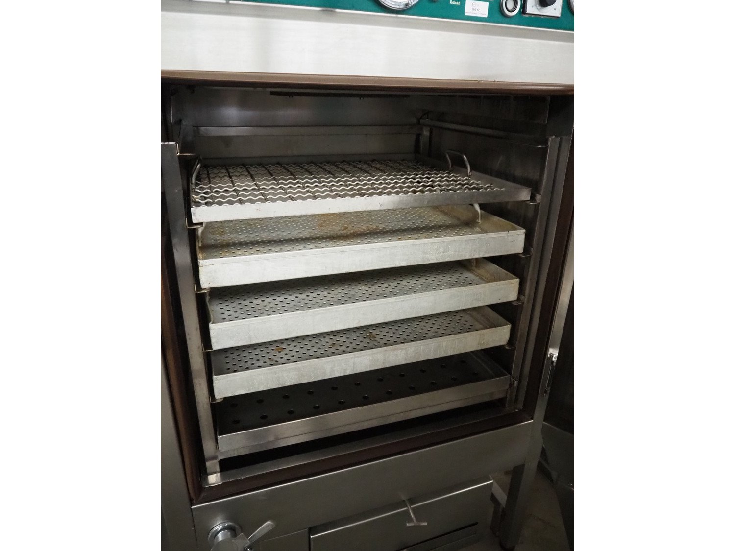 Kerres smoking, cooking and frying chamber with smoke generator for wood chips, type: 0S 700 o1, serial number: 09.0323, year of construction: 09.89, 380 V, 50 Hz, 6 floors, dimensions floor: (6x) 700 mm x 800 mm, total dimensions: 1060 mm x 920 mm x 1800 mm.