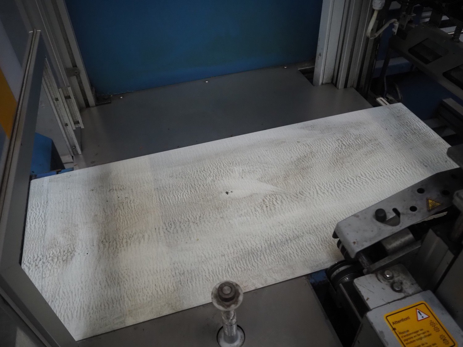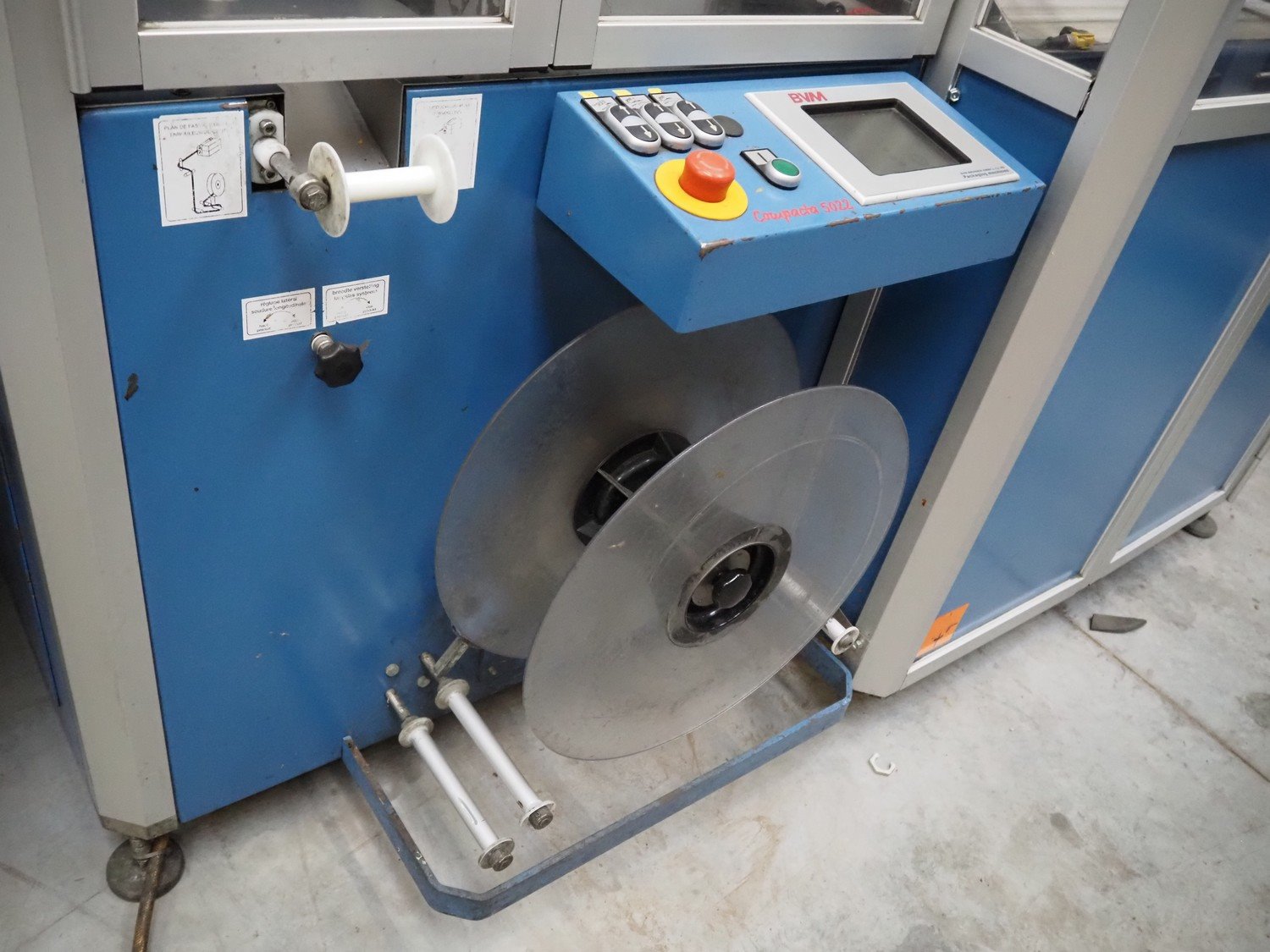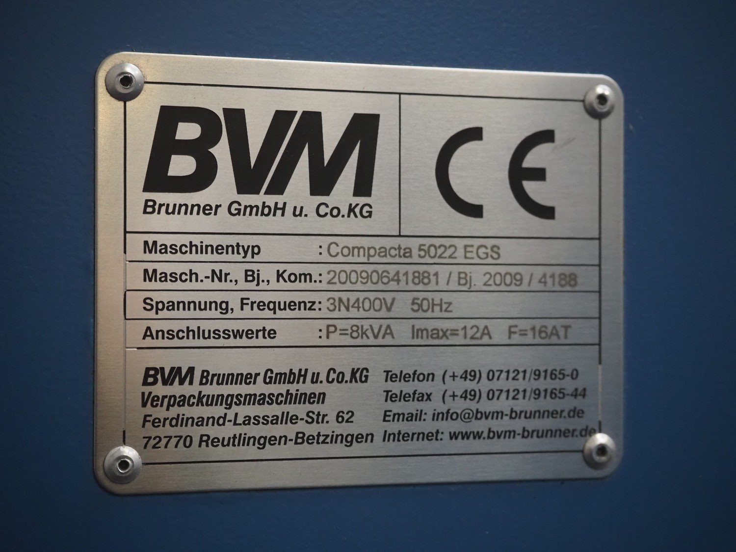 BVM Brunner GmbH u. Co.KG film packaging machine, type: Compacta 5022 EGS, number: 20090641881, year of construction: 2009, 400 V, 3 Ph, 50 Hz, 8 kvA, plastic belt, belt width: 400 mm, knife width: 560 mm, total dimensions: 2600 mm x 1800 mm x 1800 mm.