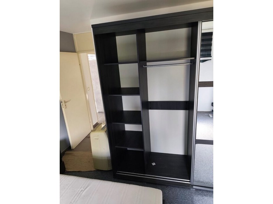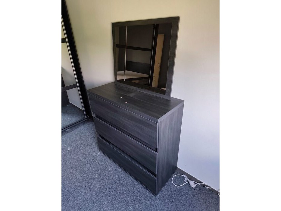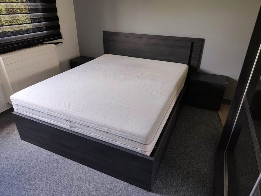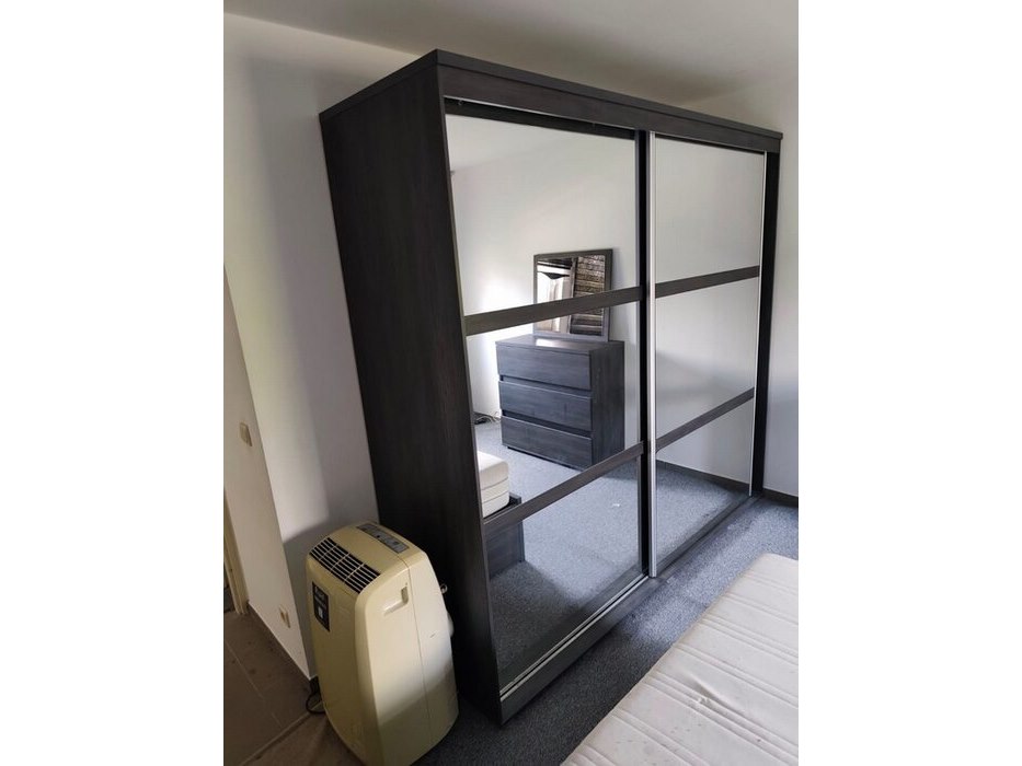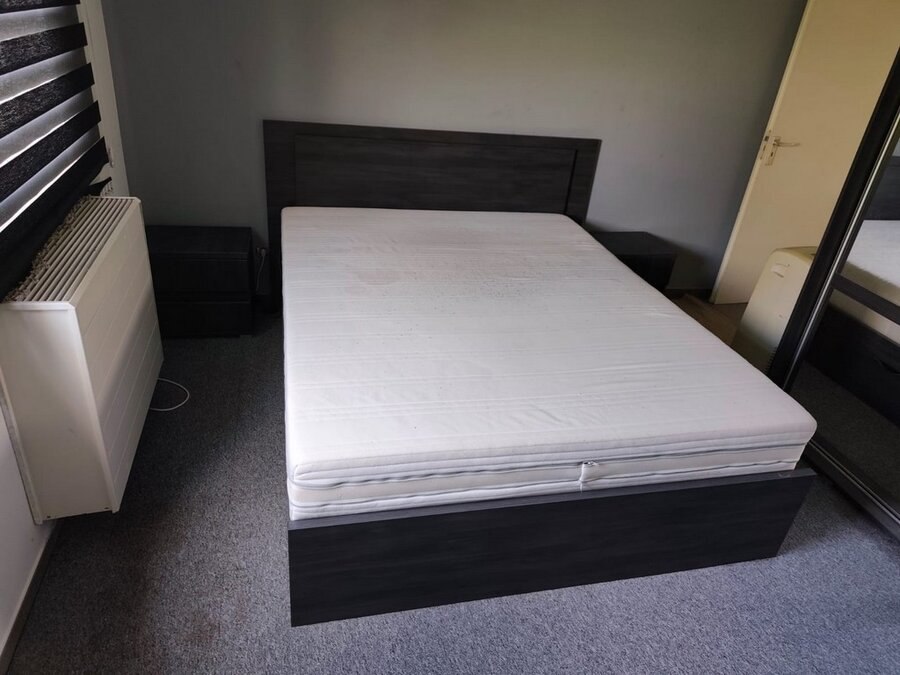 Donker bruin tweepersoonsslaapkamer bestaande uit tweepersoonsbed, 2 nachttafels, commode 3 laden, kleerkast 2 schuifdeuren met spiegel