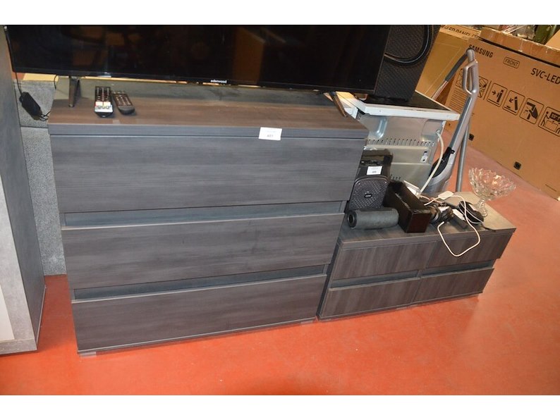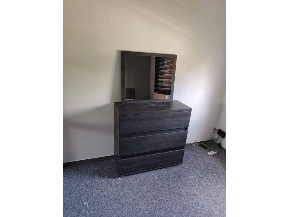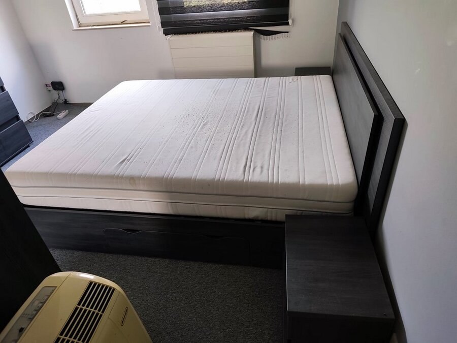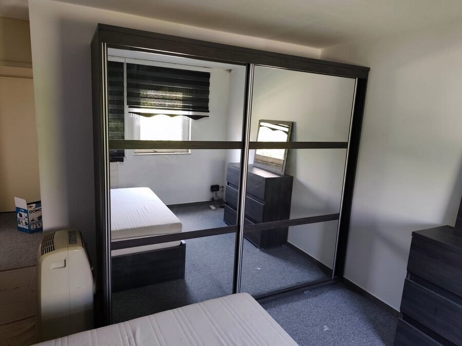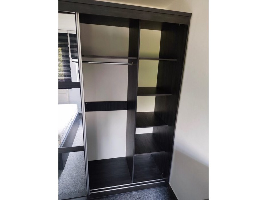 Donker bruin tweepersoonsslaapkamer bestaande uit tweepersoonsbed, 2 nachttafels, commode 3 laden, kleerkast 2 schuifdeuren met spiegel